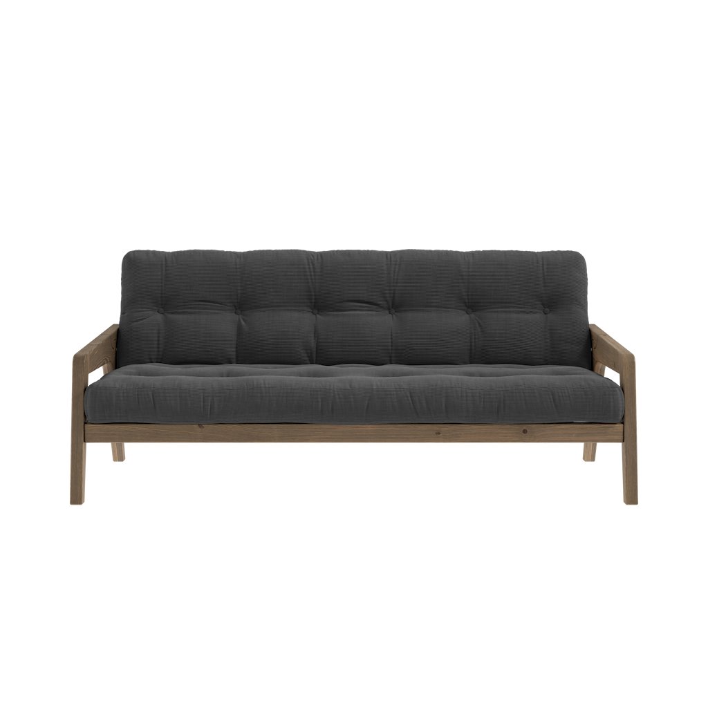 Stylová rozkládací pohovka GRAB od výrobce nábytku a pohovek KARUP DESIGN. Pohovka je dodávána z vysoce kvalitního borovicového dřeva s certifikací FSC ve tmavém provedení a výplní futonové matrace z pěny, kterou pokrývá polyesterový povlak v tmavě šedé barvě. Moderní design, precizní zpracování a elegantní nohy dodávají pohovce GRAB styl i funkčnost, kterou od rozkládací pohovky očekáváte. Délka 204 cm zajišťuje že se na pohovku vejdou až 3 osoby. Při snadném rozložení získáte místo na spaní s rozměry až 204x130 cm, což zajistí dostatečný prostor pro přespání vaší návštěvy.