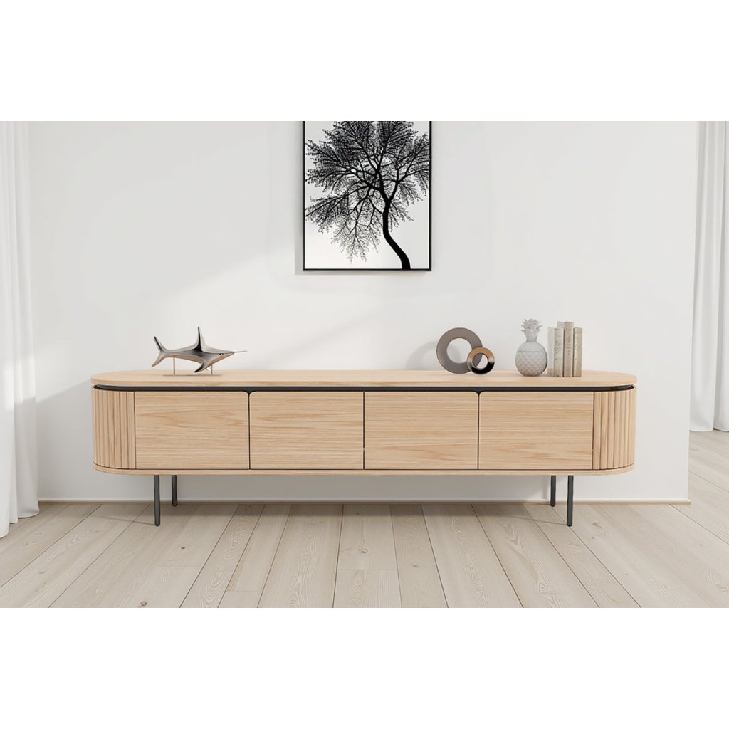 Designový TV stolek ATELIER od německé značky designového nábytku INVICTA. Stolek je opravdu nádherný výrobek z dubového dýhy ve světlém provedení divokého dubu. Nohy stolku jsou pak z černého kovu. TV stolek má 4 dvířka, za nimi 4 police na uložení elektroniky. Boky jsou zaoblené s jednotlivým tenkým žebrováním. To z něj dělá nádherný, designový a unikátní produkt. K dostání i v 2 menších variantách.