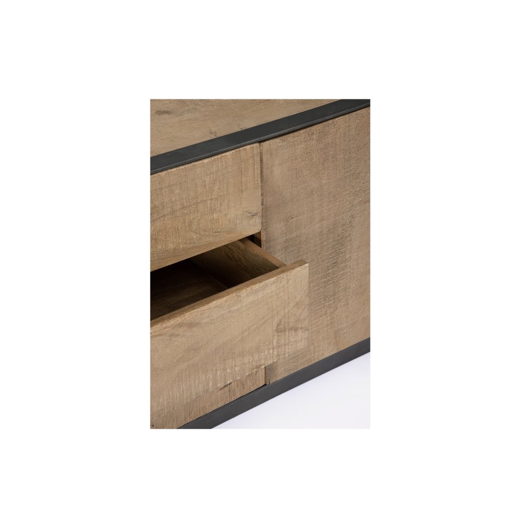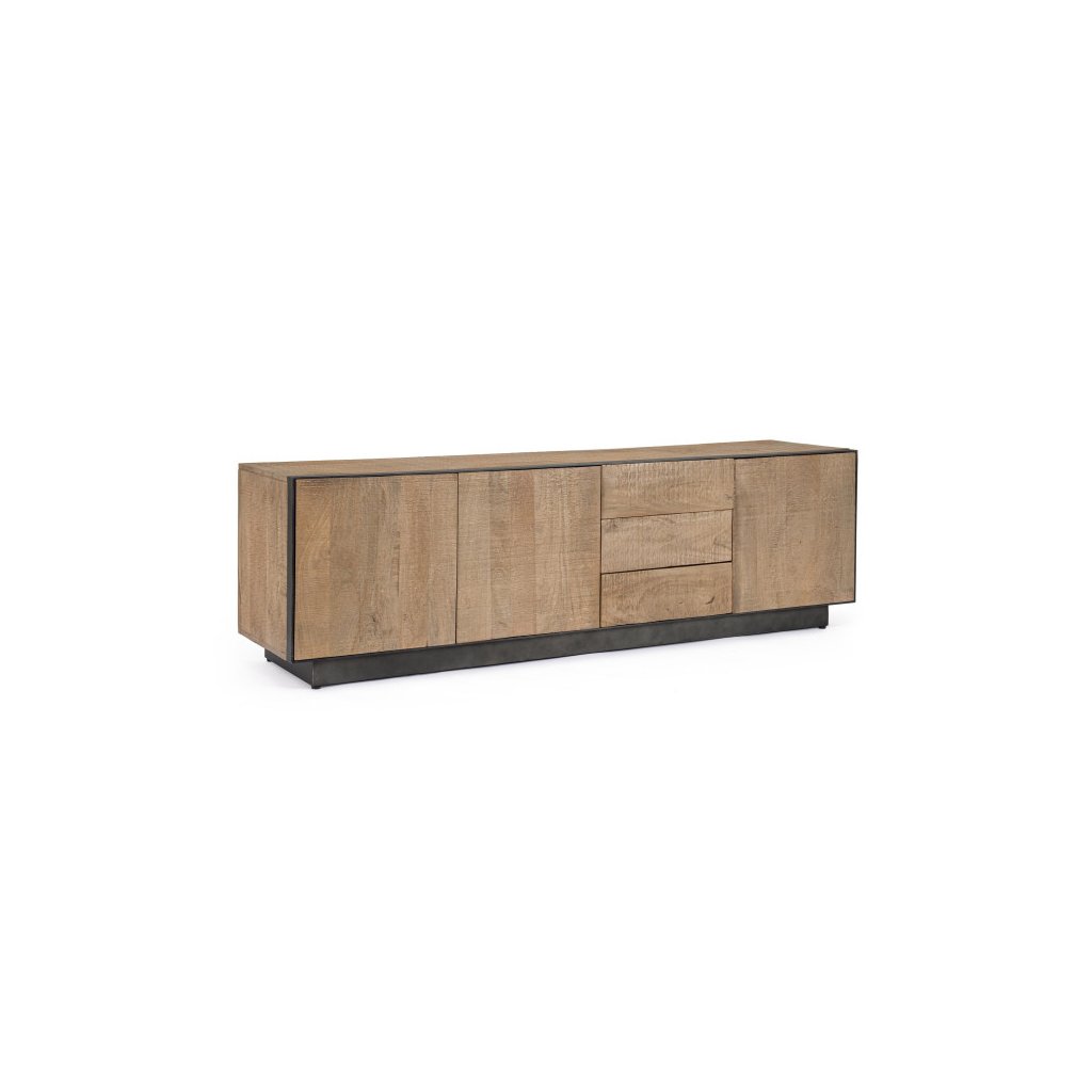 Designový TV stolek HAROLD od italské firmy stylového nábytku BIZZOTTO. HAROLD je elegantní a praktický úložný kus, který kombinuje kvalitní mangové dřevo s kovovými detaily. Konstrukce je ošetřena barvou na vodní bázi, což zvýrazňuje přirozenou kresbu dřeva a zároveň zajišťuje ekologicky šetrné zpracování. Přední profil a nohy jsou z epoxidové oceli s práškovým nástřikem, které dodávají stolku moderní industriální vzhled. Dvířka a zásuvky jsou vybaveny panty s tichým dovíráním, takže manipulace s nimi je komfortní a bezhlučná.