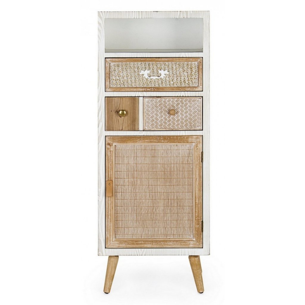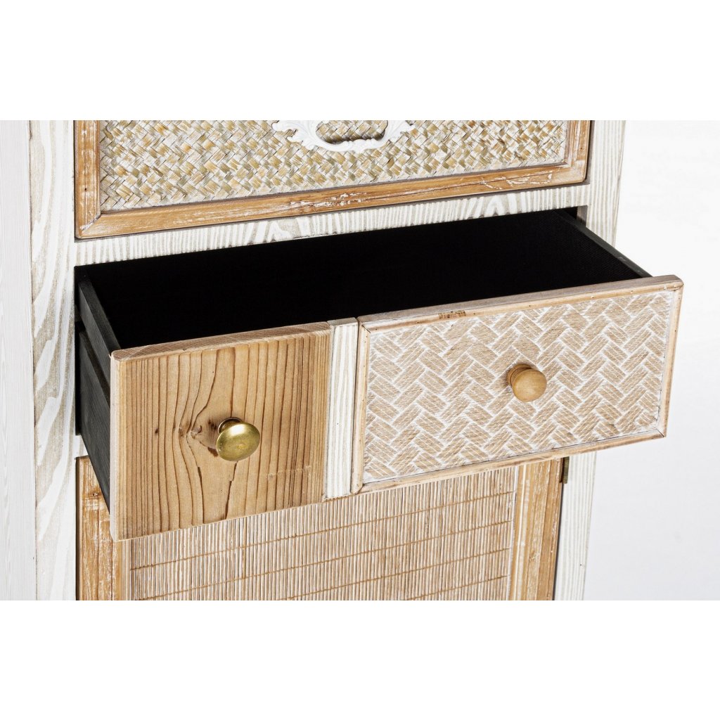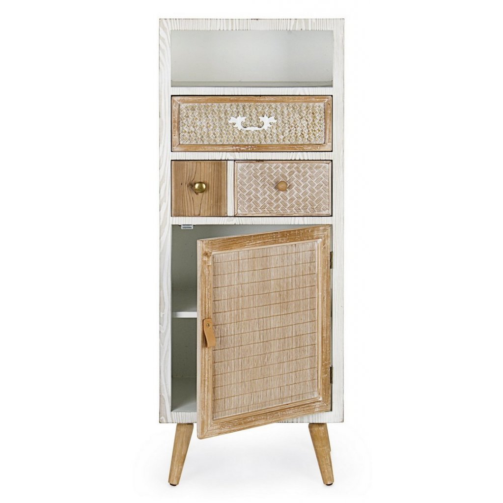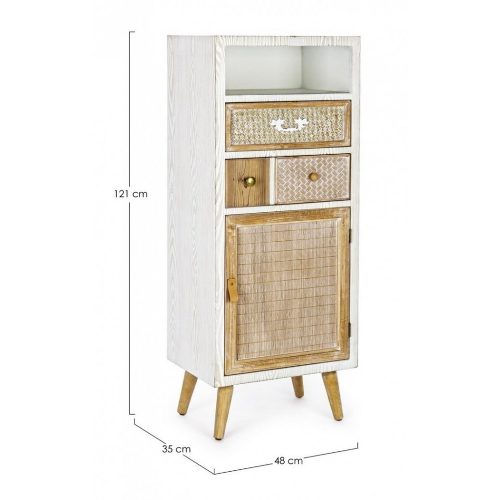 Designová komoda ELOISE od italského výrobce stylového nábytku BIZZOTTO. Komoda má 4 světlé dřevěné nohy z jedlového dřeva, které zajišťují maximální nosnost, robustnost a stabilitu. Na nich je postavena samotná komoda ELOISE s rámem a kostrou z bílé mdf dřevovláknité desky. Na přední části jsou 3 rozdílné zásuvek a skříňky pro uložení potřebných věcí. Zásuvky jsou pokryty ratanovým nebo bambusovým zdobením. Otevírají se pomocí kovových úchytů. Velmi zajímavý, prostorný a krásný kousek stylového nábytku udělá radost každému milovníkovi nevšedního nábytku.