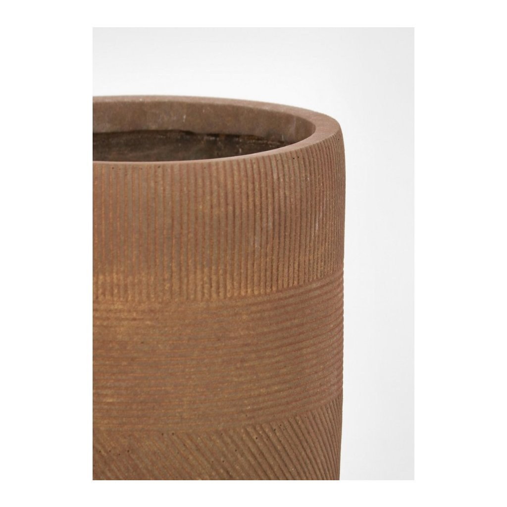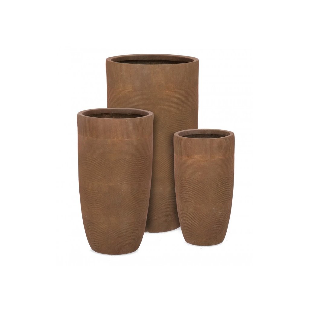Set 3 venkovních květináčů RIGO od italské firmy stylového nábytku BIZZOTTO ze směsi skleněného vlákna a jílu v hnědé barvě.
