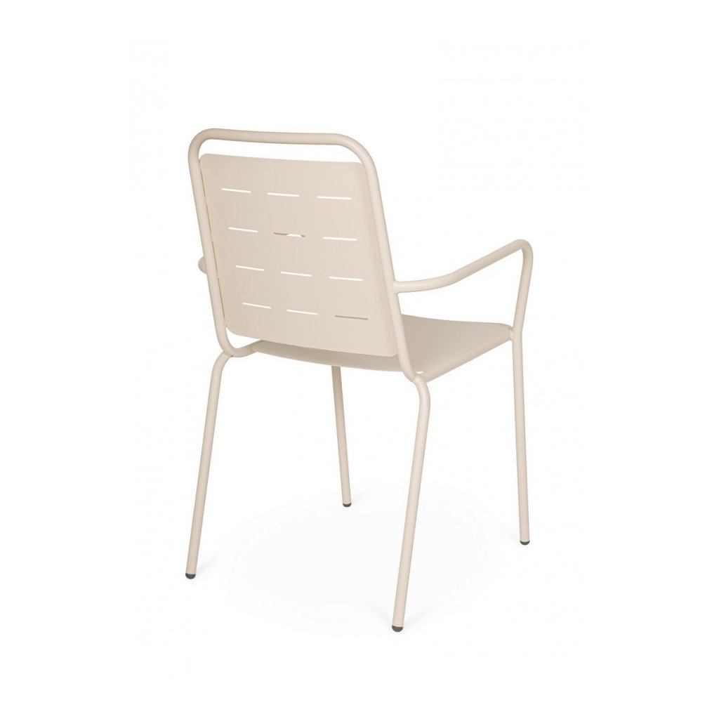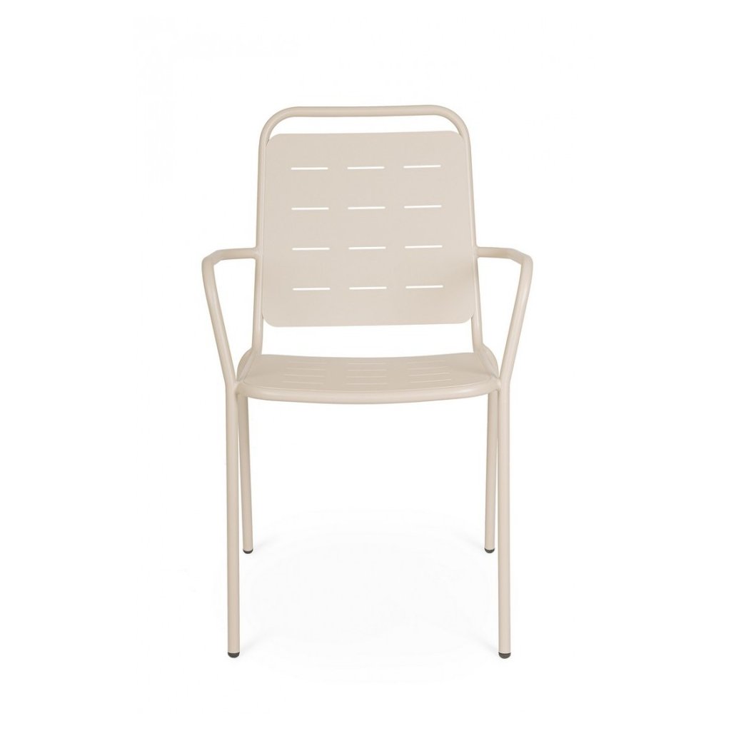 Designová venkovní kovová židle YARA od italského výrobce stylového nábytku BIZZOTTO. Židle je kompletně vyrobena z pevné oceli a skládá se z konstrukce, kterou tvoří tenké nohy, které přecházeji i v područky. Sedák i opěradlo tvoří tenké kovové pláty s mezerou uprostřed, což vytváří velmi zajímavý styl židle. Vše ošetřeno krásnou světle šedou práškovou barvou. Židle jsou plně stohovatelné, takže je na zimu můžete uklidit a zaberou minimum místa.