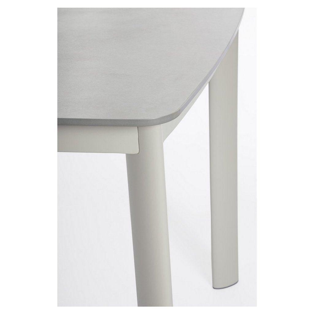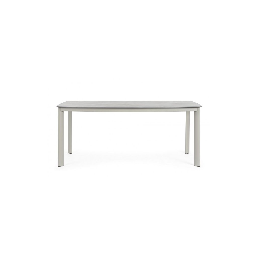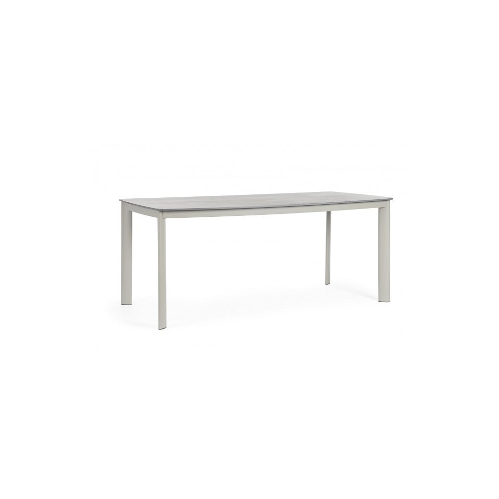 Nádherný zahradní stůl ALCORA od italského výrobce stylového nábytku BIZZOTTO. Krásný a jednoduchý stůl má základnu a čtyři nohy z práškovaného hliníku v šedém provedení. Hranatá deska stolu je z přírodního kamene, který je zpracovaný za vysokých teplot.