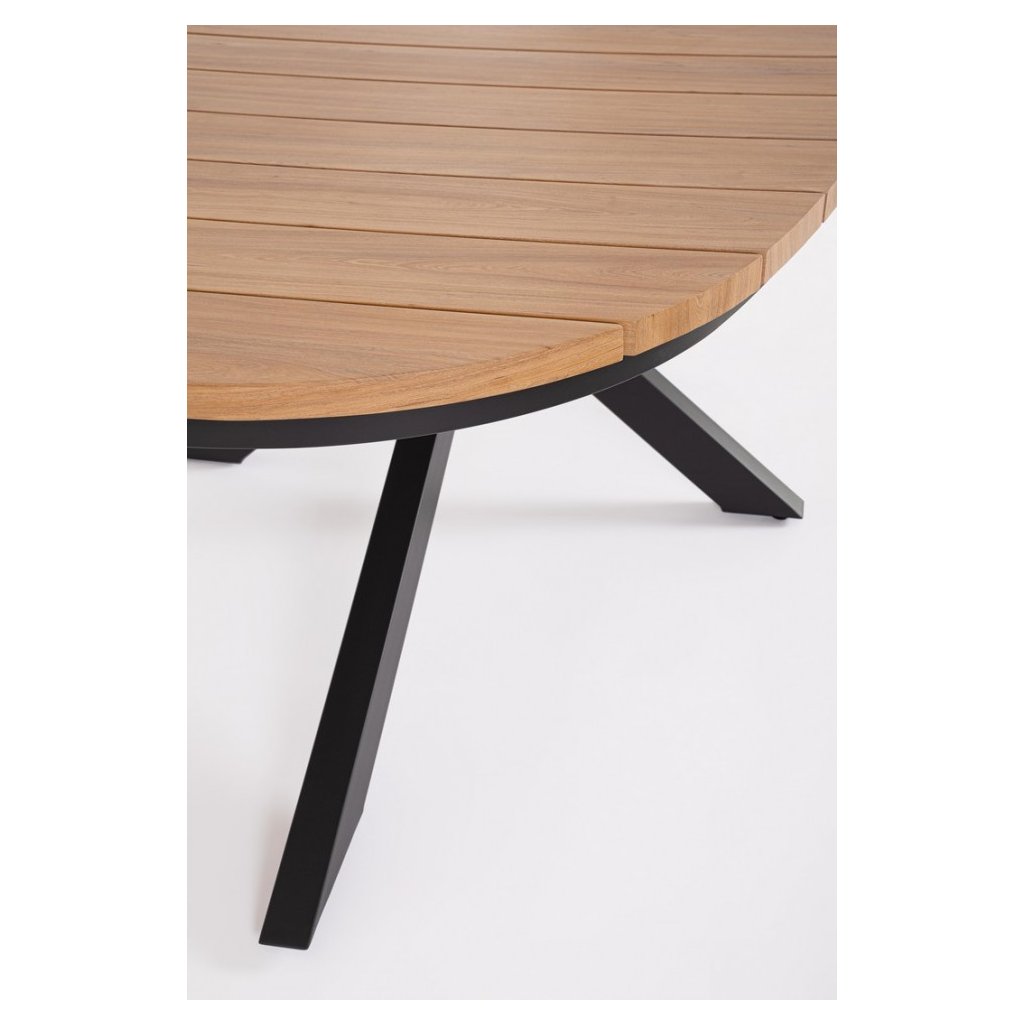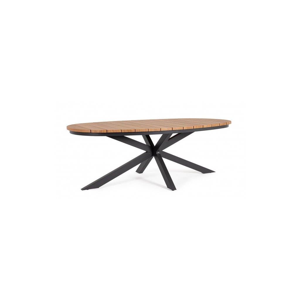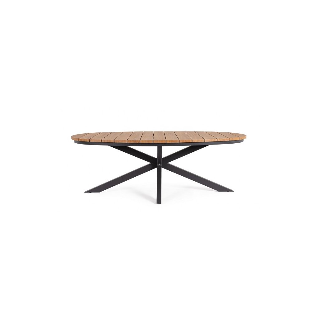 Nádherný zahradní stůl ZELMAR od italského výrobce stylového nábytku BIZZOTTO. Krásný a jednoduchý stůl je kompletně vyrobený z práškového hliníku. Oválná deska stolu je z lakovaných hliníkových lišt s efektem dřeva. Stůl vás zaujme i díky zajímavému provedení nohou.