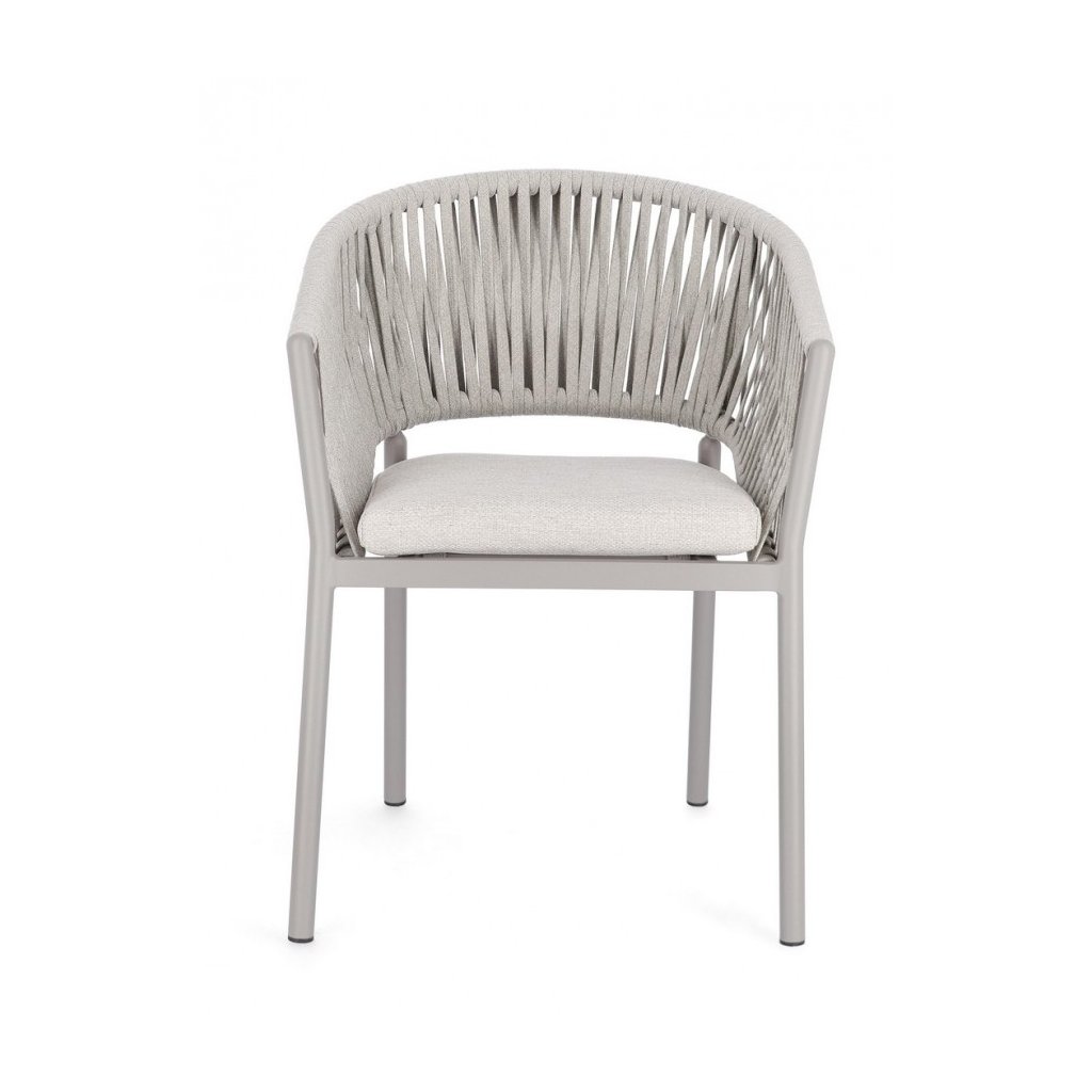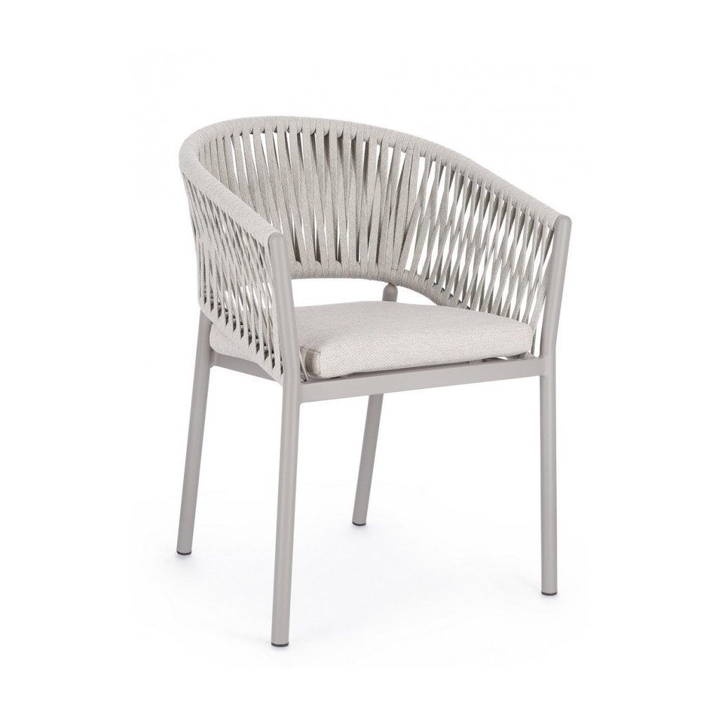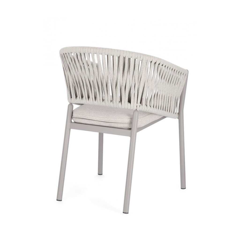 Stylová zahradní židle FLORENCIA od italského výrobce stylového nábytku BIZZOTTO. Židle FLORENCIA má nádhernou konstrukci včetně 2 područek a opěrky ze světle lakovaného hliníku, což zajišťuje jeho stabilitu a odolnost proti povětrnostním podmínkám, ale také nízkou váhu a jednoduchou manipulovatelnost. Židličku doplňuje polštářek na sezení pro lepší komfort z odolného olefinu, který je odnímatelný. Mezi konstrukcí jsou protkána nádherná světlá lanka z polyesteru, což vytváří krásně laděnou a unikátní židličku. FLORENCIA je plně stohovatelná, takže při zimním úklidu nezabere tolik místa.
