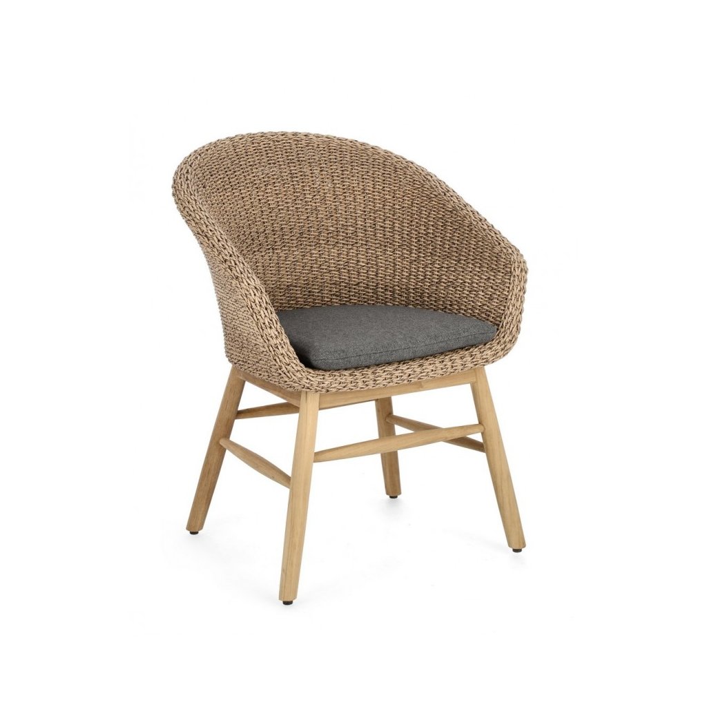 Designová venkovní židle s opěrkami GENESIS od italské firmy stylového nábytku BIZZOTTO. Židli GENESIS tvoří pevný rám z hliníku, který je potažen olefinovou látkou odolné proti slunci ve světlé barvě. Sedák šedé barvy je odnímatelný a taktéž z odolné látky olefin. Podstava se vzpruhou z teakového dřeva zajišťuje maximální stabilitu a nosnost.GENESIS vystupuje jako luxusní, pohodlné křesílko.