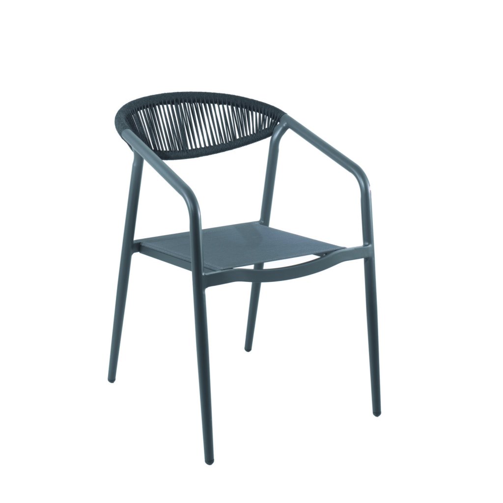 Designová zahradní jídelní židle GENEVE od belgického výrobce kvalitního nábytku GESCOVA. Židle má konstrukci z hliníku v antracitovém provedení, a to včetně nohou, které přechází do područek. Sedák a opěradlo jsou vyrobeny z lana a textylenu. Židle působí velmi příjemným dojmem.
