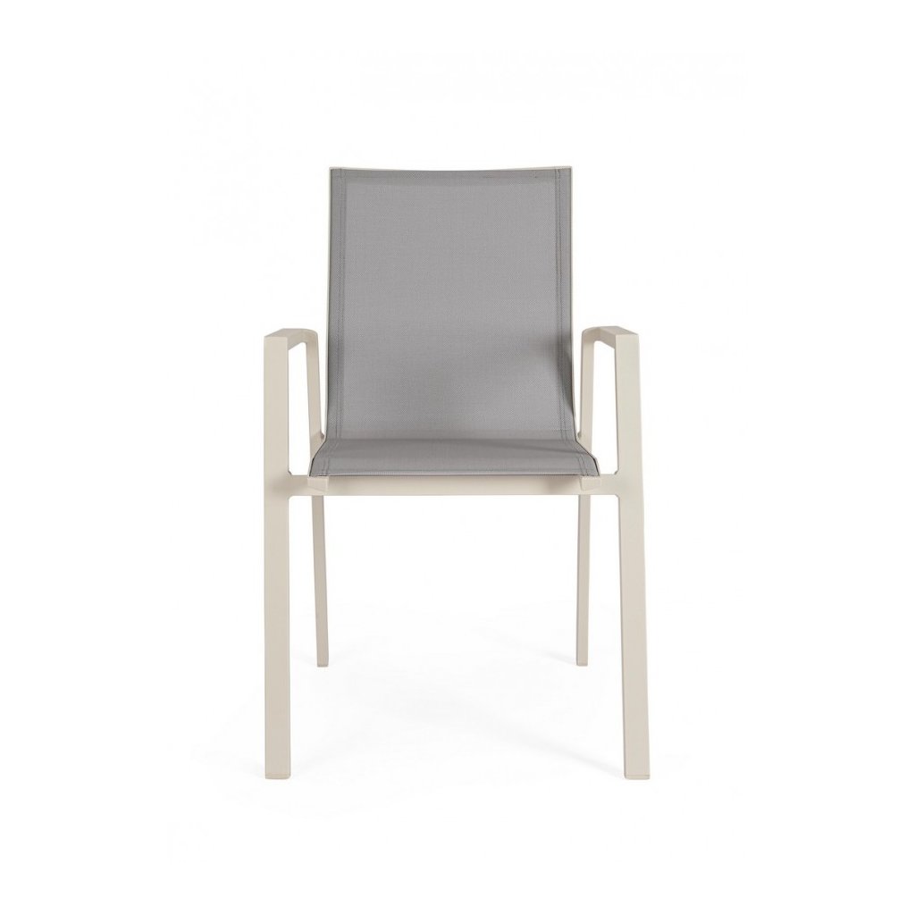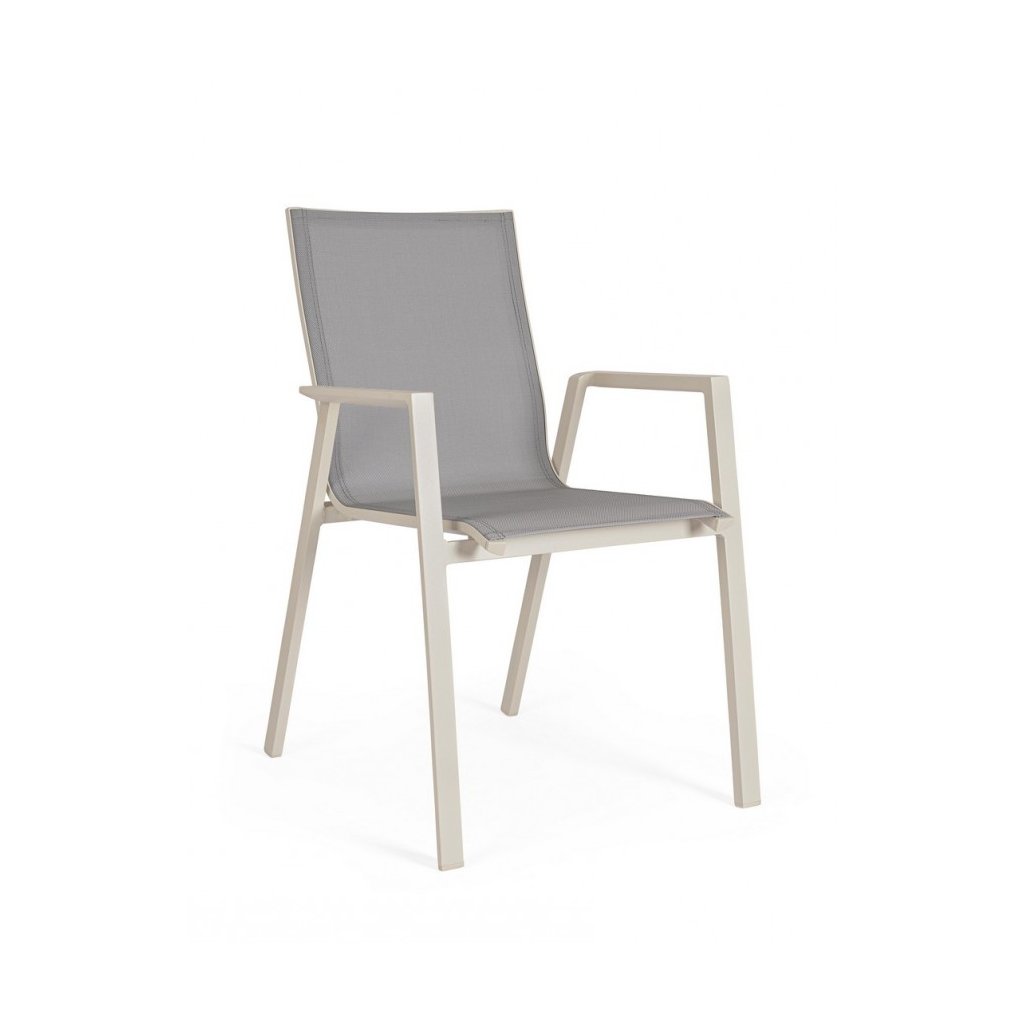 Designová venkovní židle s opěrkami KRION od italské firmy stylového nábytku BIZZOTTO. KRION tvoří pevný světlý rám z hliníku, židle je díky tomu velmi lehká. Sedák a opěradlo je z umělé textilie v tmavě šedé barvě. Můžete stohovat 2 židle. Krásná a jednoduchá židle!