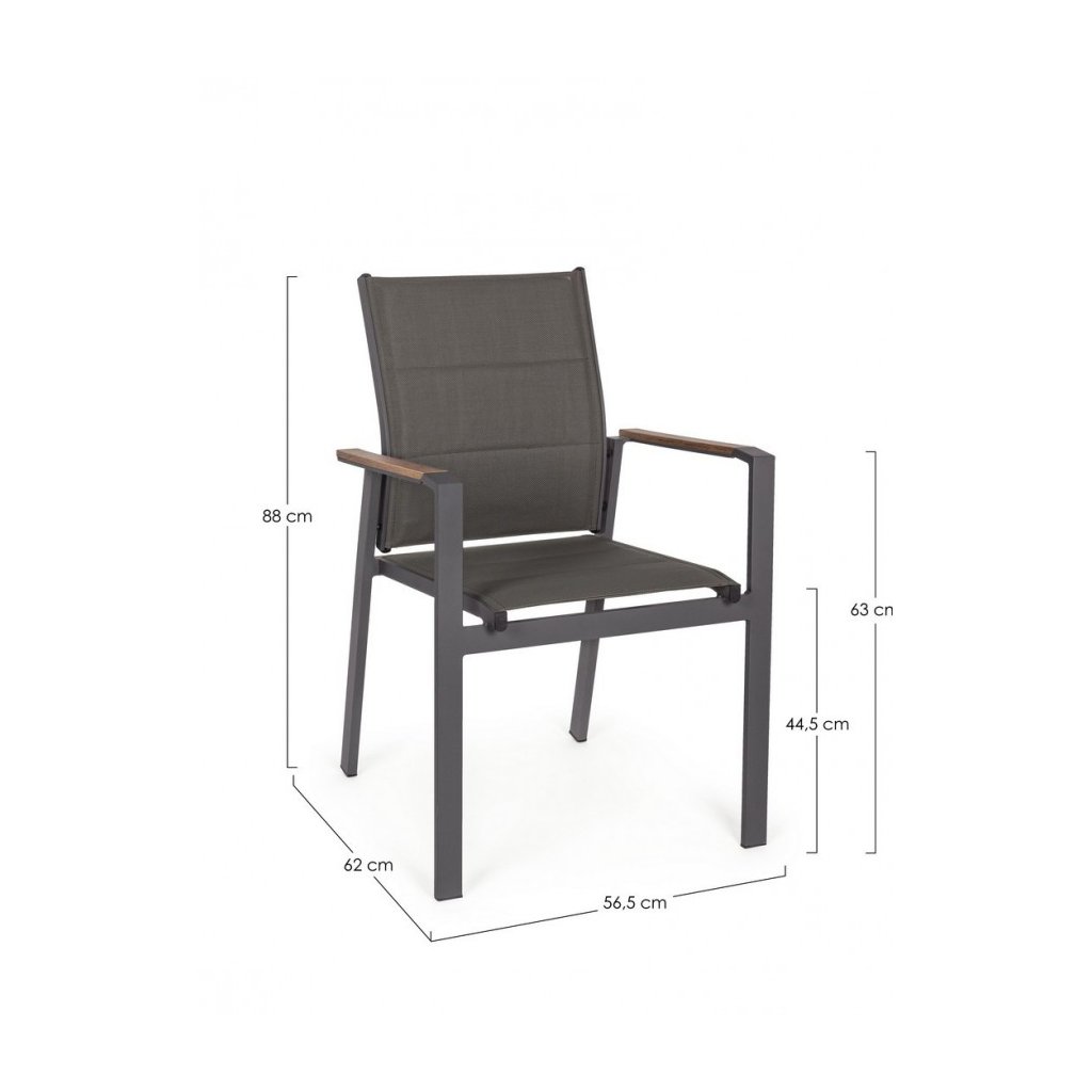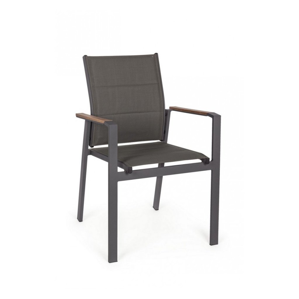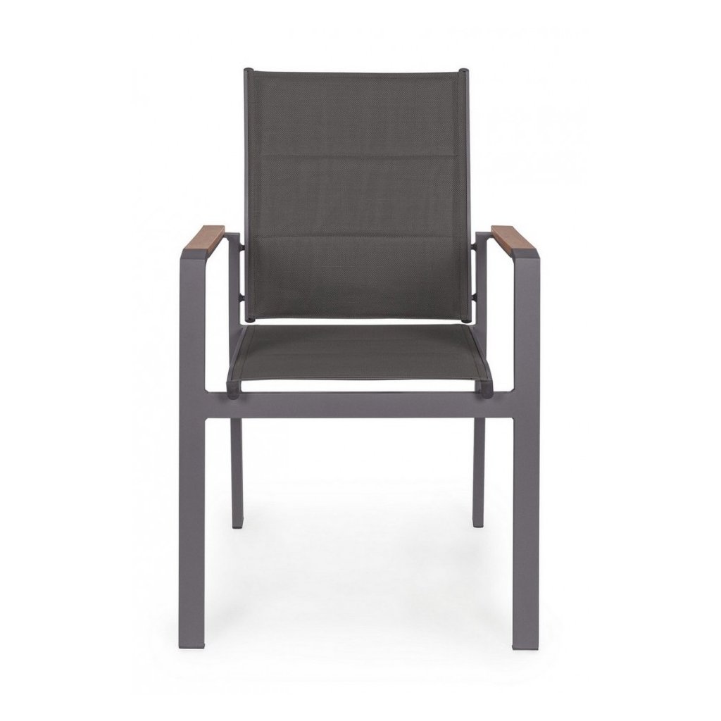 Designová venkovní židle s opěrkami KUBIK od italské firmy stylového nábytku BIZZOTTO. KUBIK tvoří pevný hliníkový rám s práškovým nátěrem v antracitovém provedení. Díky hliníku je židle velmi lehká. Sedák a opěradlo je z umělé textilie. Na područkách je dřevo z překližky. Můžete stohovat 2 židle.