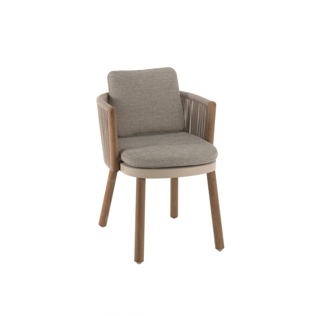 Designová zahradní jídelní židle MENDOZA od belgického výrobce kvalitního nábytku GESCOVA. Židle má konstrukci z teakového dřeva v hnědém provedení, a to včetně nohou, které přechází do područek. Povlak sedáku a opěradla je vyroben z olefinu. Područky jsou potaženy béžovým provazem. Židle působí velmi příjemným dojmem.