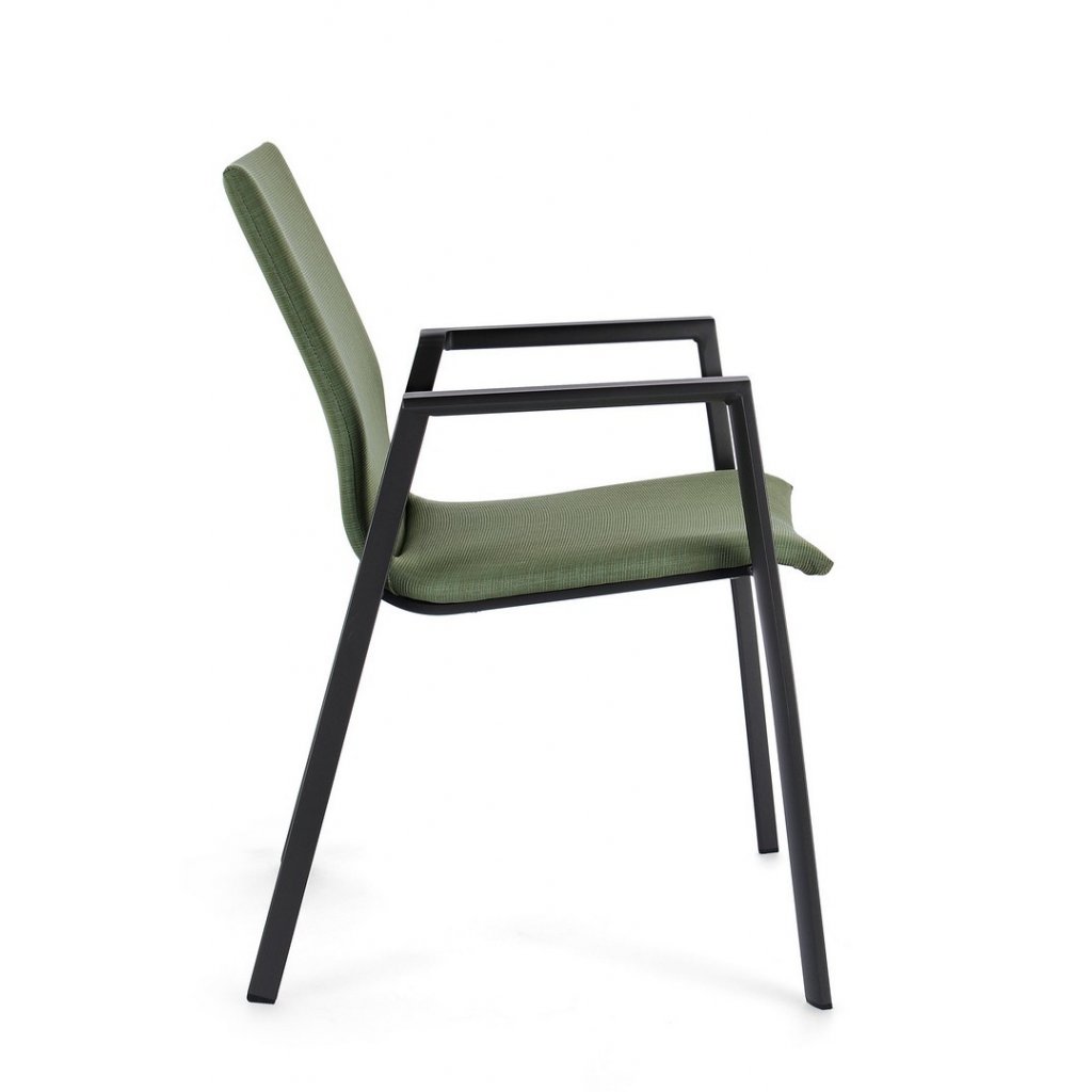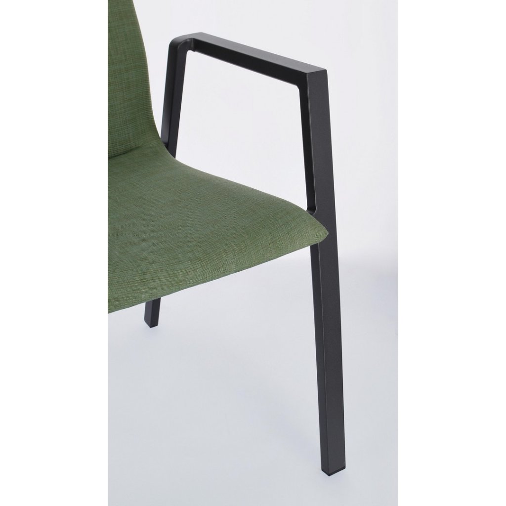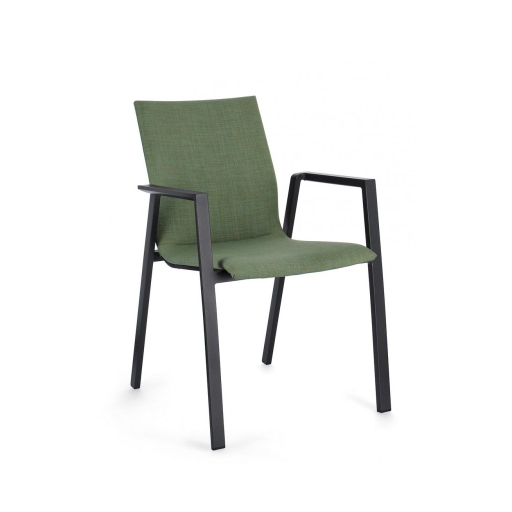 Designová venkovní židle s opěrkami ODEON od italské firmy stylového nábytku BIZZOTTO. ODEON tvoří pevný antracitový rám z hliníku, díky kterému je židle velmi lehká. Zelený polstrovaný sedák a opěradlo je z kvalitní tkaniny, je složená ze 70% textilu a z 30% odolné látky olefin, která je odolná proti slunečnímu záření. Výplň sedáku je z pohodlné a rychleschnoucí pěny. Židle jsou stohovatelné. Krásná a jednoduchá židle!