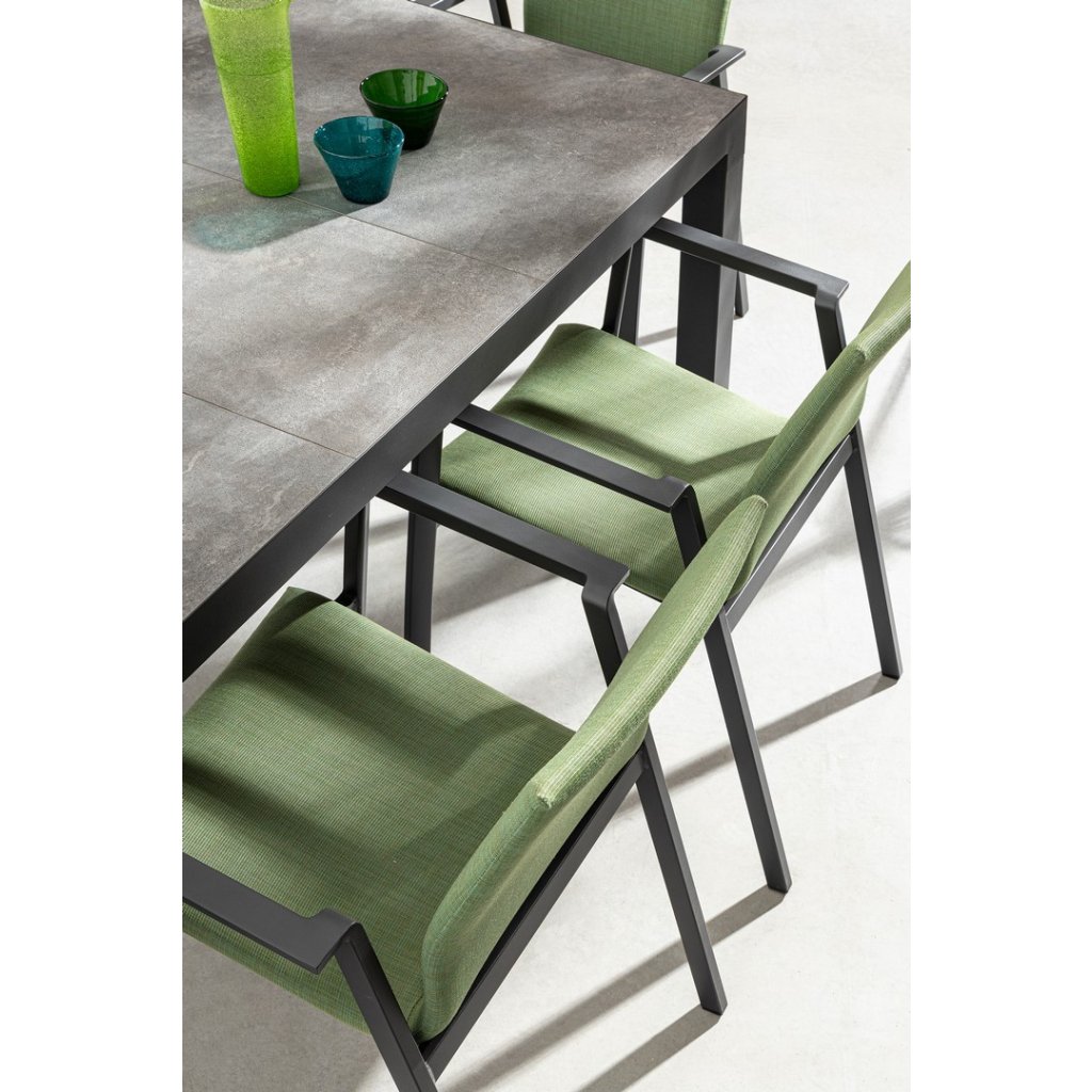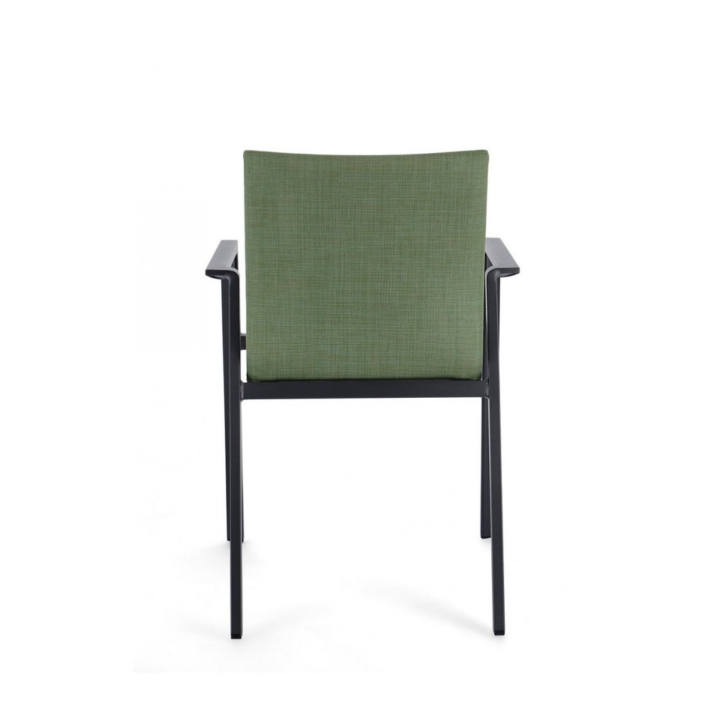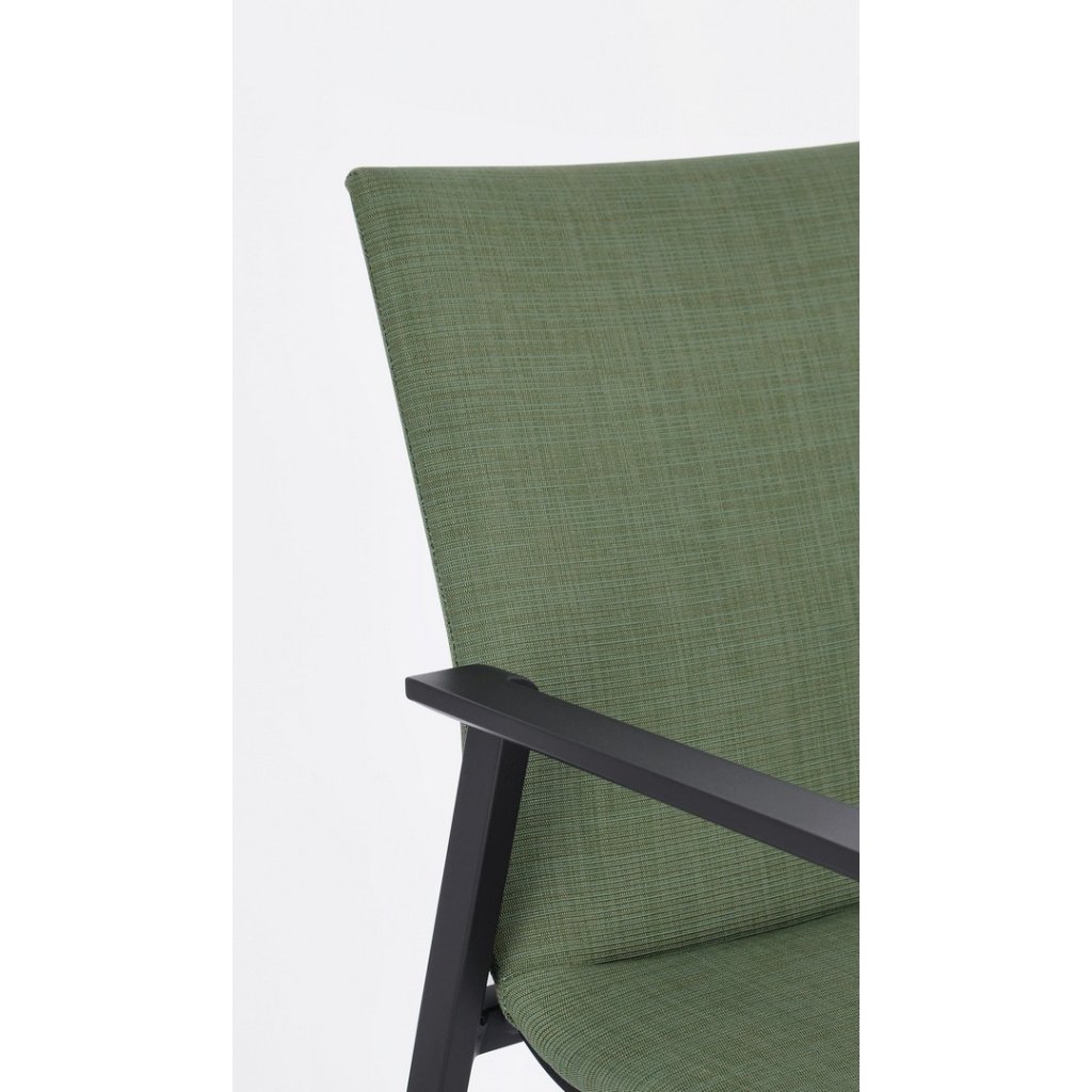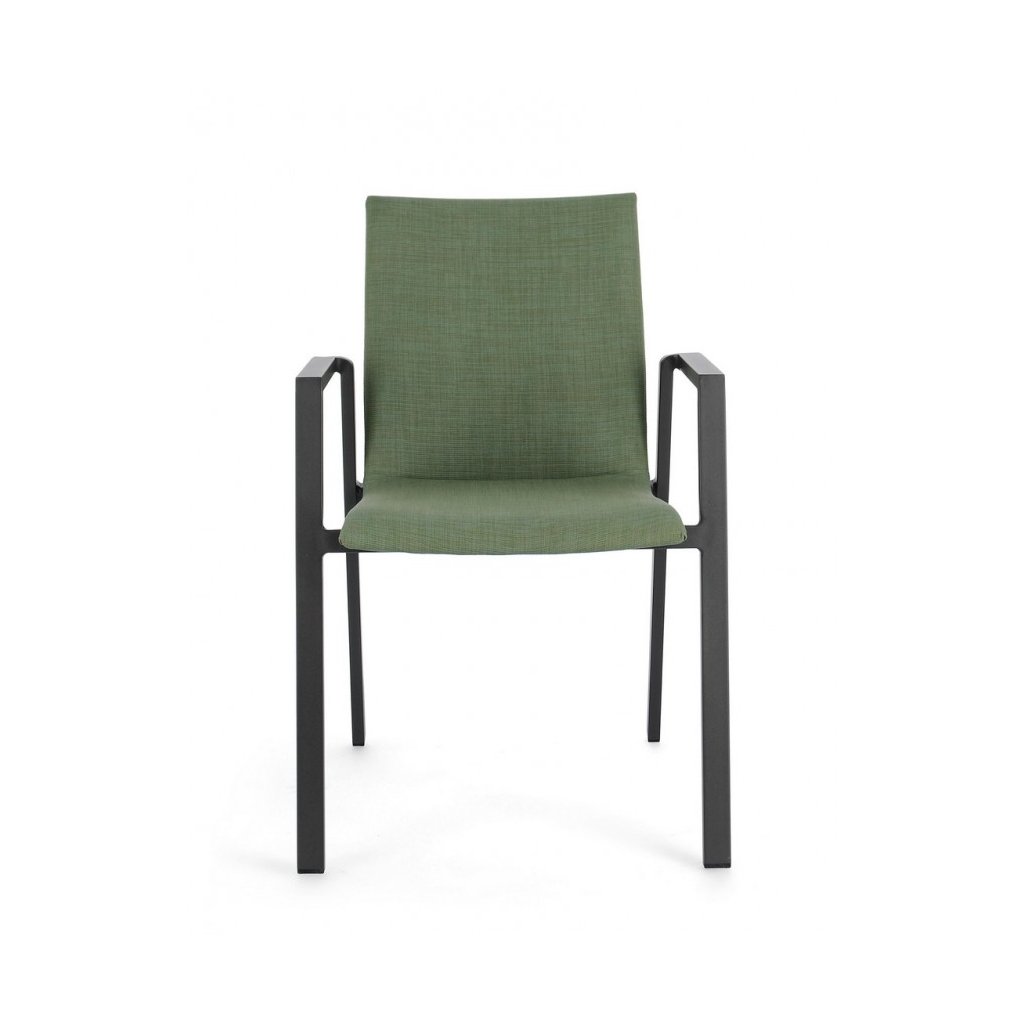 Designová venkovní židle s opěrkami ODEON od italské firmy stylového nábytku BIZZOTTO. ODEON tvoří pevný antracitový rám z hliníku, díky kterému je židle velmi lehká. Zelený polstrovaný sedák a opěradlo je z kvalitní tkaniny, je složená ze 70% textilu a z 30% odolné látky olefin, která je odolná proti slunečnímu záření. Výplň sedáku je z pohodlné a rychleschnoucí pěny. Židle jsou stohovatelné. Krásná a jednoduchá židle!