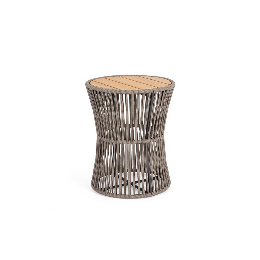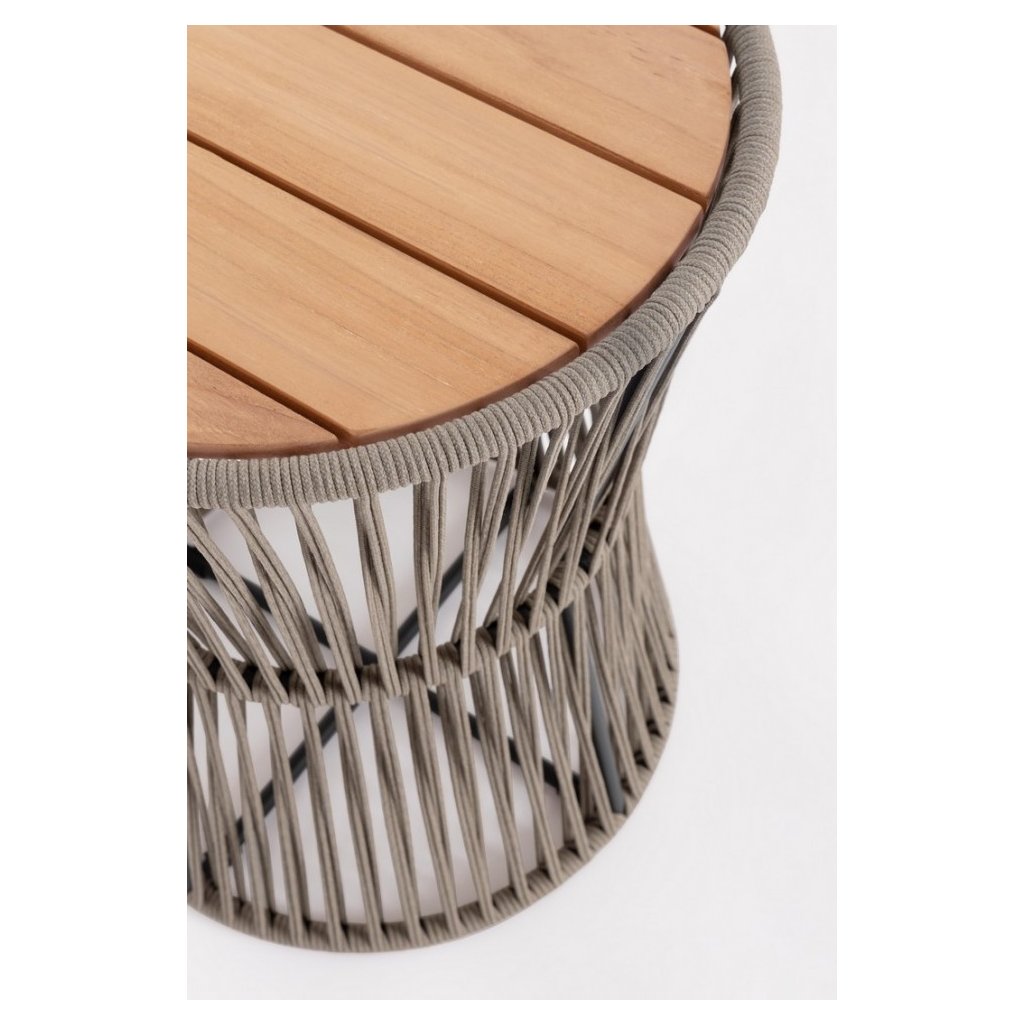 Zahradní kulatý konferenční stolek CARLES od italského výrobce stylového nábytku BIZZOTTO. Stolek CARLES má nerezovou konstrukci, která je potažena lanem. Deska stolku s průměrem 45 centimetrů je vyrobena z teaku s certifikátem SVLK, což je indonéský certifikát pro dřevařský průmysl, který zajišťuje legální původ dřeva z Indonésie.