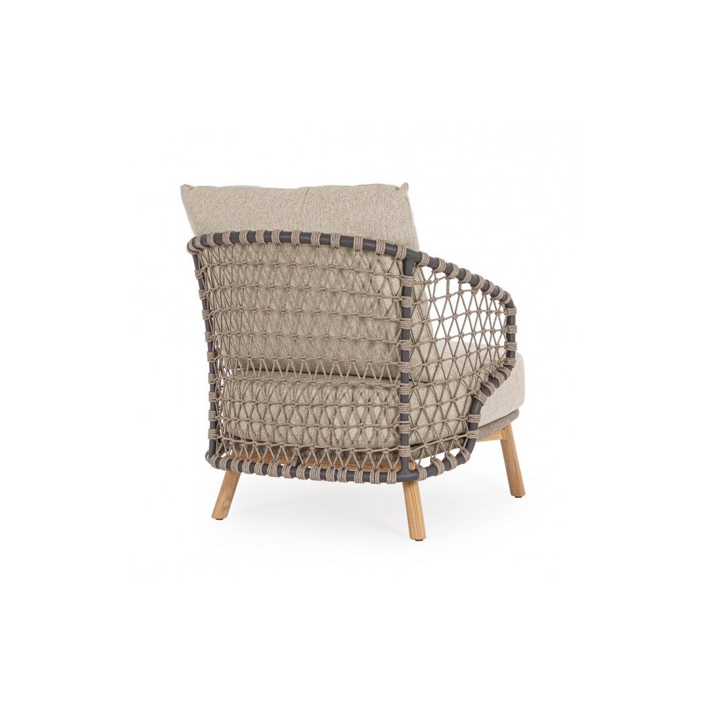 Designové  zahradní křeslo EULARIA od italského výrobce nádherného nábytku BIZZOTTO. Křeslo je dodáváno s konstrukcí z práškovaného hliníku a tkaním z polypropylenu. Nohy křesla jsou vyrobeny z teakového dřeva s certifikátem SVLK, což je indonéský certifikát pro dřevařský průmysl, který zajišťuje legální původ dřeva z Indonésie. Křeslo se pyšní vyjímatelnými polštáři z voděodolné olefinové tkaniny z polypropylenu. Díky odolnému materiálu je možné využít jak uvnitř, tak i venku.