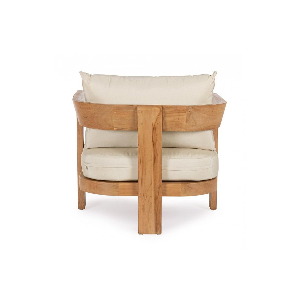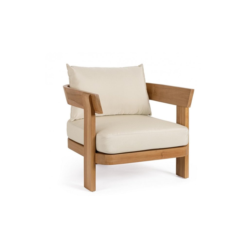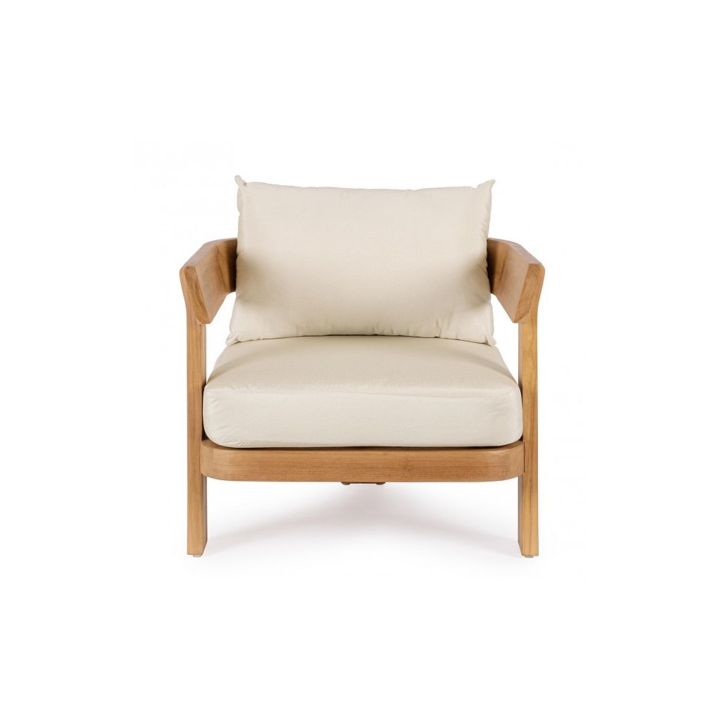 Designové teakové křeslo EVORA od italského výrobce stylového nábytku BIZZOTTO. Křeslo má rám z masivního teakového dřeva, který tvoří sedák, 2 opěrky na ruce, zadní opěrku a 3 nohy. Dřevo má certifikací SVLK, což  je indonéský certifikát pro dřevařský průmysl, který zajišťuje legální původ dřeva z Indonésie. Vše je dále pokryto odnímatelnými polštáři s povlakem z odolného olefinu