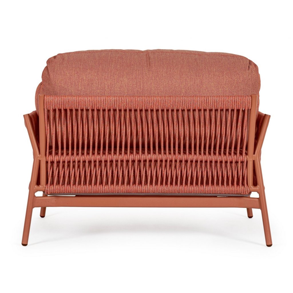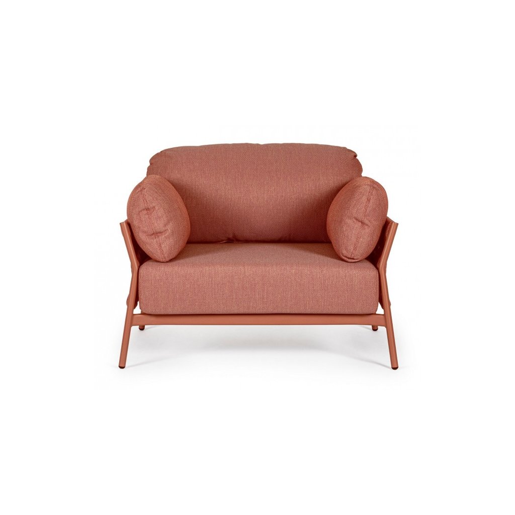 Designové zahradní křeslo PARDIS od italského výrobce stylového nábytku BIZZOTTO. Zahradní křeslo tvoří konstrukce z červeně lakovaného hliníku, díky které je velmi lehká. Bočnice jsou vypleteny z vodoodpudivé látky olefin a polštáře mají taktéž povlak z této látky. Polštáře a sedák jsou odnímatelné pro lepší čištění.
