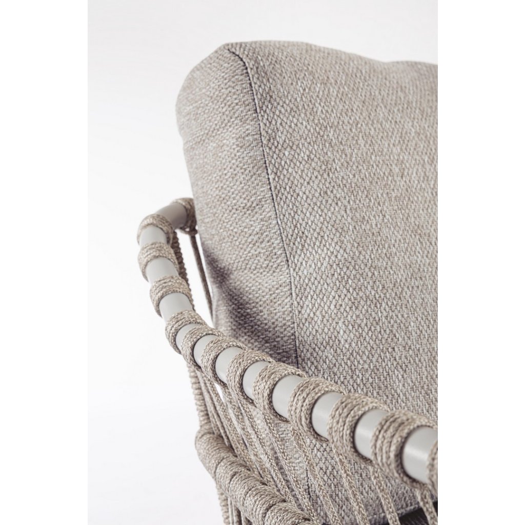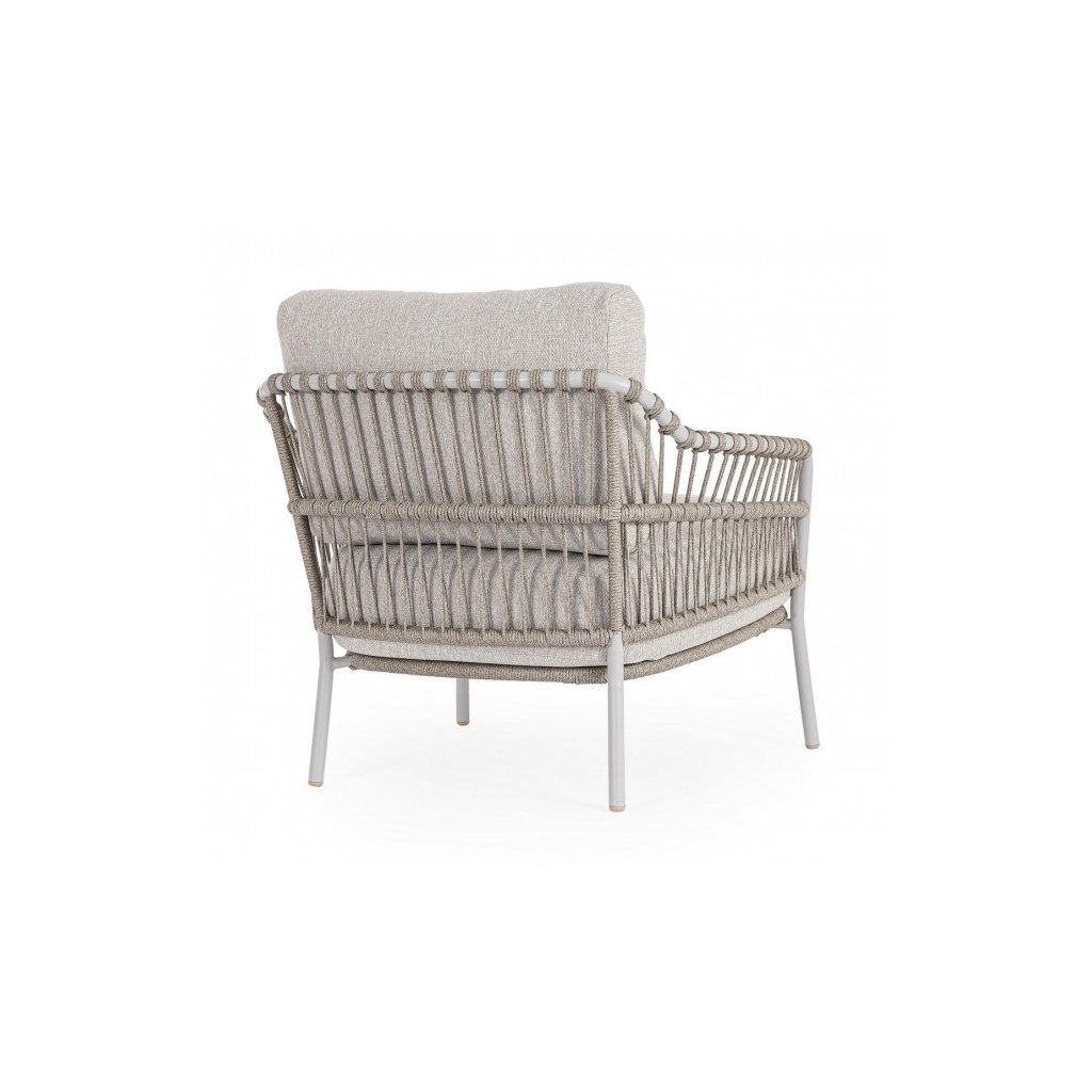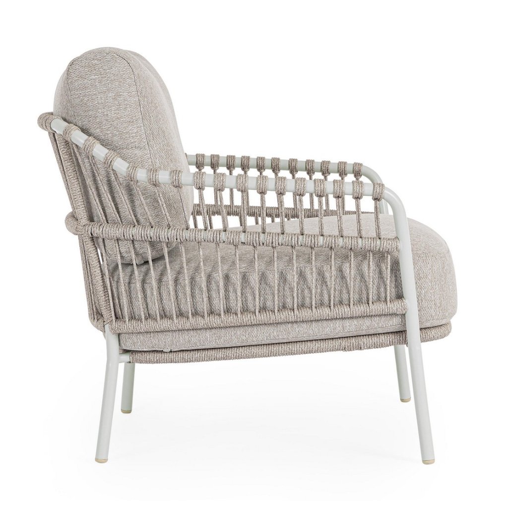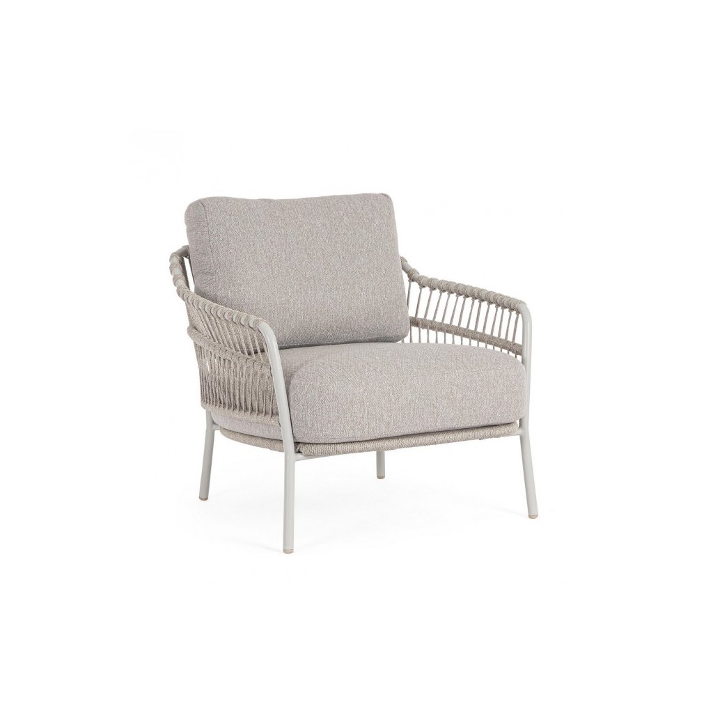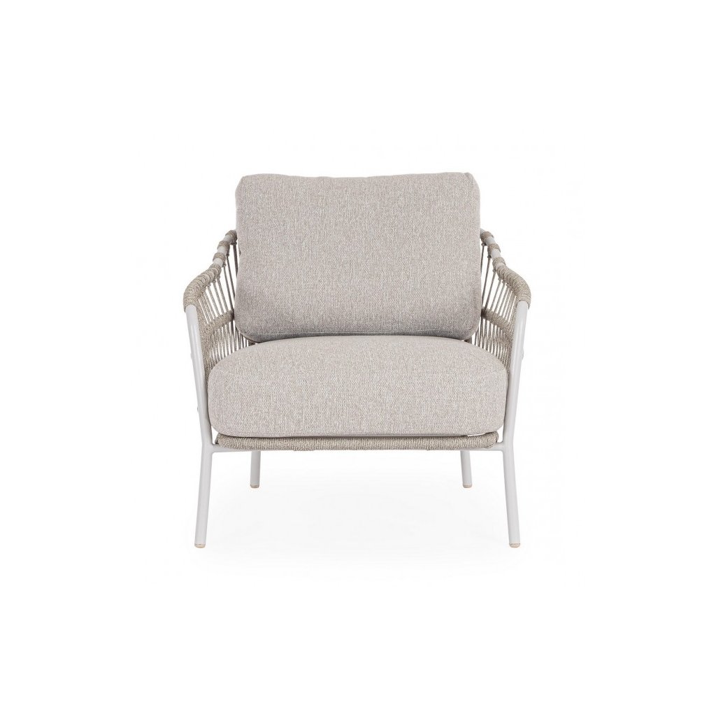 Designové  zahradní křeslo TALAIA od italského výrobce nádherného nábytku BIZZOTTO. Křeslo je dodáváno s konstrukcí z nerezu a tkaní z polypropylenu. Křeslo se pyšní vyjímatelnými polštáři z voděodolné olefinové tkaniny z polypropylenu. Díky odolnému materiálu je možné využít jak uvnitř, tak i venku.