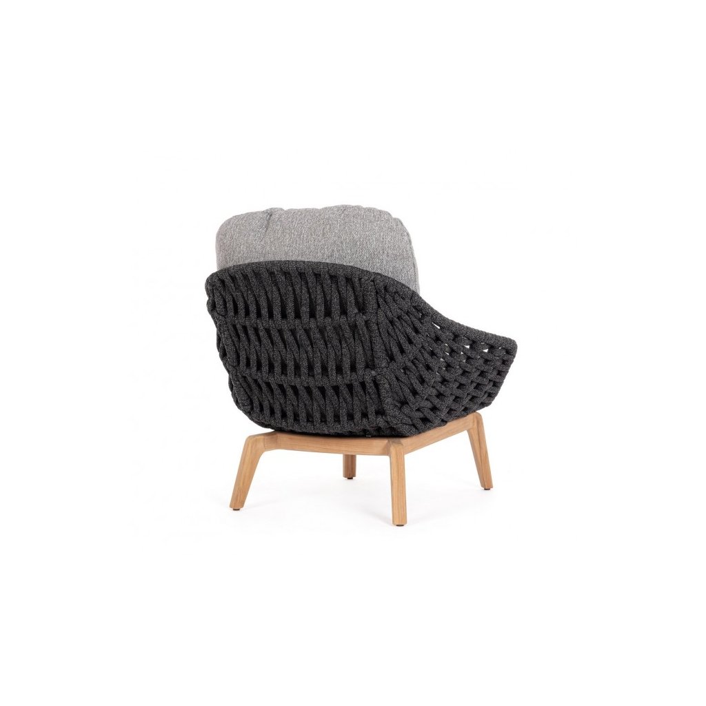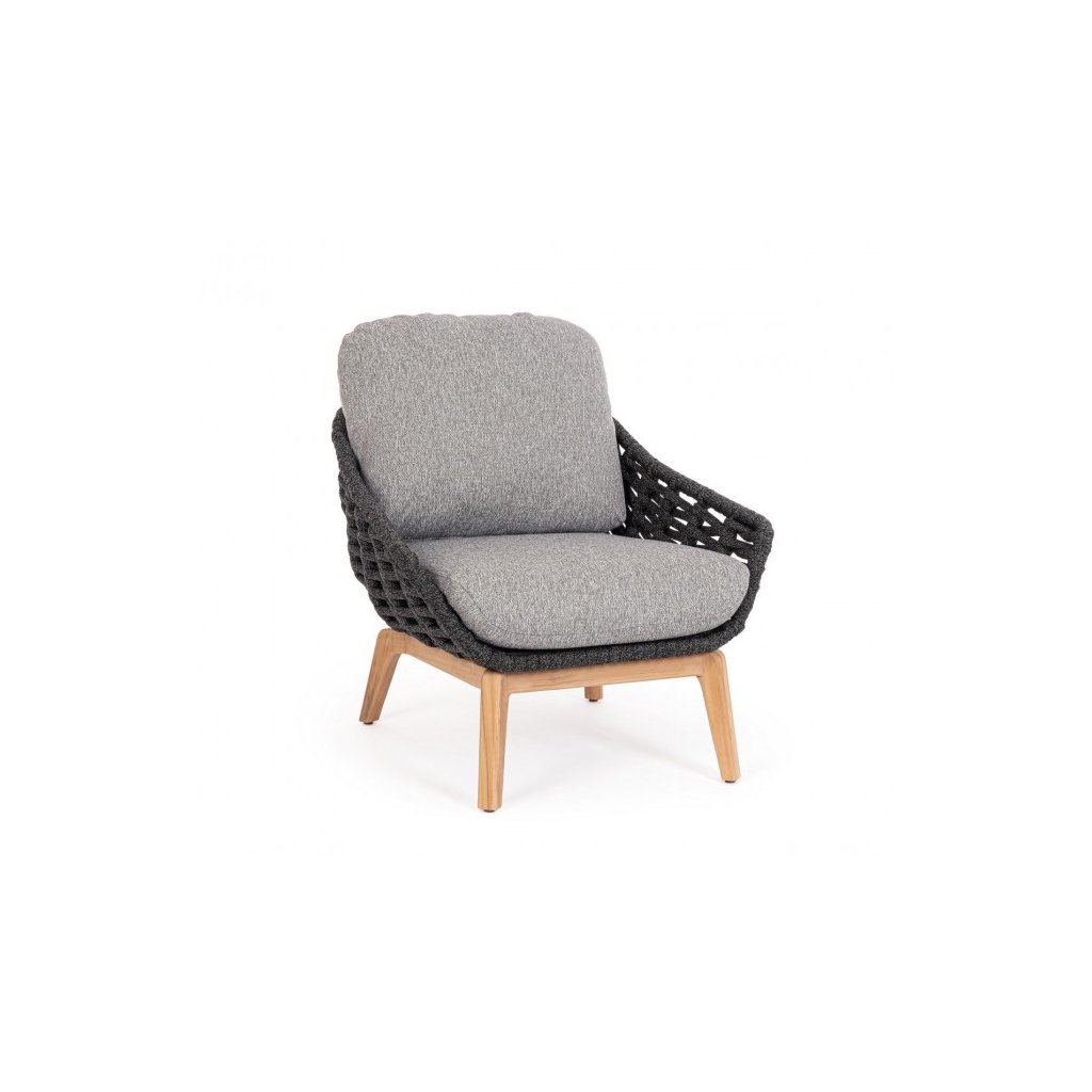 Designové zahradní křeslo TAMIRES od italské firmy stylového nábytku BIZZOTTO. Křeslo TAMIRES tvoří hliníkový rám s práškovým nátěrem, záda jsou vyplněna textilním lanem. Sedadlo a zadní polštář jsou z olefinové látky ve světle šedé barvě. Elegantní nohy má křeslo vyrobené z teakového dřeva. Krásné a velmi pohodlné křeslo v tradičním a žádaném provedení. Křeslo se stane Vaším oblíbeným společníkem ve chvíli odpočinku a relaxace.