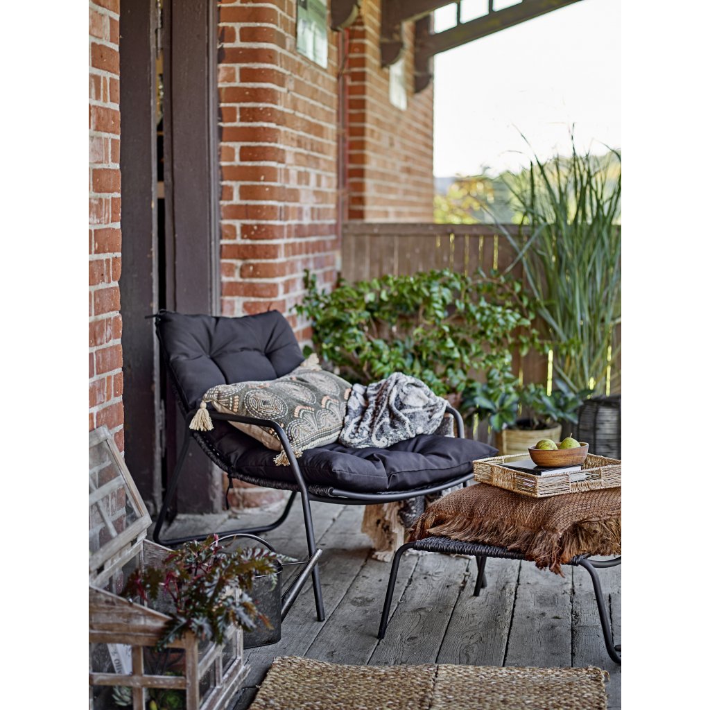 Stylové zahradní lehátko s podnožkou BOEL od dánského výrobce nádherného nábytku BLOOMINGVILLE. BOEL je nádherné lehátko z velké série zahradního nábytku, které má konstrukci z kovu, díky čemuž je pevné, odolné a robustní. Opěradlo, sedák a horní část podnožky jsou vyrobeny z pletené šňůry. Vrchní sedák je tvořen z polyesteru také v krásné černé barvě.