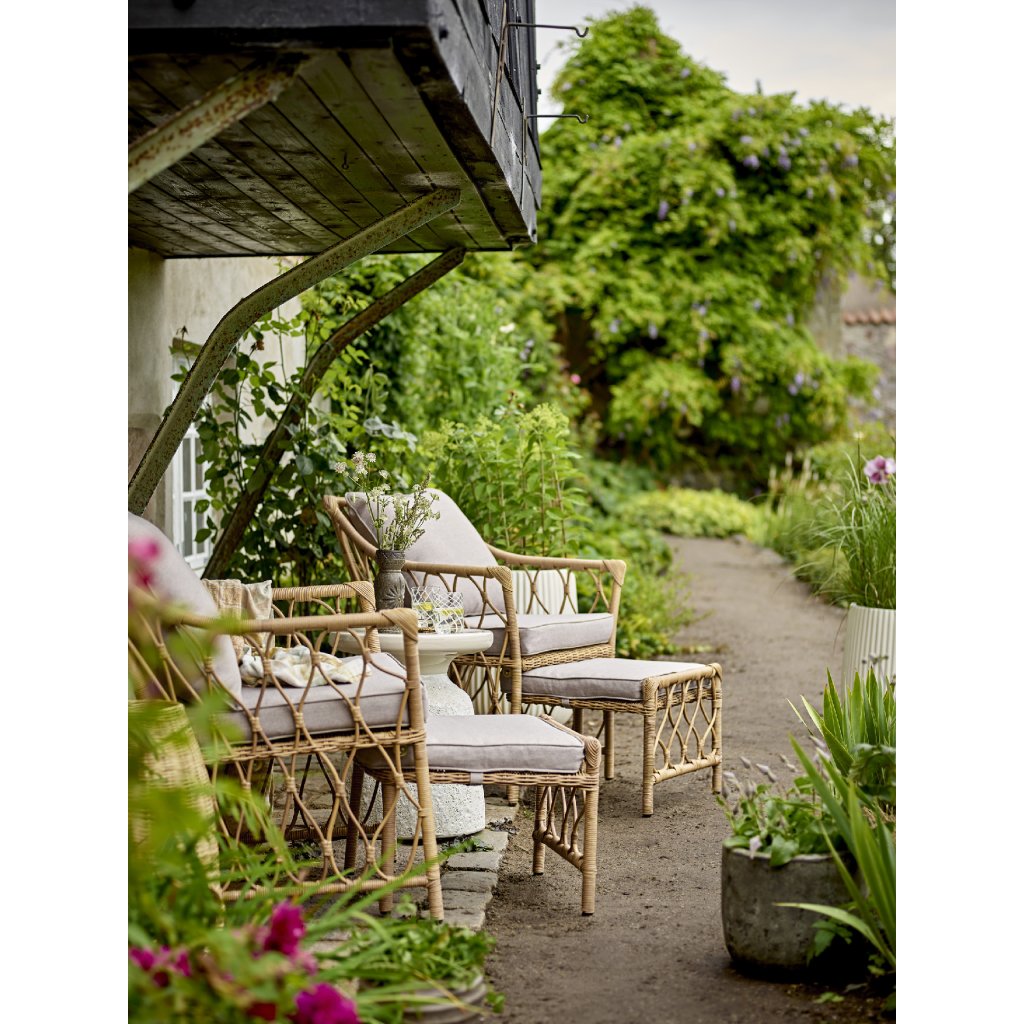 Stylové zahradní lehátko s podnožkou BELLUCE od dánského výrobce nádherného nábytku BLOOMINGVILLE. BELLUCE je nádherné lehátko z velké série zahradního nábytku, které se vyznačuje tkaným polyratanem. Lehátko je doplněno polyesterovými polštáři v béžové barvě s okouzlujícím lněným vzhledem. Praktický taburet lze snadno uložit pod křeslo, čímž se ušetří místo. Doporučujeme umístit venkovní nábytek do krytých prostor.