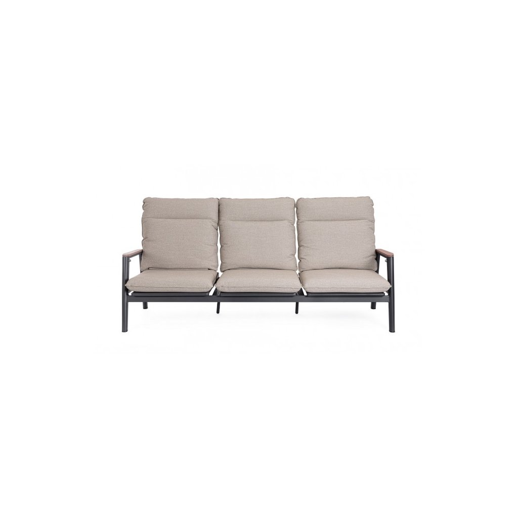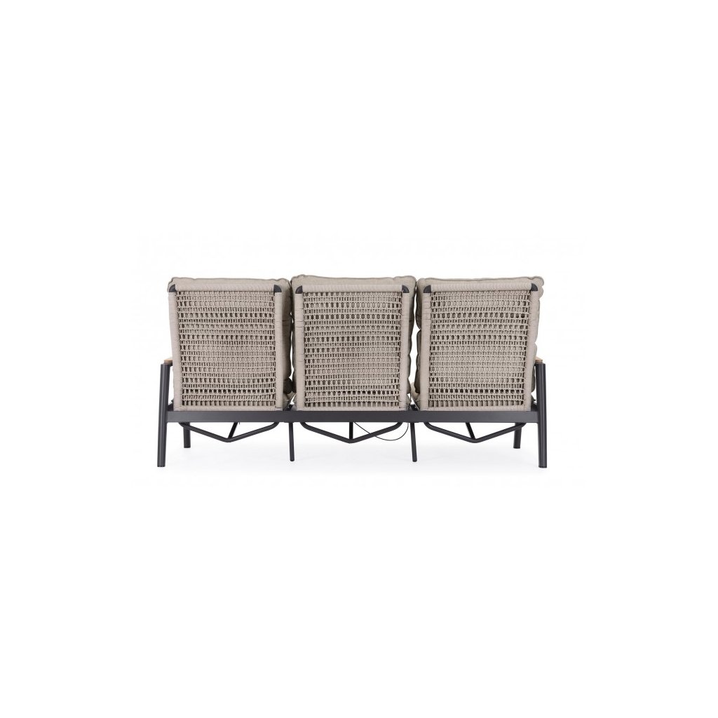 Designová  zahradní pohovka MIGUEL od italského výrobce nádherného nábytku BIZZOTTO. Pohovka je dodávána s konstrukcí z práškovaného hliníku. Područky mají teakové vložky a opěrky jsou protkané olefinovým lanem. Pohovka se pyšní vyjímatelnými polštáři z voděodolné olefinové tkaniny. Díky odolnému materiálu je možné využít jak uvnitř, tak i venku.