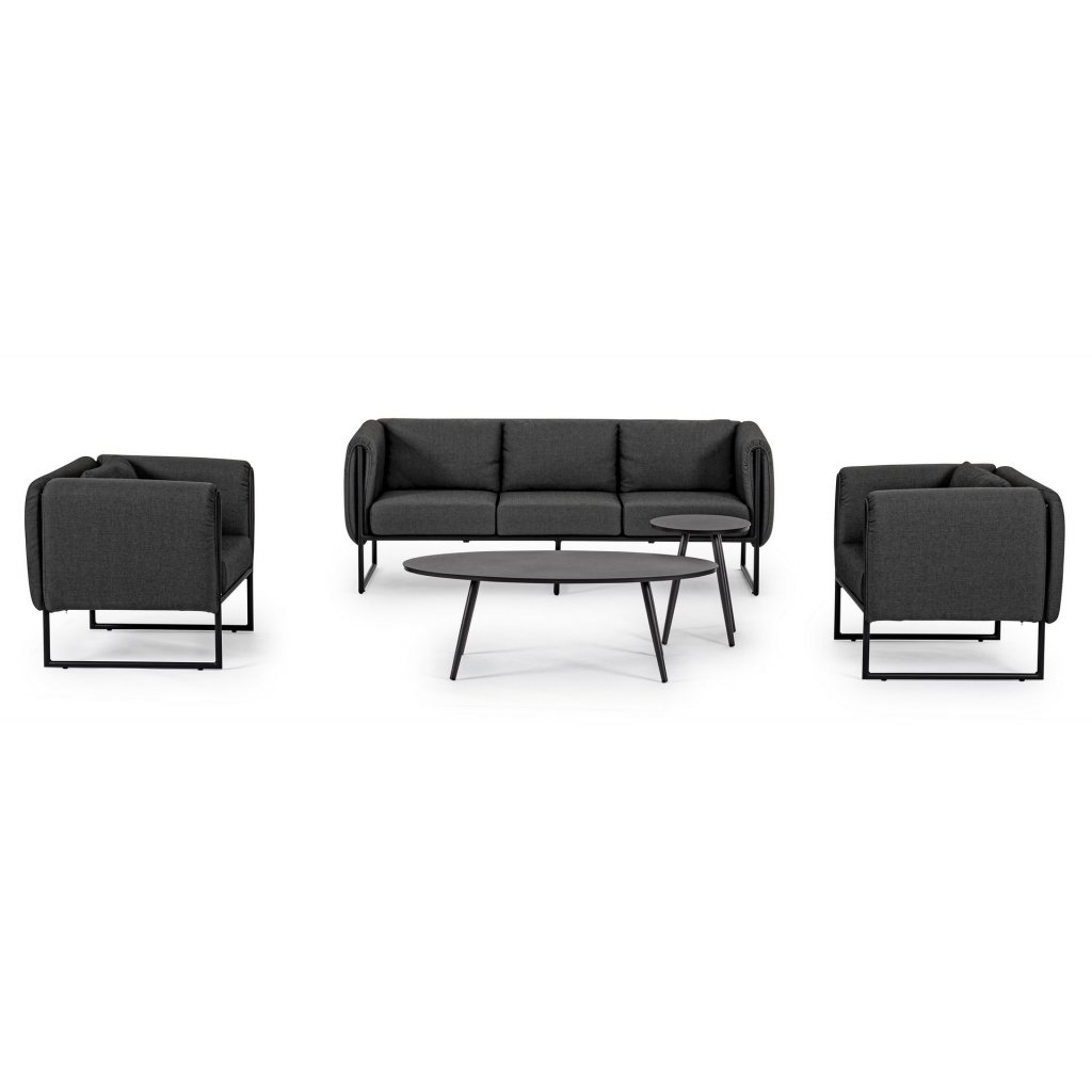 Designová zahradní pohovka PIXEL od italského výrobce stylového nábytku BIZZOTTO v kombinaci šedé látky a antracitového hliníkového rámu.