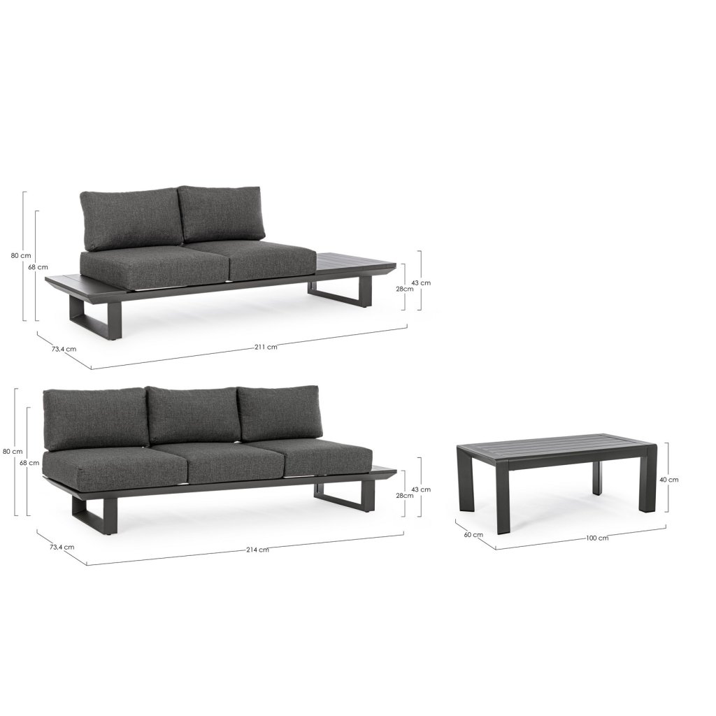 Designová zahradní rohová sestava KONNOR od italského výrobce stylového nábytku BIZZOTTO. Zahradní sestavu tvoří rohová pohovka ze 2 částí s kostrou z antracitově lakovaného hliníku, která je pokryta odnímatelnými polštářky z tmavě šedého olefinu a doplněna vrchními polštářky pro opírání. Rohovku použijete jako rohovou, nebo jako 2 oddělené pohovky v případě potřeby. Na bočních stranách mají pohovky stylové odkládací prostory. Pohovku pak doplňuje konferenční stolek ve stejném provedení černého hliníku. Díky materiálu hliníku jsou odolné a lehké na manipulaci.