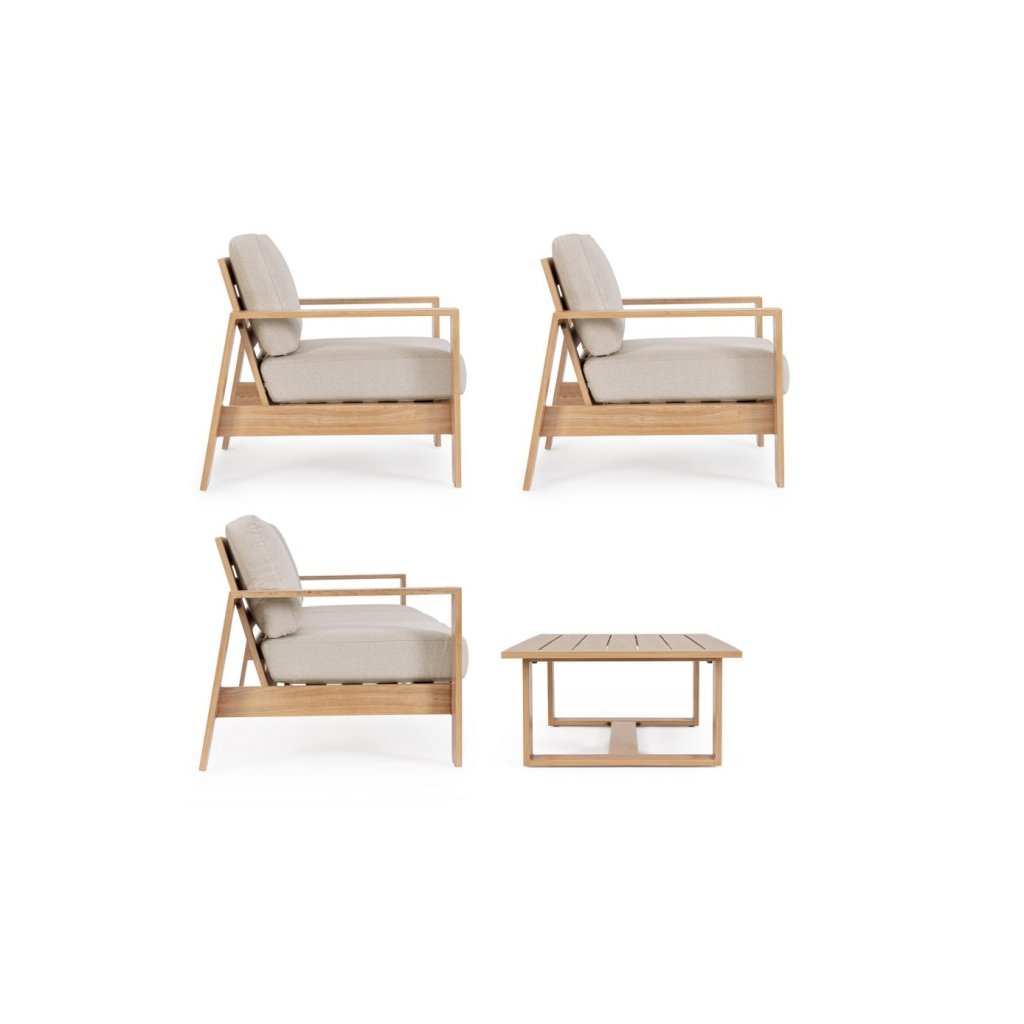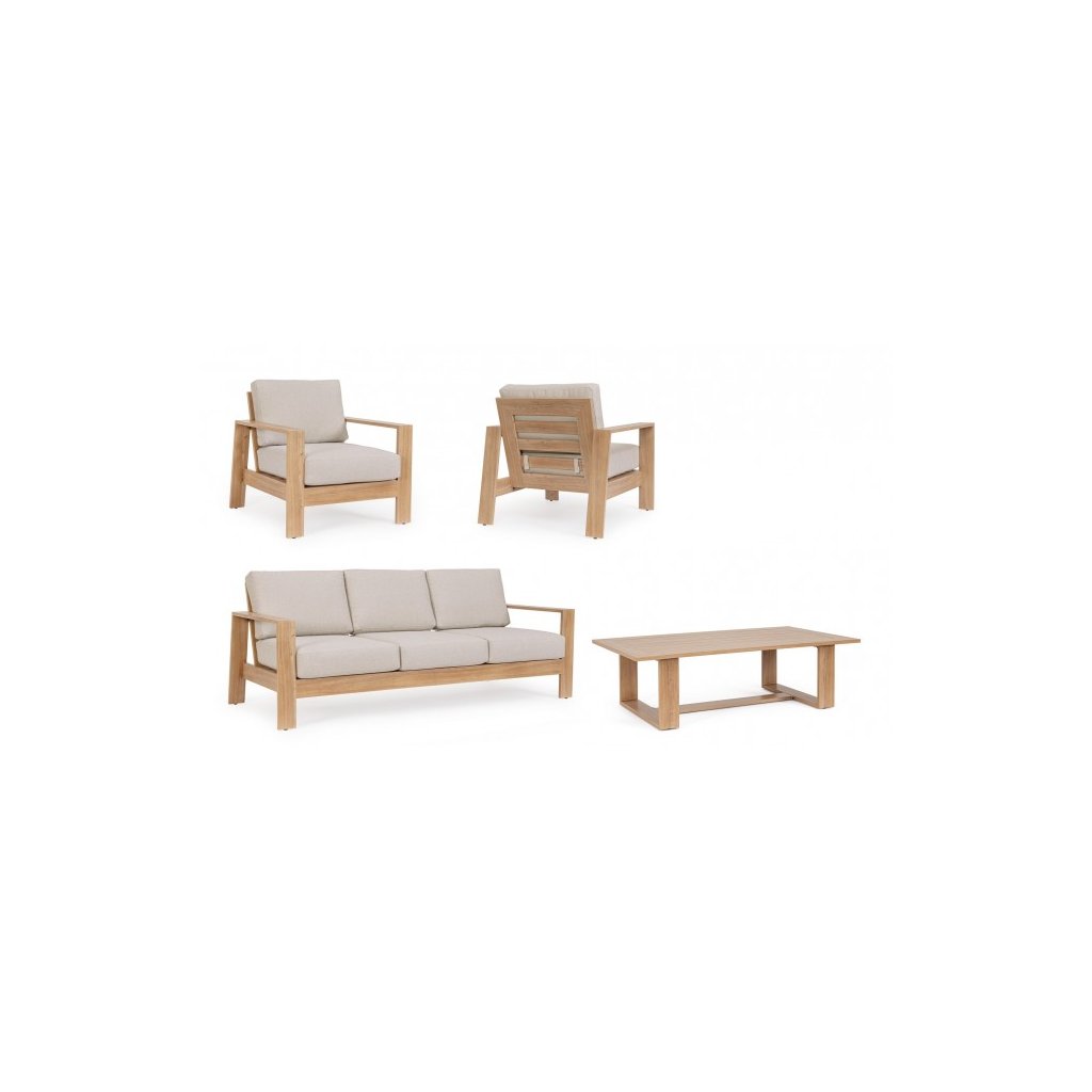 Designový zahradní set BALTIC od italského výrobce stylového nábytku BIZZOTTO. Zahradní sestavu tvoří třímístná pohovka, 2 křesla a  konferenční stolek. Celá sestava je vyrobena především z lehkého hliníku s jemným efektem dřeva ve světlé barvě. Pohovka a křesla mají sedací a opěrné polštářky ze šedého olefinu, který je odolný UV záření a vodě. Příjemné vám budou i boční područky u obou.  Díky materiálu hliníku jsou odolné a lehké na manipulaci.