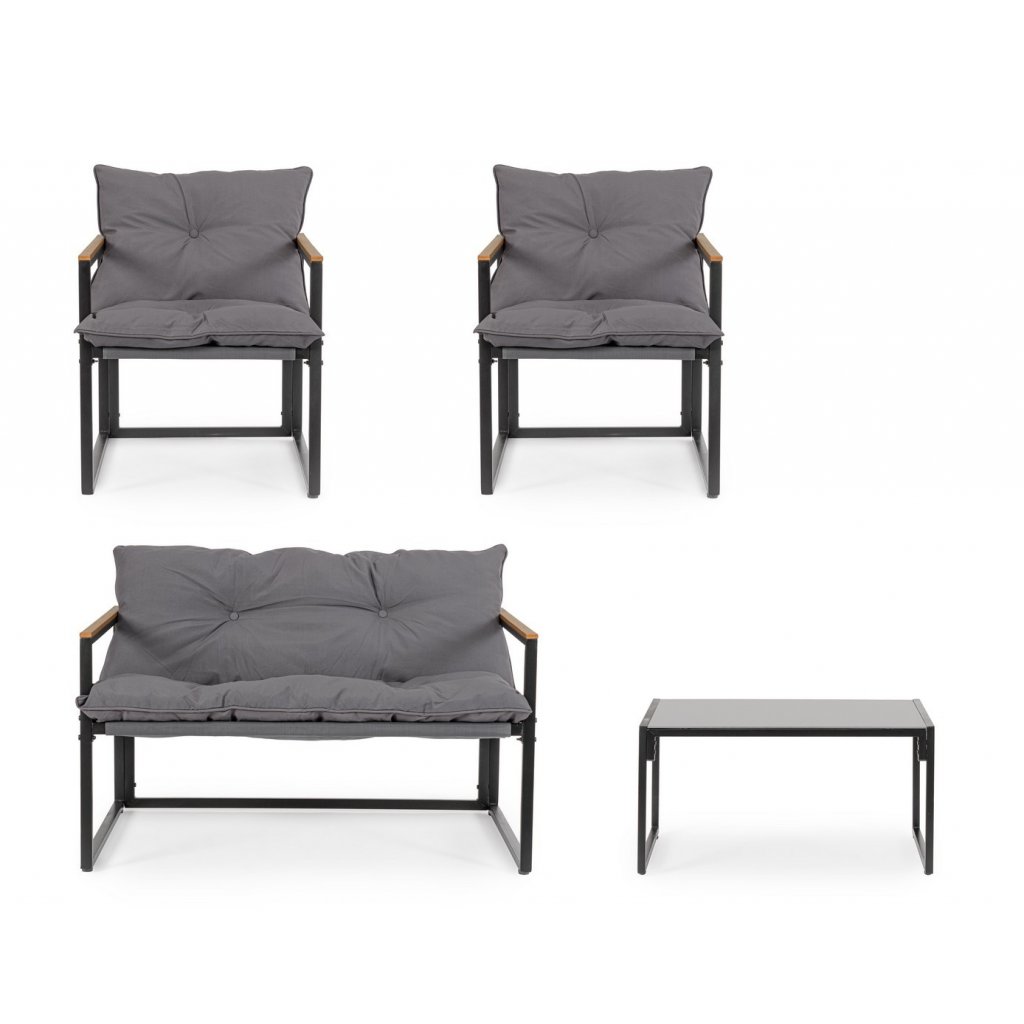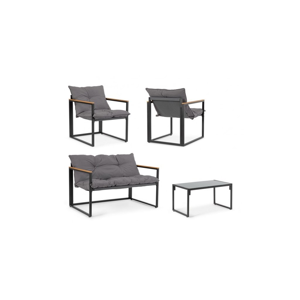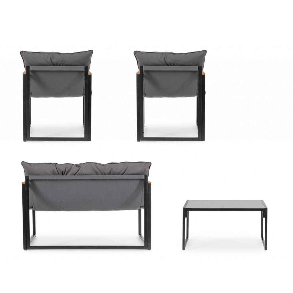 Designový zahradní set ILDA od italského výrobce stylového nábytku BIZZOTTO. Zahradní sestavu tvoří dvoumístná pohovka a 2 křesla s kostrou z černě lakovaného hliníku, která je pokryta polštářky z tmavě šedého polyesteru a doplněna vrchními polštářky pro opírání. Na bočních stranách mají stylové kovové područky ve světlé barvě. Pohovku a křesla doplňuje konferenční stolek v kombinaci hliníkové konstrukce a skleněné desky v černé barvě.