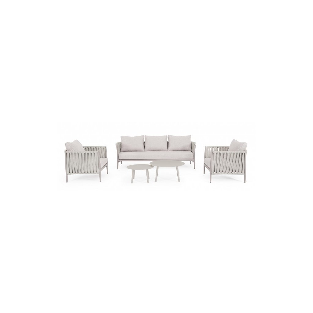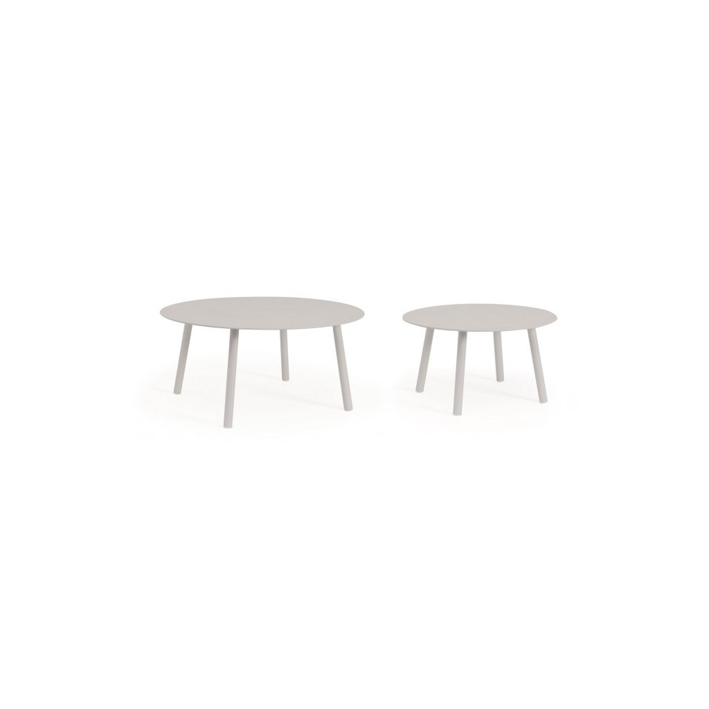 Set dvou zahradních konferenčních stolků AMINTA od italského výrobce kvalitního nábytku BIZZOTTO. AMINTA tvoří 2 kulaté stolky s rozdílnými rozměry a velikostí. Větší stolek má desku s průměrem 80 centimetrů a menší stolek má desku s průměrem 60 centimetrů. Stolky mají také rozdílnou výšku. Stolky mají čtyři nohy, které zajišťují pevnost a stabilitu. Stolky jsou kompletně vyrobeny z práškovaného hliníku ve světlém provedení.