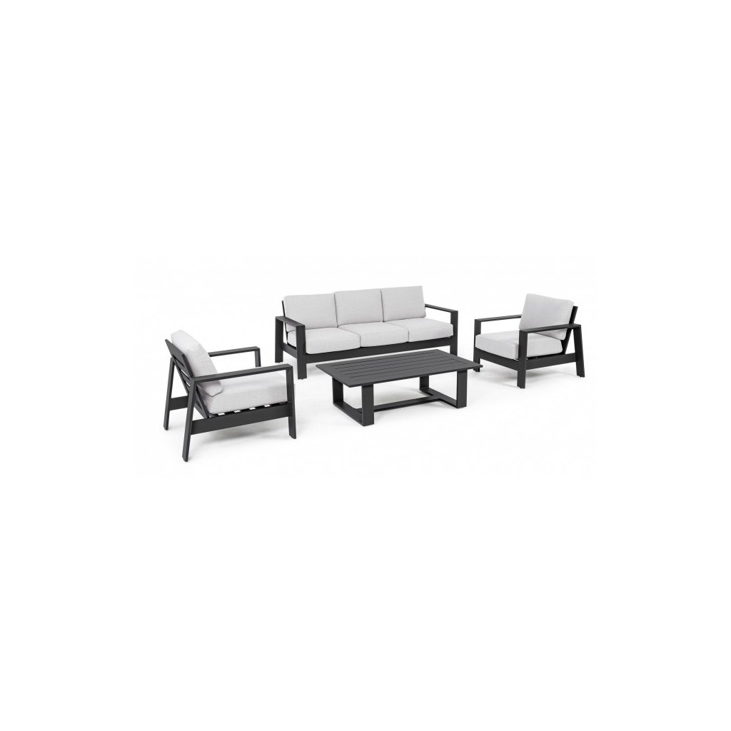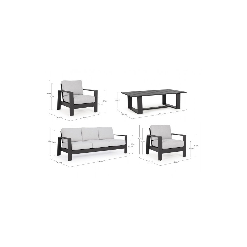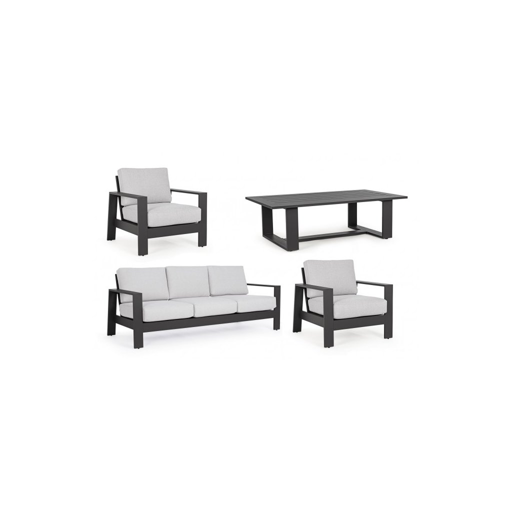 Designový zahradní set BALTIC od italského výrobce stylového nábytku BIZZOTTO. Zahradní sestavu tvoří třímístná pohovka, dvě křesla a konferenční stolek. Celá sestava je vyrobena z hliníku s práškovým nátěrem v černém provedení. Pohovka a křesla mají sedací a opěrné polštářky ze světle šedého olefinu, který je odolný UV záření a vodě. Křeslo i pohovka jsou doplněny područkami. Díky kvalitnímu materiálu je set odolný a lehký na manipulaci.