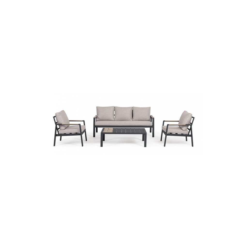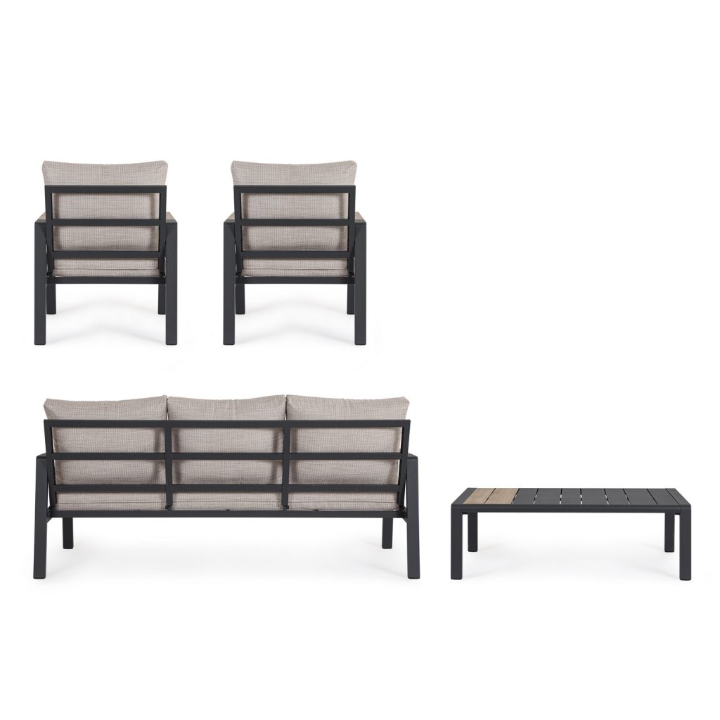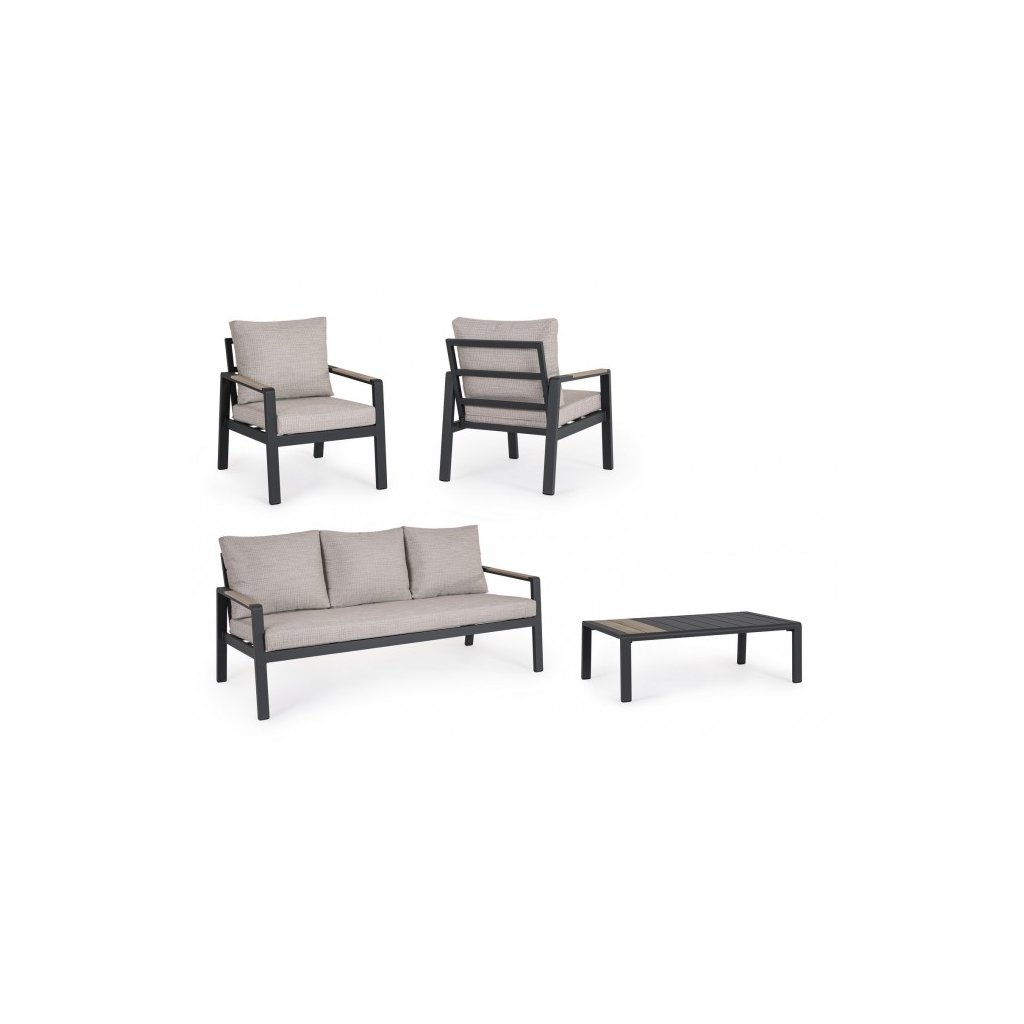 Designový zahradní set ELNA od italského výrobce stylového nábytku BIZZOTTO. Zahradní sestavu tvoří třímístná pohovka, dvě křesla a konferenční stolek. Celá sestava je vyrobena z hliníku s práškovým nátěrem v antracitovém provedení. Područky a stolová deska s vložkami jsou vyrobeny z recyklovaného plastu imitující dřevo. Pohovka a křesla mají vyjímatelné sedací a opěrné polštářky ze světlé voděodolné látky. Díky kvalitnímu materiálu je set odolný a lehký na manipulaci.