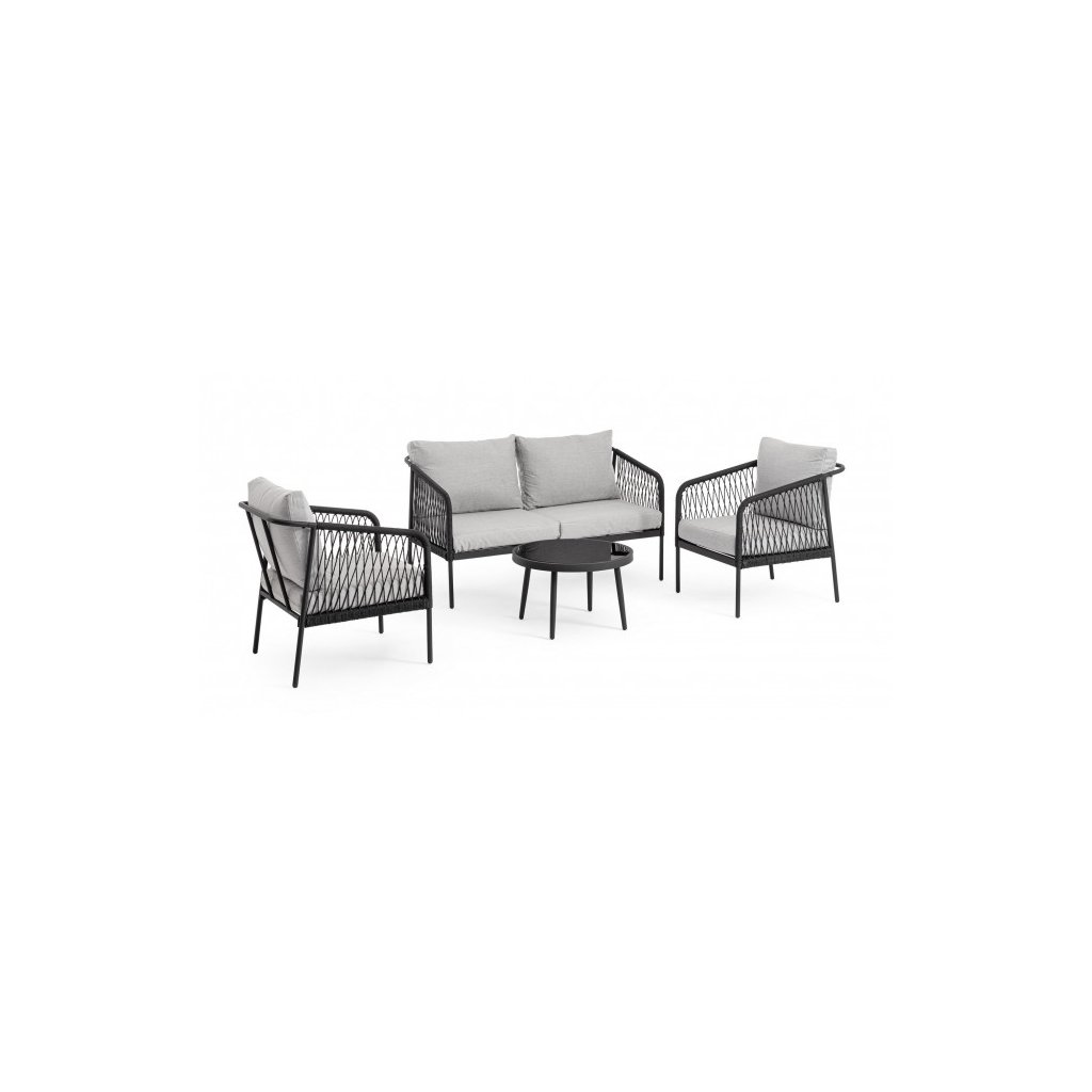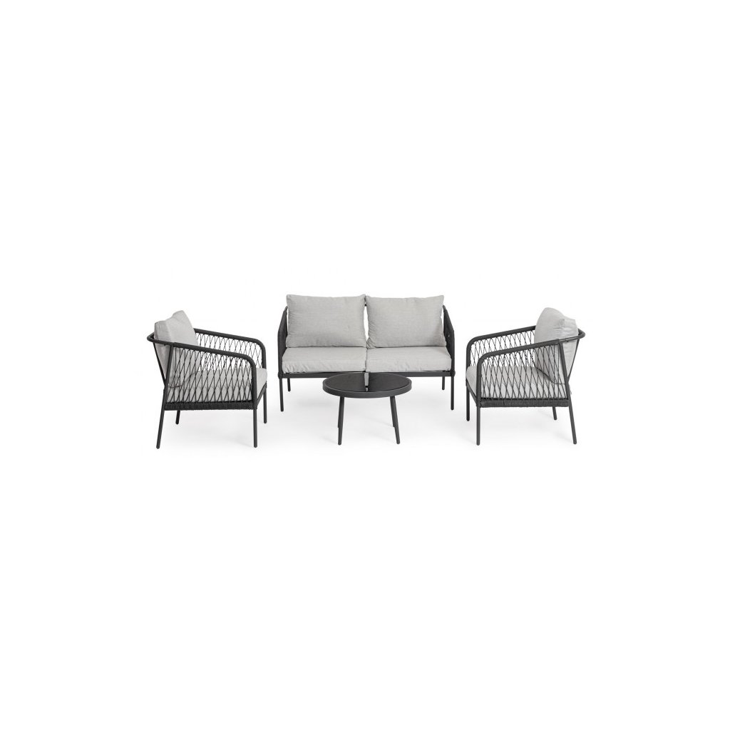 Designový zahradní set FELIPE od italského výrobce stylového nábytku BIZZOTTO. Zahradní sestavu tvoří dvoumístná pohovka, dvě křesla a  konferenční stolek. Celá sestava je vyrobena  z hliníku s práškovým nátěrem v šedém provedení.  Tkaní je vyrobeno ze syntetického vlákna. Pohovka a křesla mají sedací a opěrné polštářky ze světle šedé voděodolné látky. Křesla i pohovka jsou doplněny područkami. Stolek má skleněnou desku. Díky kvalitnímu materiálu je set odolný a lehký na manipulaci.