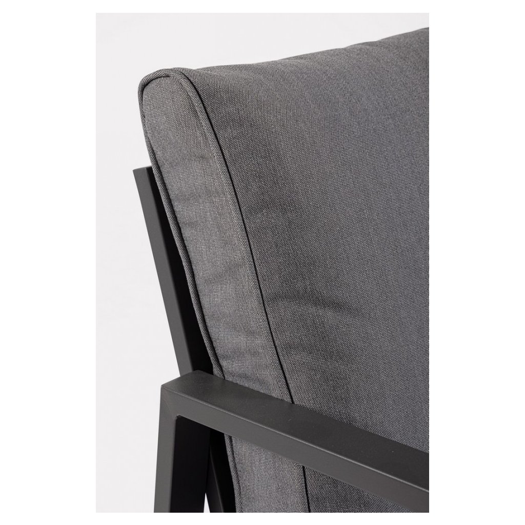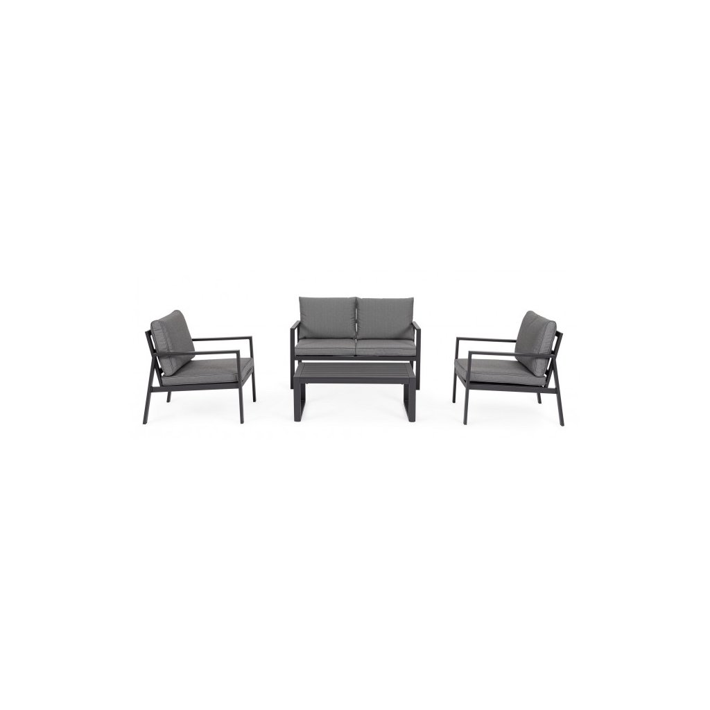 Designový zahradní set HILDE od italského výrobce stylového nábytku BIZZOTTO. Zahradní sestavu tvoří dvoumístná pohovka, dvě křesla a konferenční stolek. Celá sestava je vyrobena z hliníku s práškovým nátěrem v antracitovém provedení. Pohovka a křesla mají vyjímatelné sedací a opěrné antracitové polštářky z voděodolné látky. Díky kvalitnímu materiálu je set odolný a lehký na manipulaci.