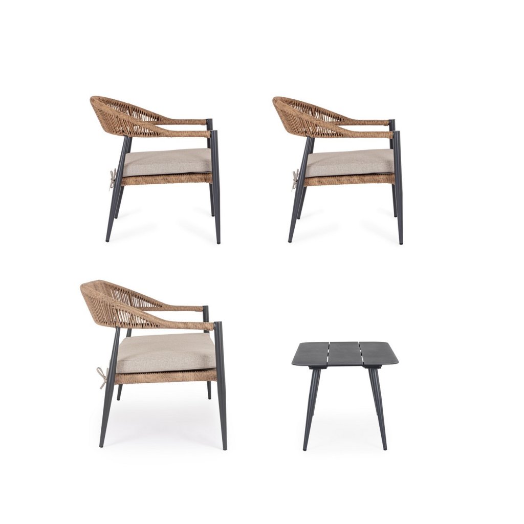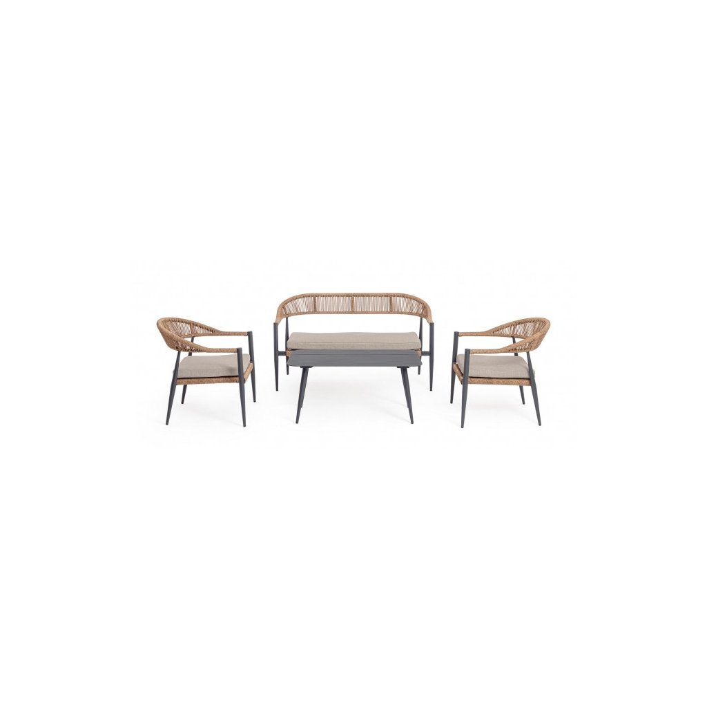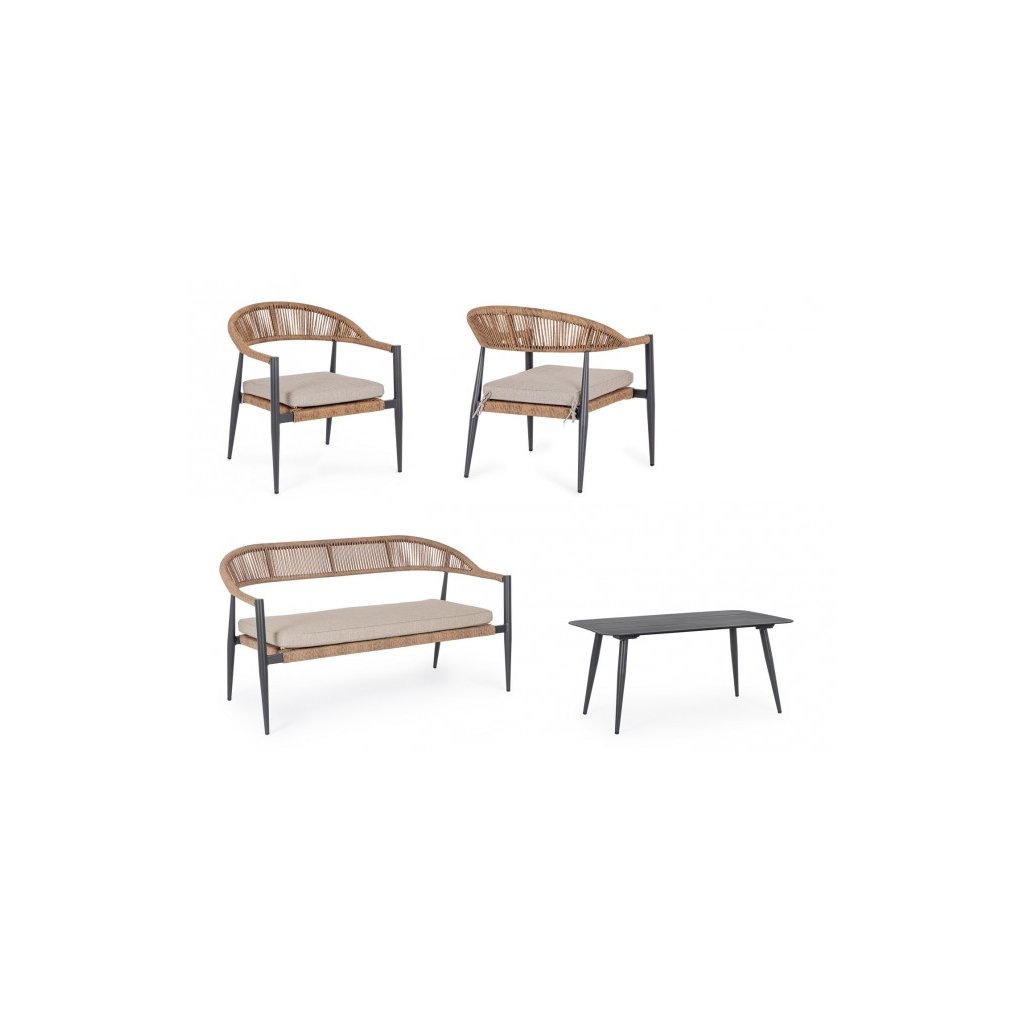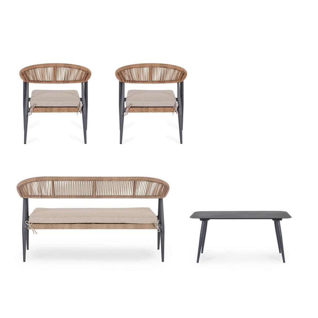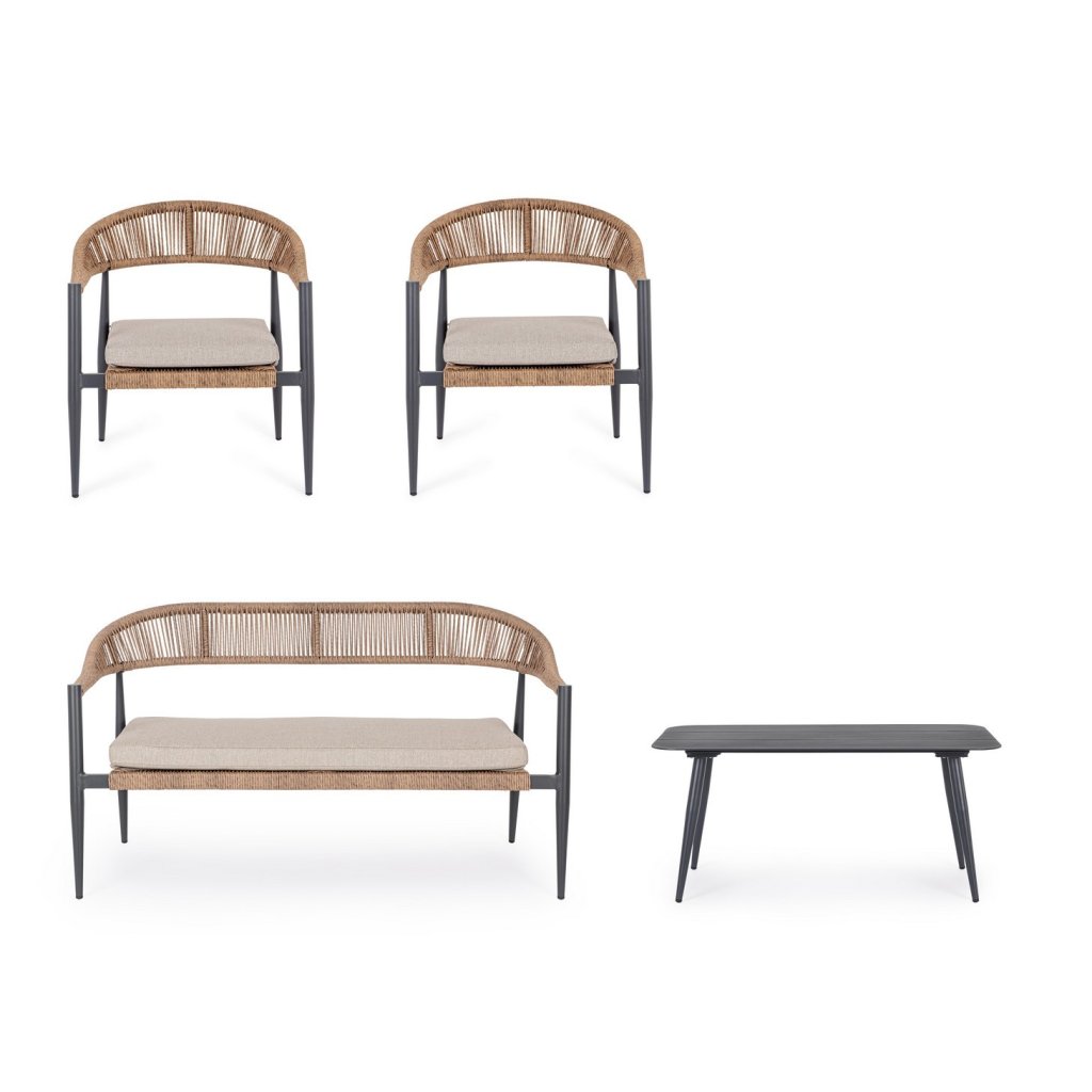 Designový zahradní set JANDIA od italského výrobce stylového nábytku BIZZOTTO. Zahradní sestavu tvoří dvoumístná pohovka, dvě křesla a  konferenční stolek. Celá sestava je vyrobena  z hliníku s práškovým nátěrem v antracitovém provedení. Konstrukce je potažena syntetickým vláknem v hnědé barvě. Pohovka a křesla mají vyjímatelné sedací a opěrné polštářky z polyesterové voděodolné látky. Díky kvalitnímu materiálu je set odolný a lehký na manipulaci.