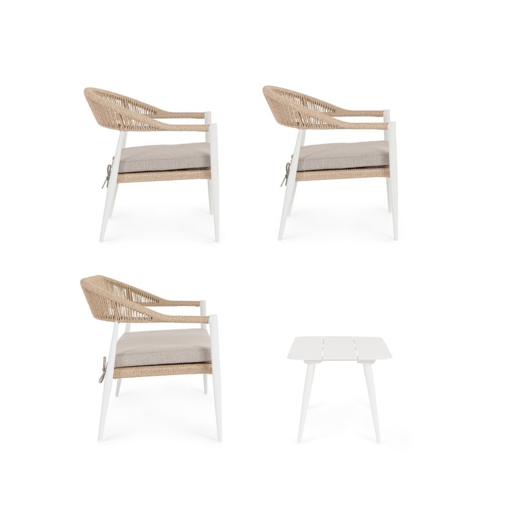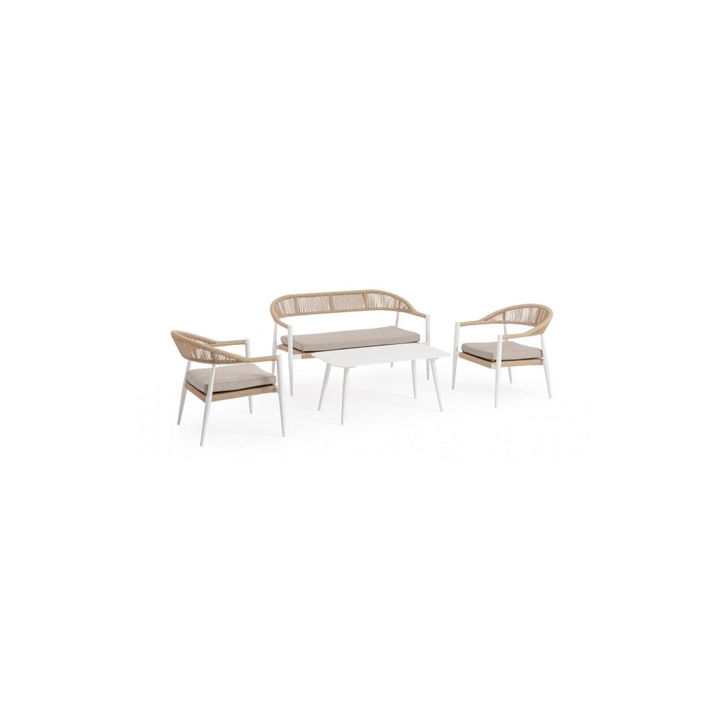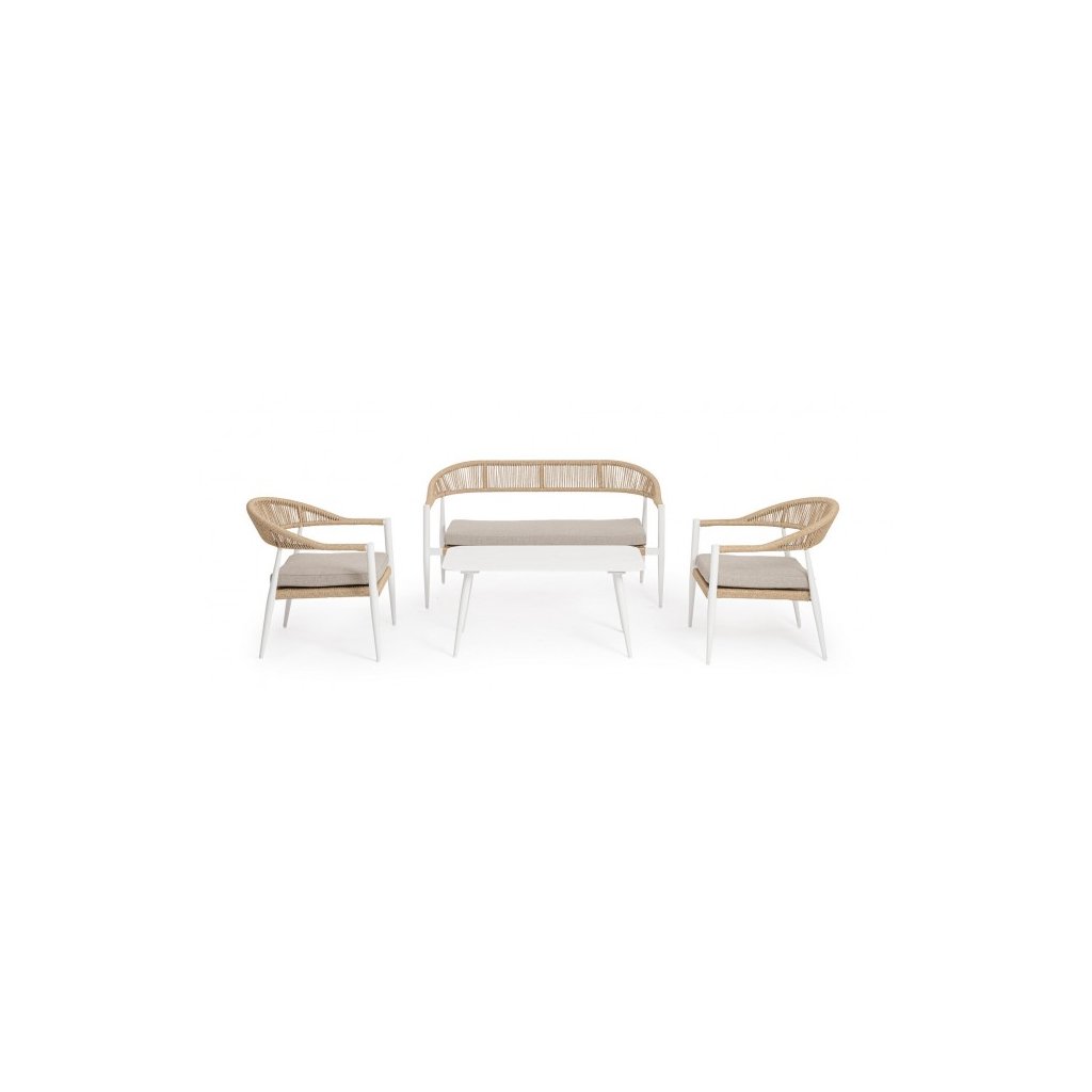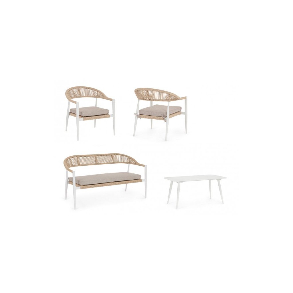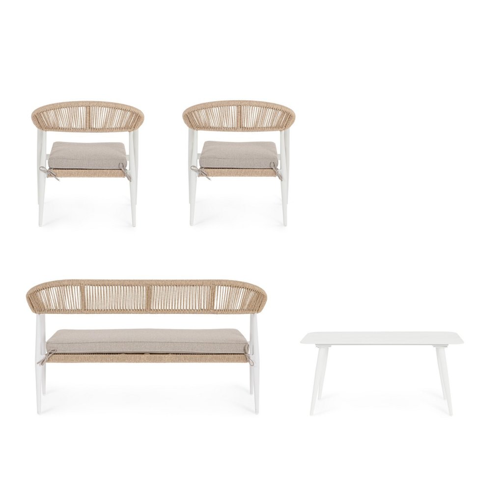 Designový zahradní set JANDIA od italského výrobce stylového nábytku BIZZOTTO. Zahradní sestavu tvoří dvoumístná pohovka, dvě křesla a  konferenční stolek. Celá sestava je vyrobena  z hliníku s práškovým nátěrem v bílém provedení. Konstrukce je potažena syntetickým vláknem v hnědé barvě. Pohovka a křesla mají vyjímatelné sedací a opěrné polštářky z polyesterové voděodolné látky. Díky kvalitnímu materiálu je set odolný a lehký na manipulaci.