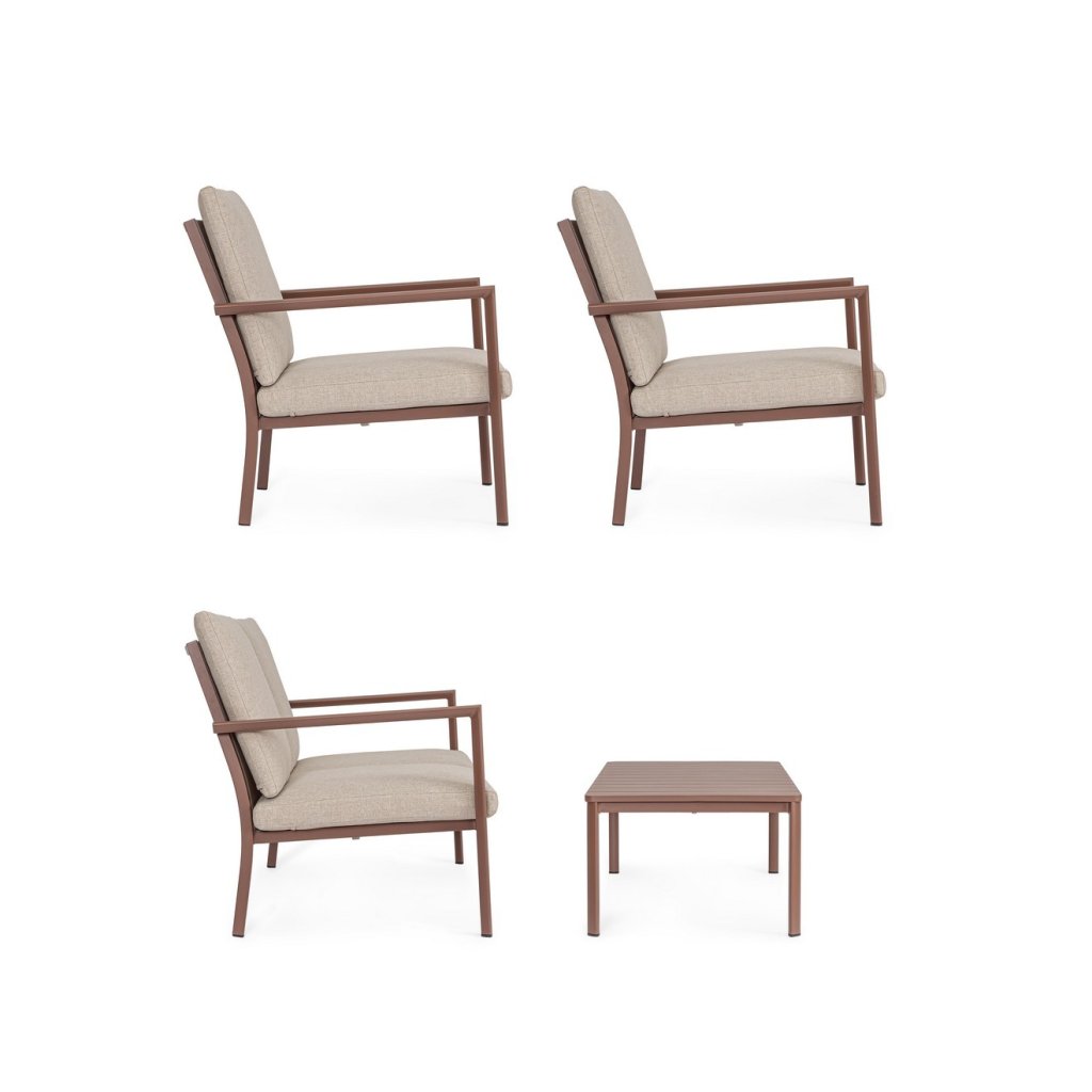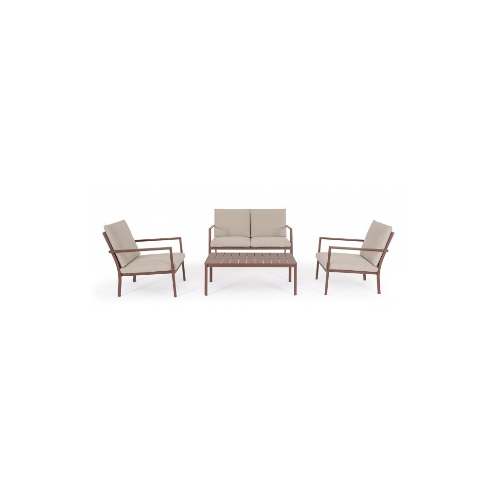 Designový zahradní set KONNOR od italského výrobce stylového nábytku BIZZOTTO. Zahradní sestavu tvoří dvoumístná pohovka, dvě křesla a  konferenční stolek. Celá sestava je vyrobena  z hliníku s práškovým nátěrem v hnědém provedení. Sedadlo a opěradlo je z textilu. Pohovka a křesla mají vyjímatelné sedací a opěrné polštářky z béžové olefinové voděodolné látky. Díky kvalitnímu materiálu je set odolný a lehký na manipulaci.