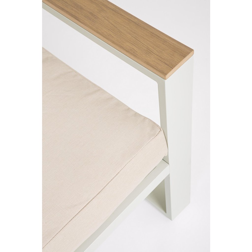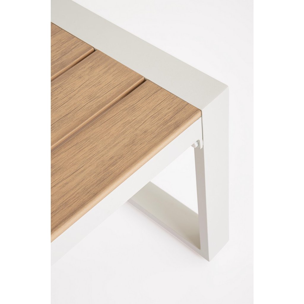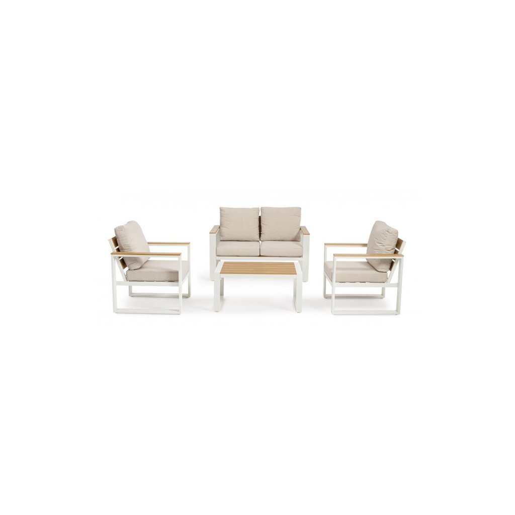 Designový zahradní set LEANDRO od italského výrobce stylového nábytku BIZZOTTO. Zahradní sestavu tvoří dvoumístná pohovka, dvě křesla a  konferenční stolek. Celá sestava je vyrobena  z hliníku s práškovým nátěrem v bílém provedení. Sedadlo a opěradlo je vyrobeno z recyklovaného plastu imitující dřevo.  Pohovka a křesla mají vyjímatelné sedací a opěrné polštářky z béžové voděodolné látky. Díky kvalitnímu materiálu je set odolný a lehký na manipulaci.
