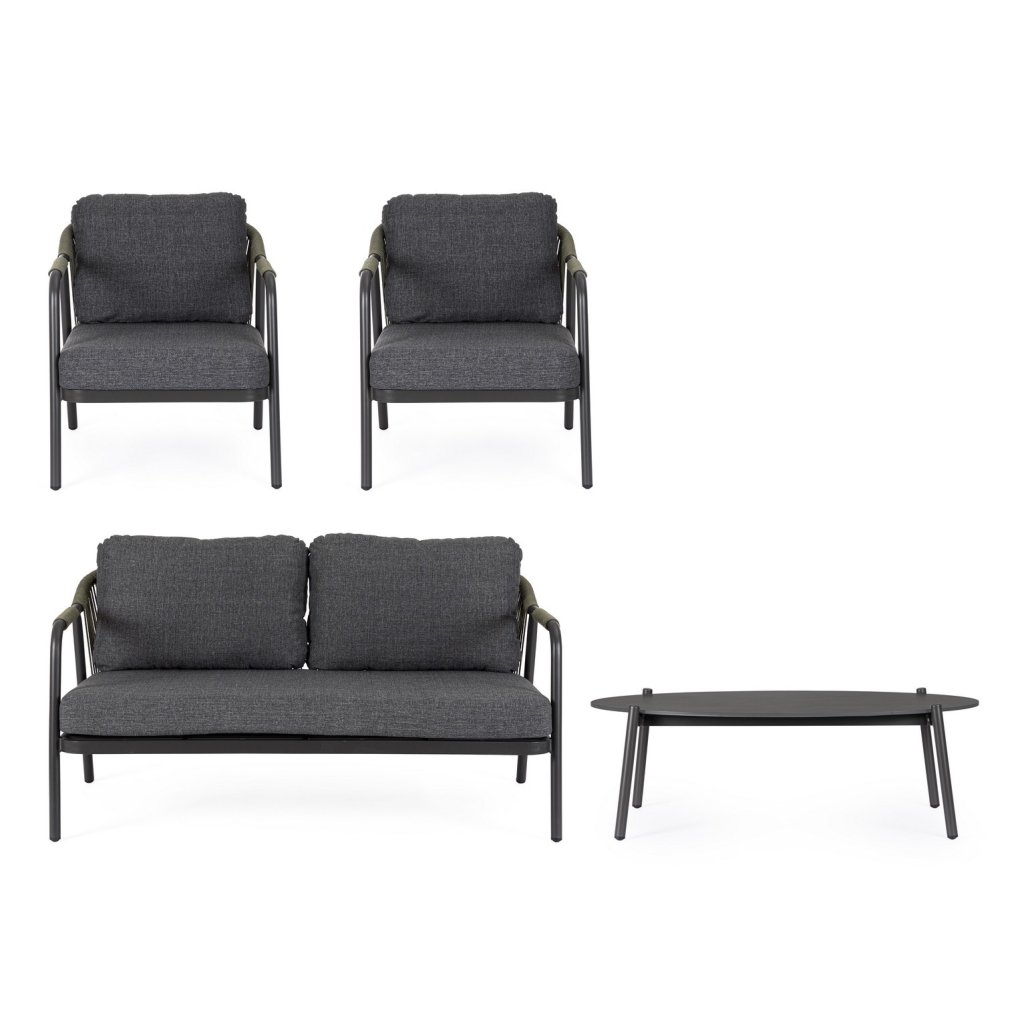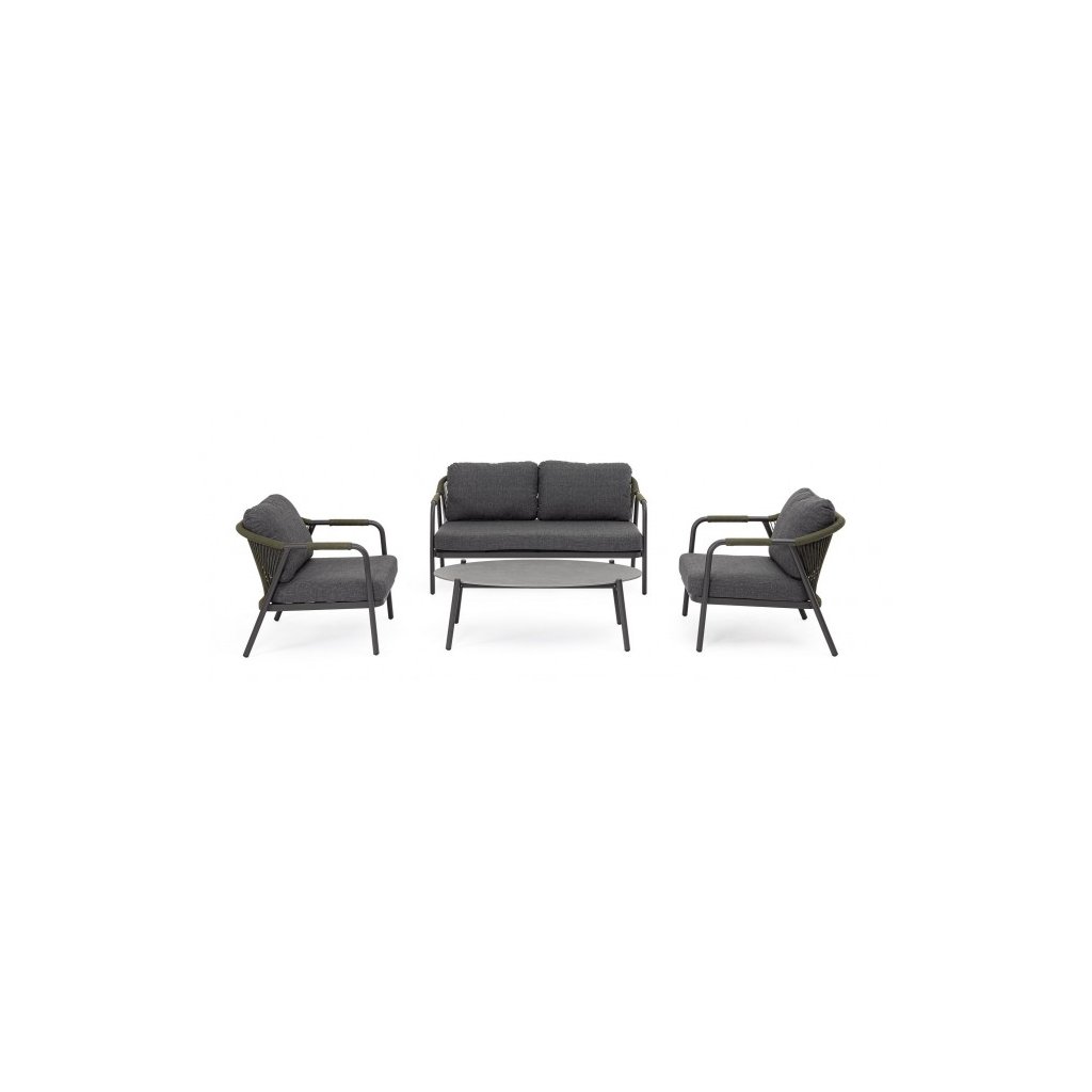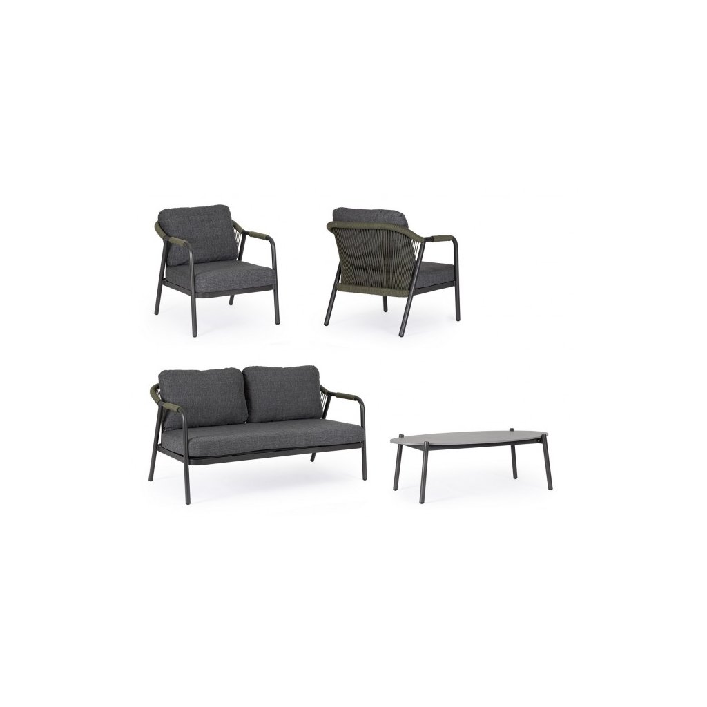 Designový zahradní set MIRAVET od italského výrobce stylového nábytku BIZZOTTO. Zahradní sestavu tvoří dvoumístná pohovka, dvě křesla a konferenční stolek. Celá sestava je vyrobena z hliníku s práškovým nátěrem v antracitovém provedení. Konstrukce je potažena polyesterovým lanem v zelené barvě. Pohovka a křesla mají vyjímatelné sedací a opěrné polštářky z polyesterové voděodolné látky. Deska stolku je vyrobená z přírodního kamene zpracovaného za vysokých teplot. Díky kvalitnímu materiálu je set odolný a lehký na manipulaci.