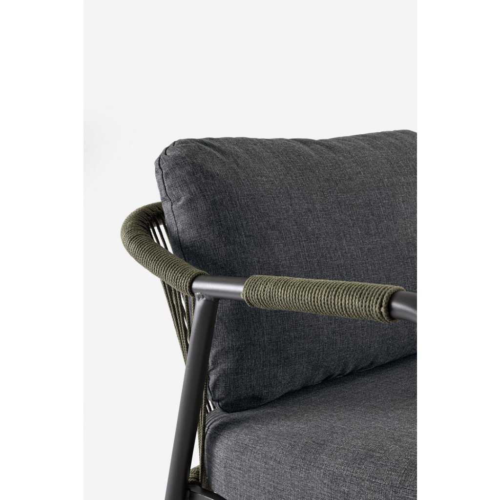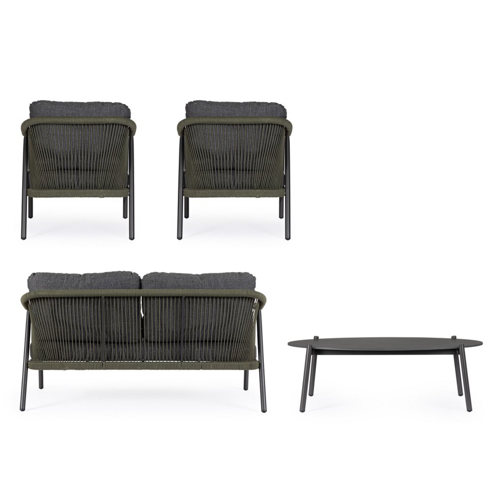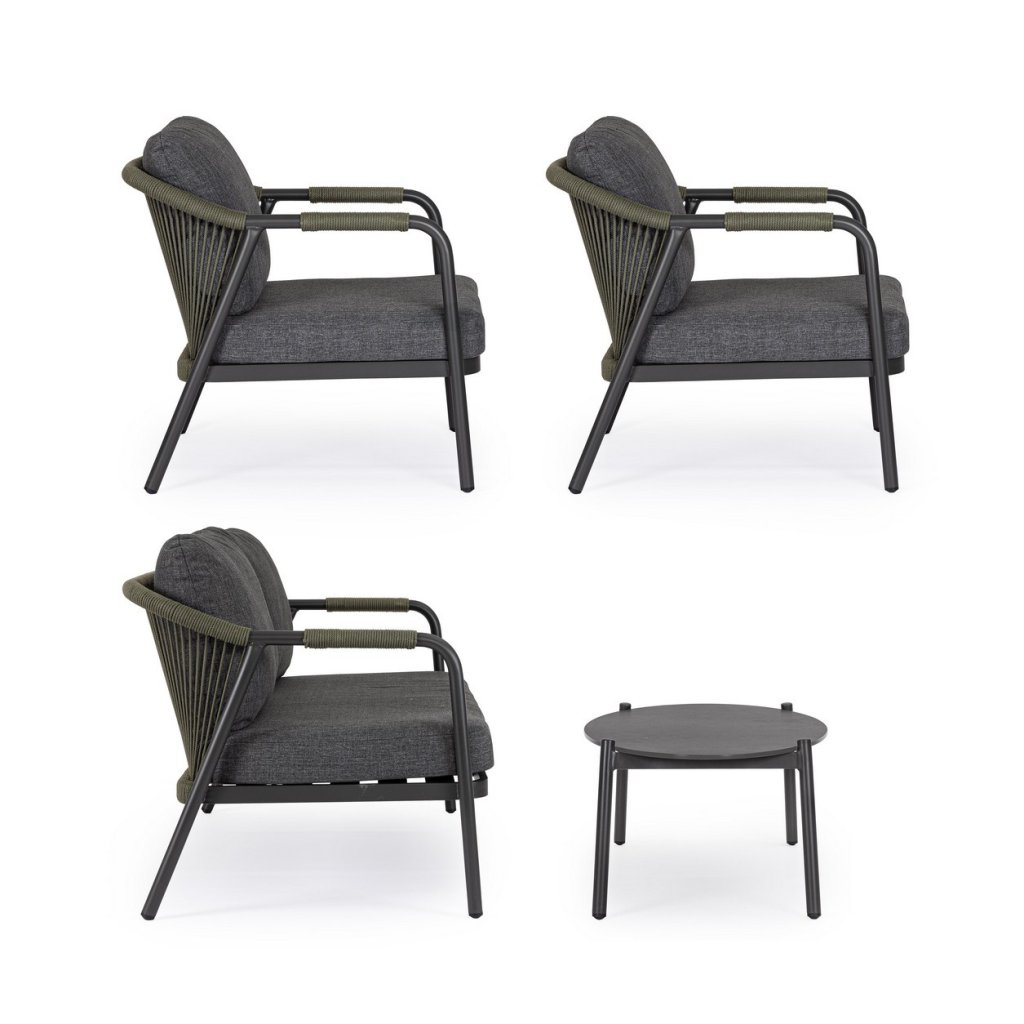 Designový zahradní set MIRAVET od italského výrobce stylového nábytku BIZZOTTO. Zahradní sestavu tvoří dvoumístná pohovka, dvě křesla a konferenční stolek. Celá sestava je vyrobena z hliníku s práškovým nátěrem v antracitovém provedení. Konstrukce je potažena polyesterovým lanem v zelené barvě. Pohovka a křesla mají vyjímatelné sedací a opěrné polštářky z polyesterové voděodolné látky. Deska stolku je vyrobená z přírodního kamene zpracovaného za vysokých teplot. Díky kvalitnímu materiálu je set odolný a lehký na manipulaci.