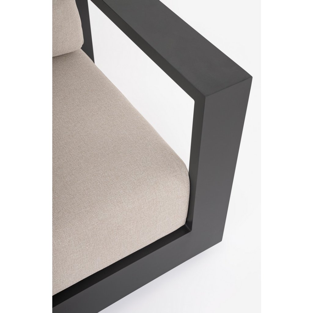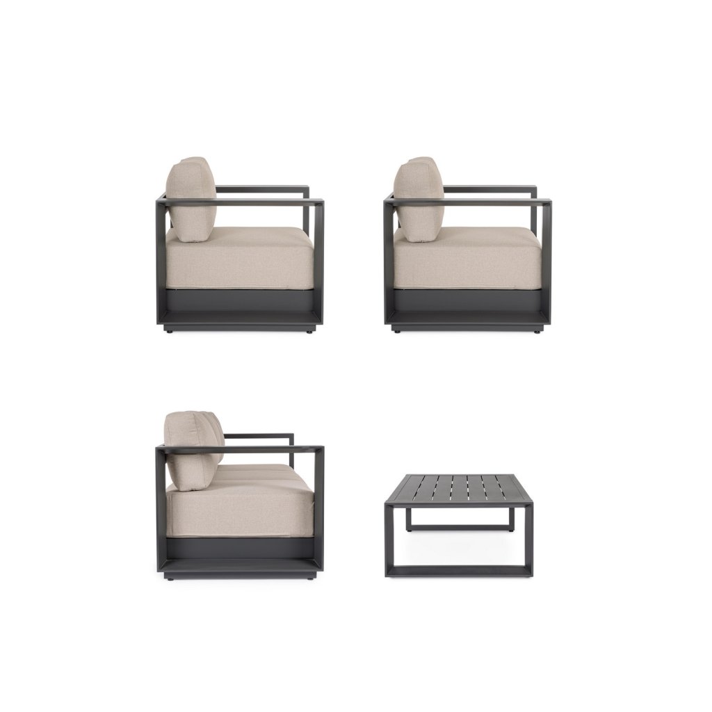 Designový zahradní set MOSES od italského výrobce stylového nábytku BIZZOTTO. Zahradní sestavu tvoří třímístná pohovka, dvě křesla a  konferenční stolek. Celá sestava je vyrobena  z hliníku s práškovým nátěrem v antracitovém provedení. Pohovka a křesla mají vyjímatelné sedací a opěrné polštářky z béžové olefinové voděodolné látky. Díky kvalitnímu materiálu je set odolný a lehký na manipulaci.