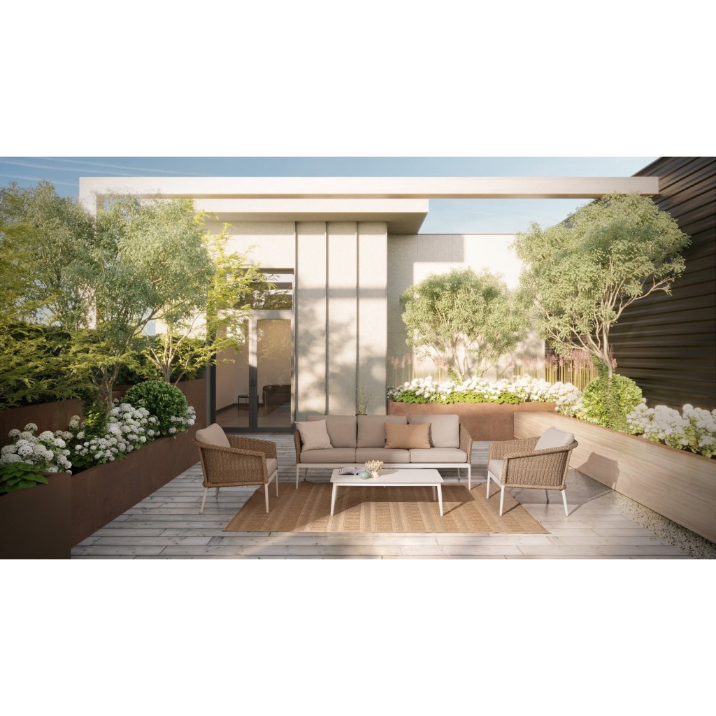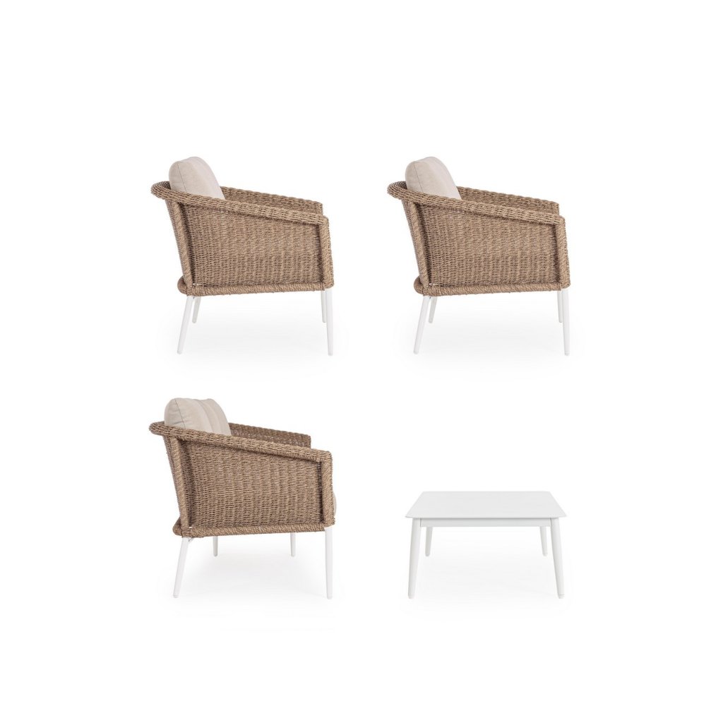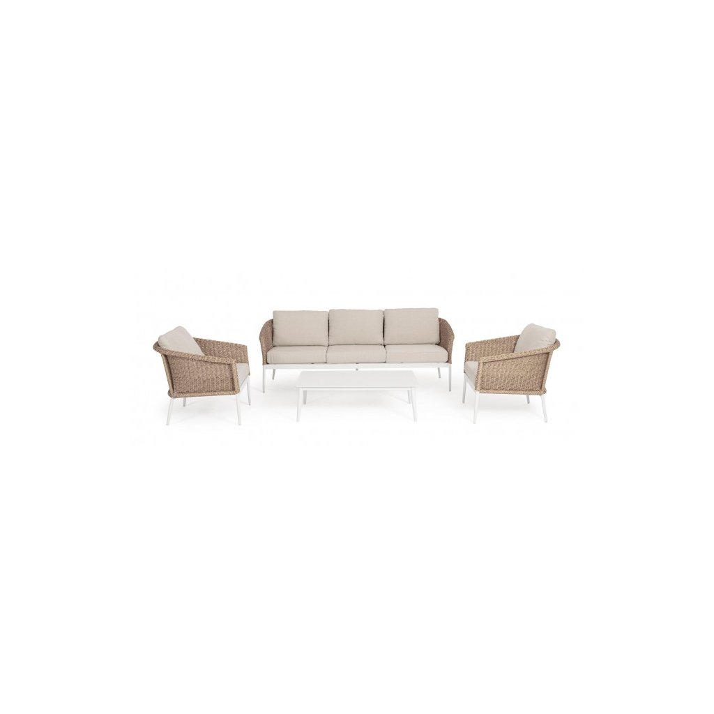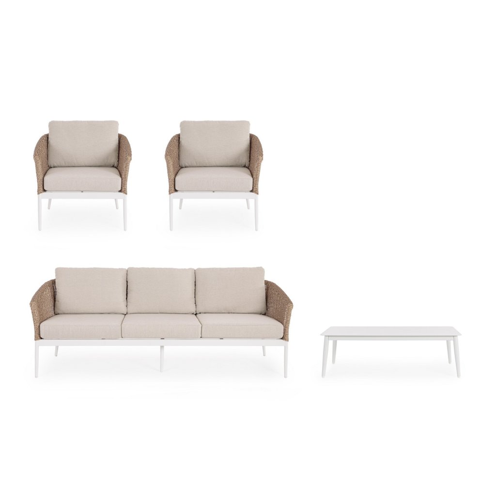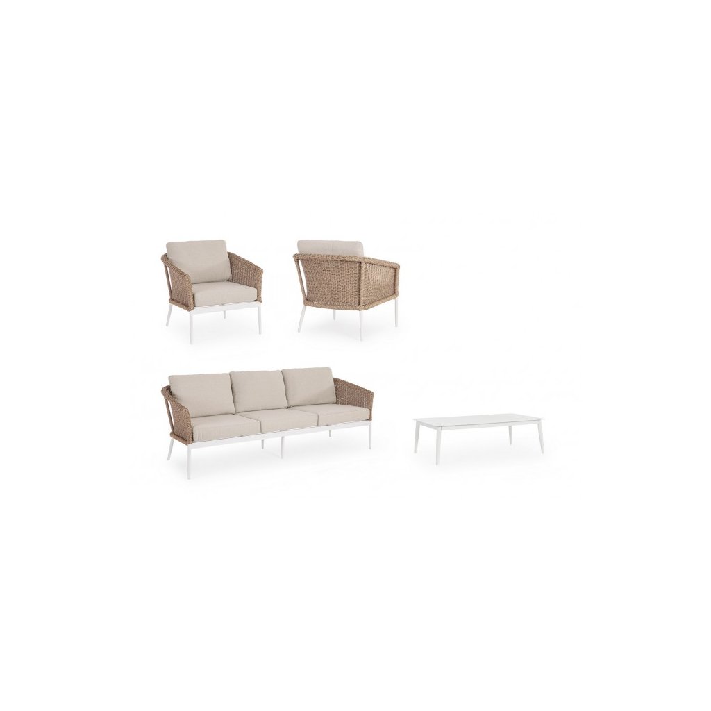 Designový zahradní set OCEANA od italského výrobce stylového nábytku BIZZOTTO. Zahradní sestavu tvoří třímístná pohovka, dvě křesla a konferenční stolek. Celá sestava je vyrobena z hliníku s práškovým nátěrem v bílém provedení. Sedadlo je potažené syntetickým vláknem. Pohovka a křesla mají vyjímatelné sedací a opěrné polštářky z béžové voděodolné látky. Díky kvalitnímu materiálu je set odolný a lehký na manipulaci.
