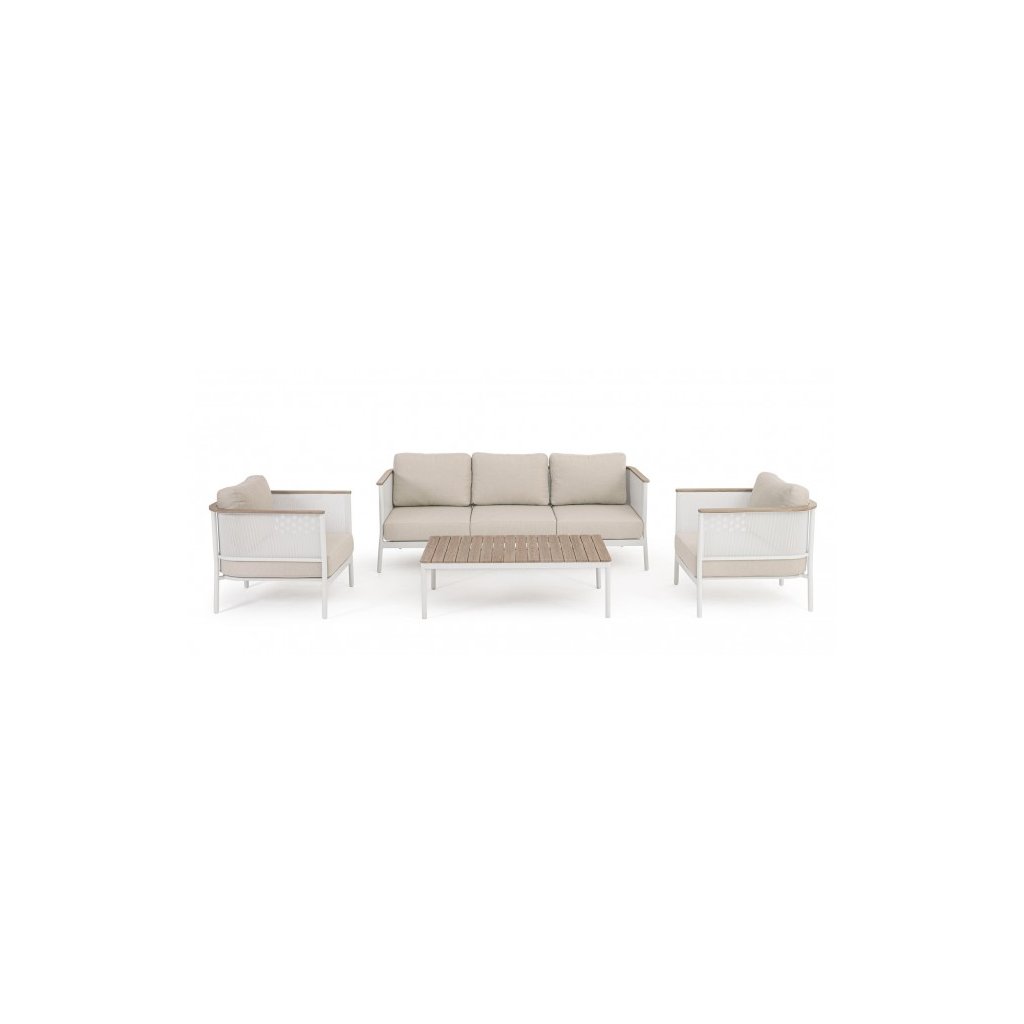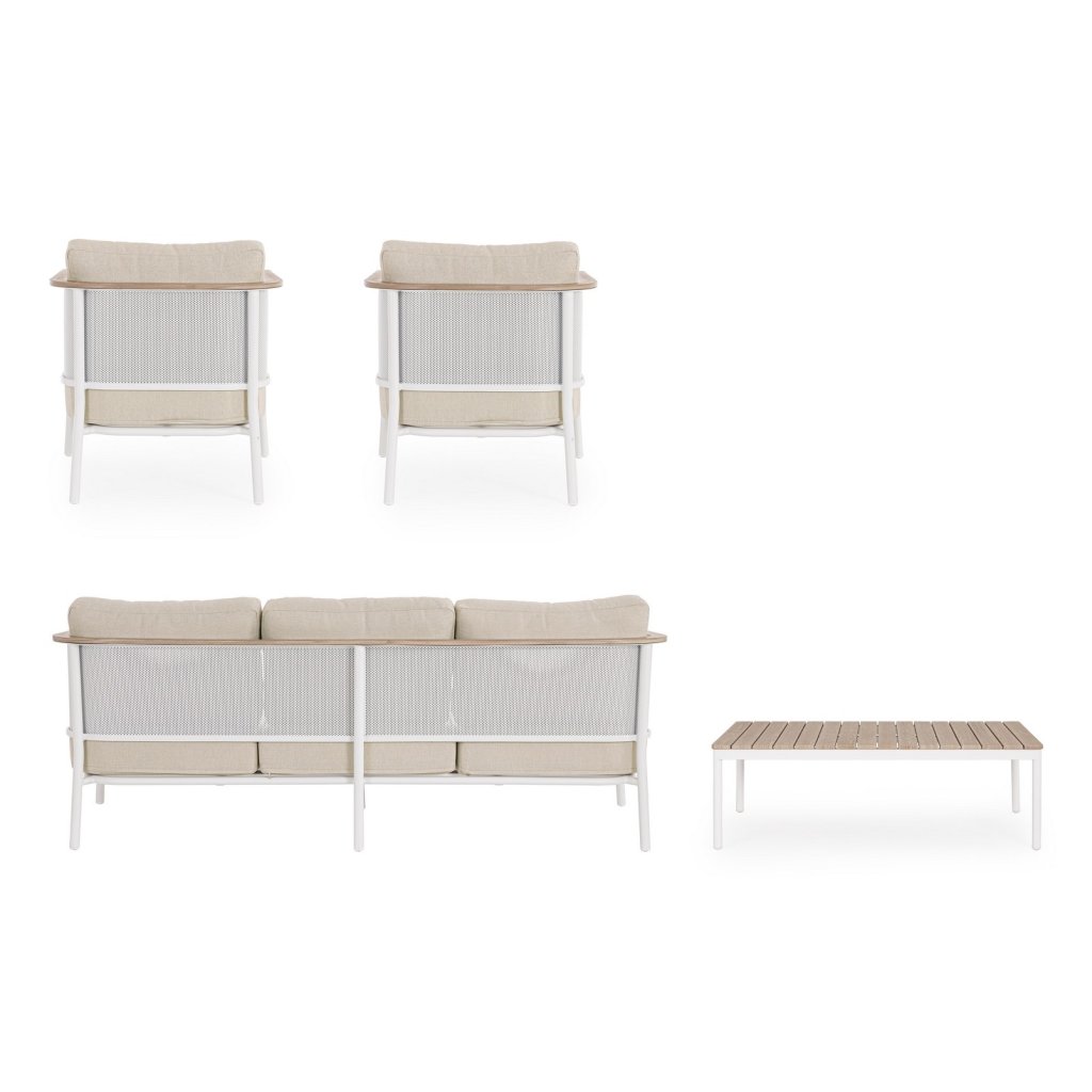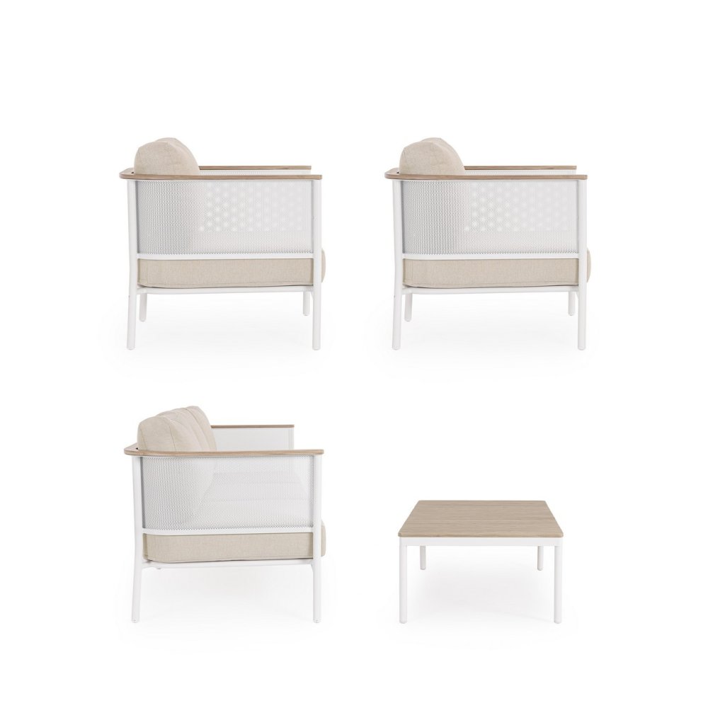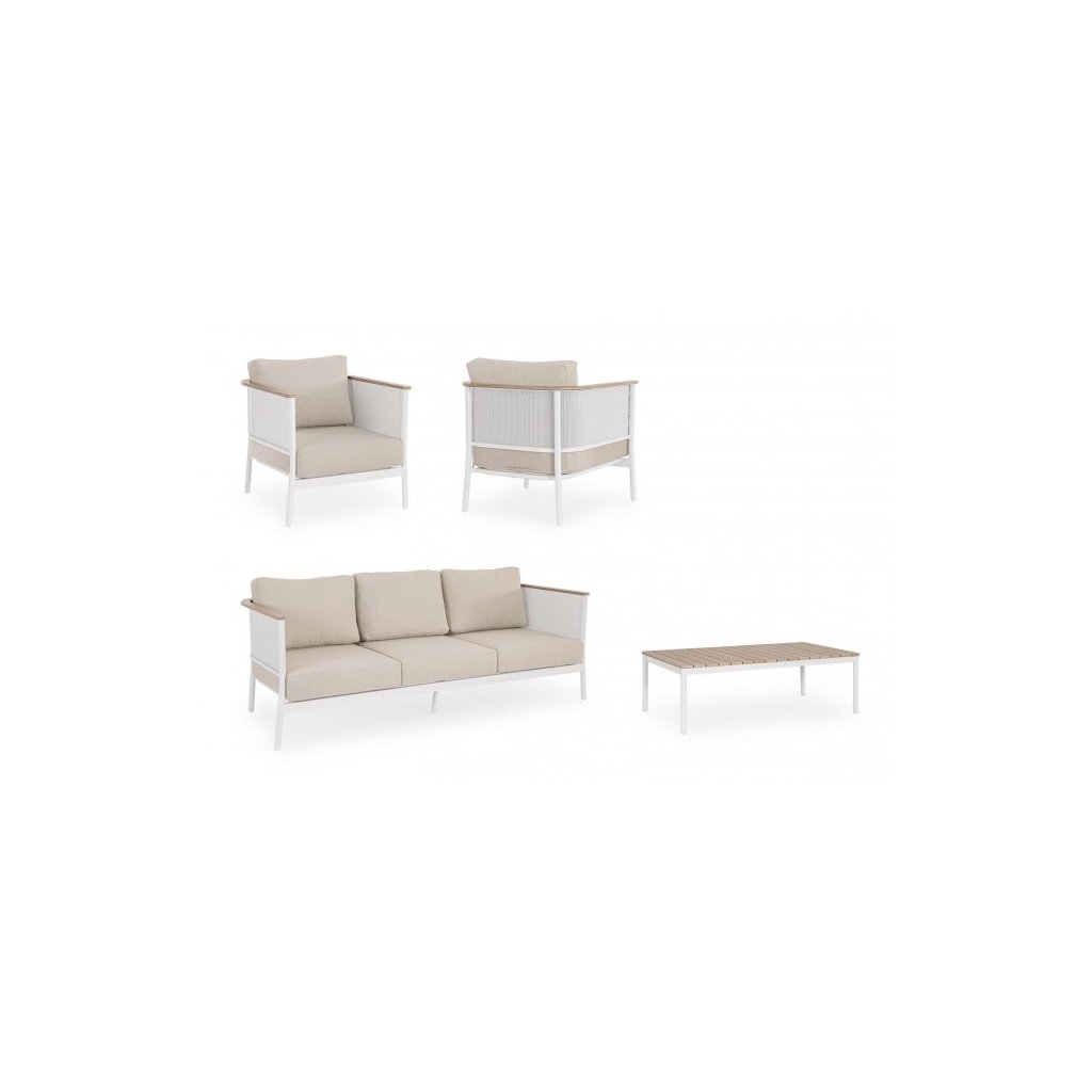 Designový zahradní set ULISES od italského výrobce stylového nábytku BIZZOTTO. Zahradní sestavu tvoří třímístná pohovka, dvě křesla a konferenční stolek. Celá sestava je vyrobena z hliníku s práškovým nátěrem v bílém provedení. Područky a konferenční stolek jsou vyrobeny z hliníku s dřevěným efektem. Pohovka a křesla mají vyjímatelné sedací a opěrné polštářky z béžové olefinové voděodolné látky. Díky kvalitnímu materiálu je set odolný a lehký na manipulaci.