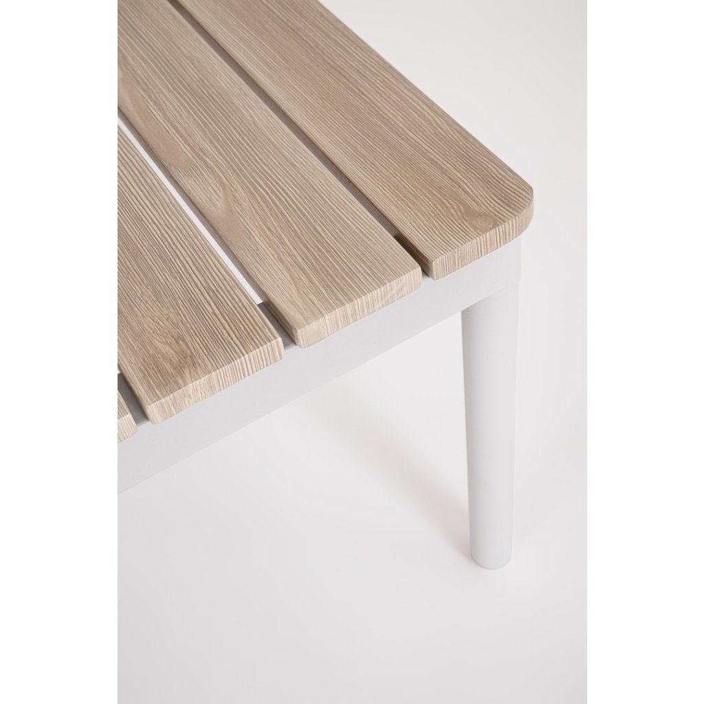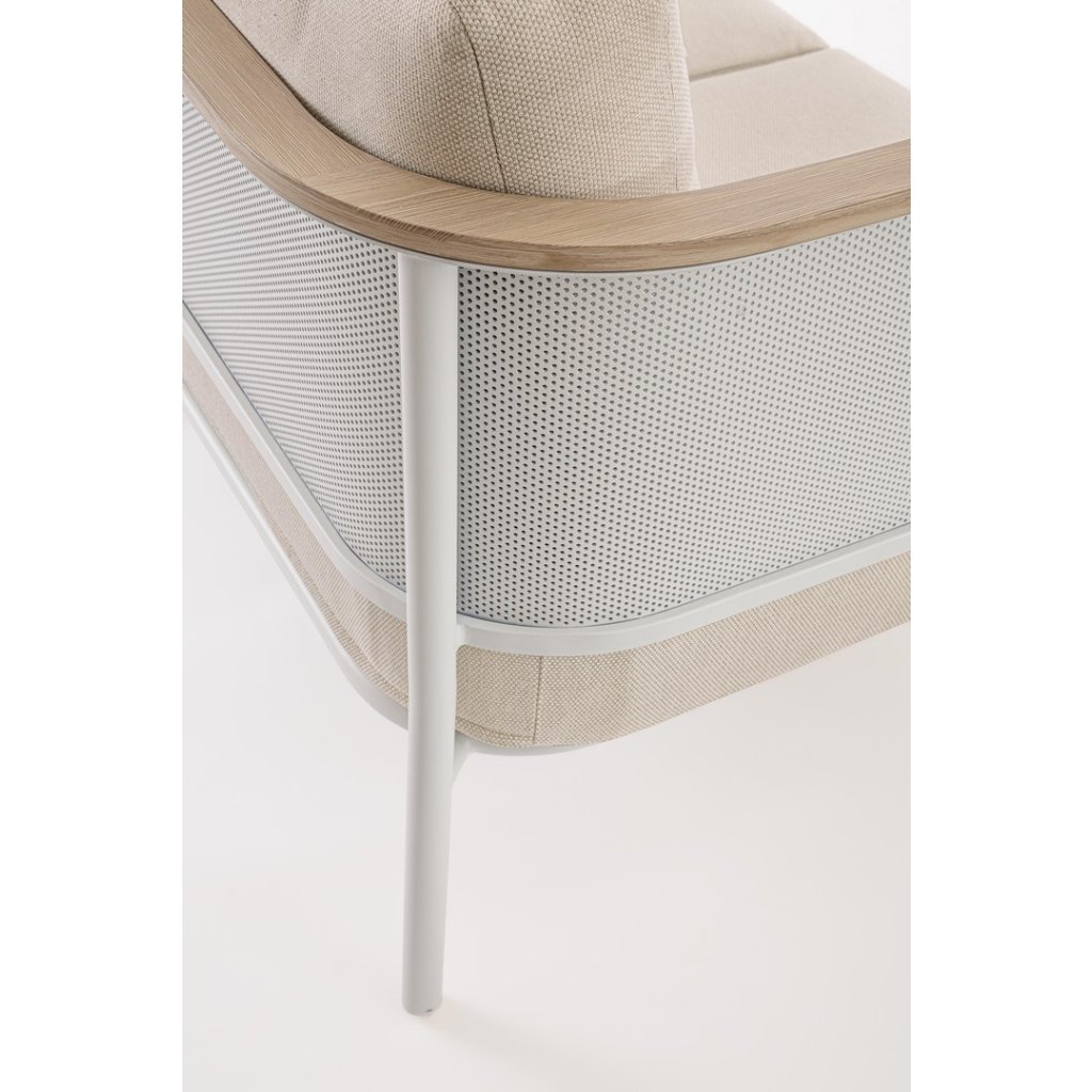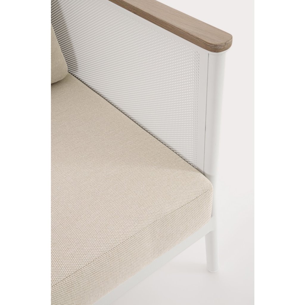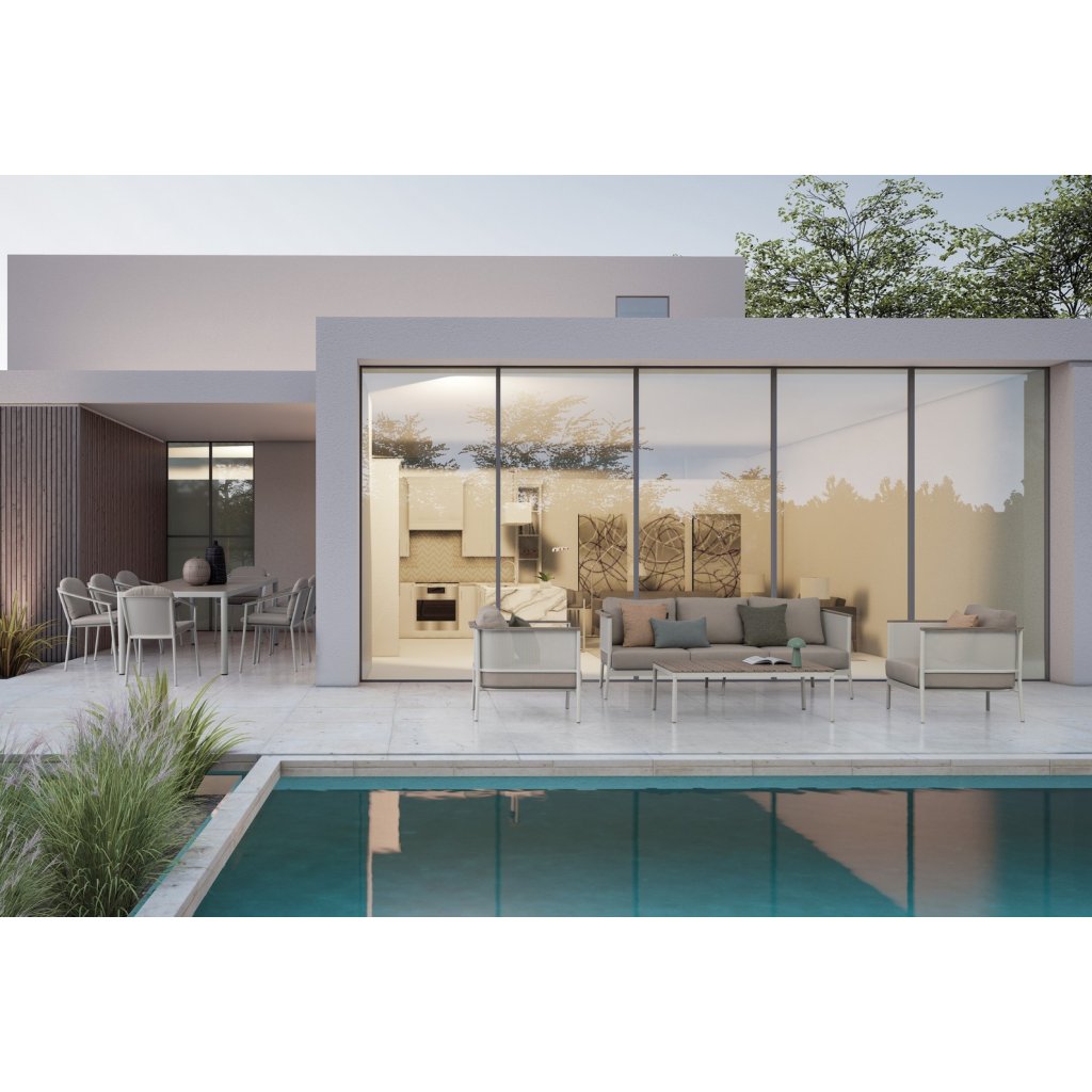 Designový zahradní set ULISES od italského výrobce stylového nábytku BIZZOTTO. Zahradní sestavu tvoří třímístná pohovka, dvě křesla a konferenční stolek. Celá sestava je vyrobena z hliníku s práškovým nátěrem v bílém provedení. Područky a konferenční stolek jsou vyrobeny z hliníku s dřevěným efektem. Pohovka a křesla mají vyjímatelné sedací a opěrné polštářky z béžové olefinové voděodolné látky. Díky kvalitnímu materiálu je set odolný a lehký na manipulaci.