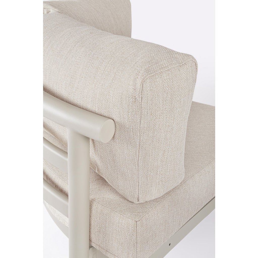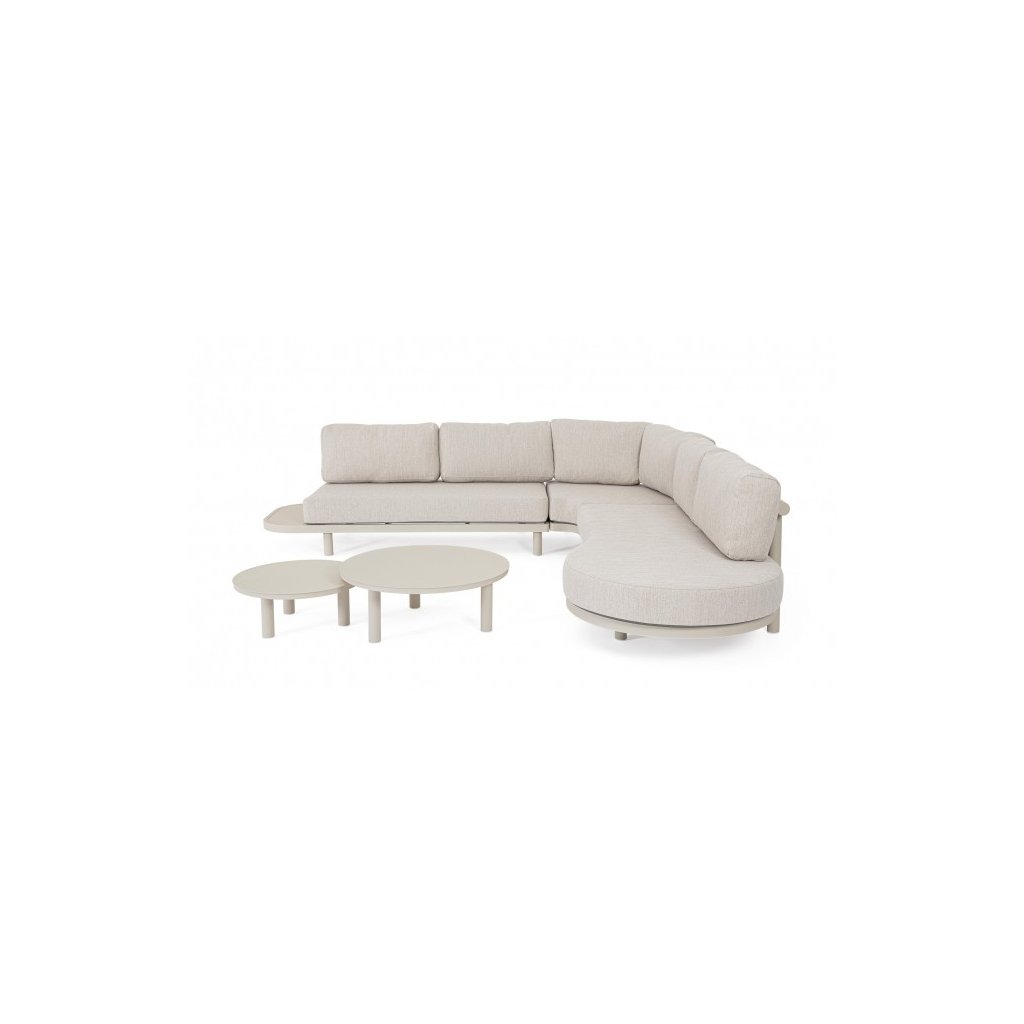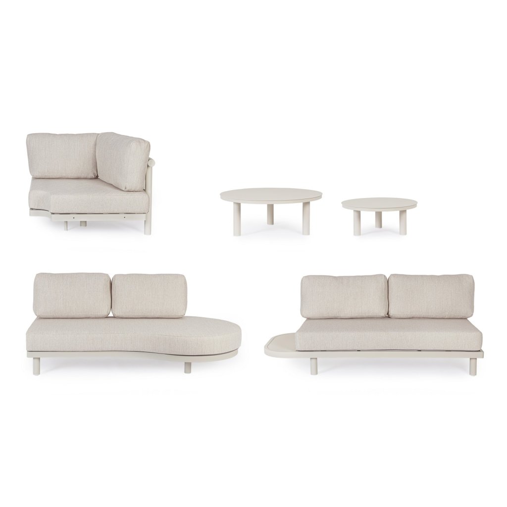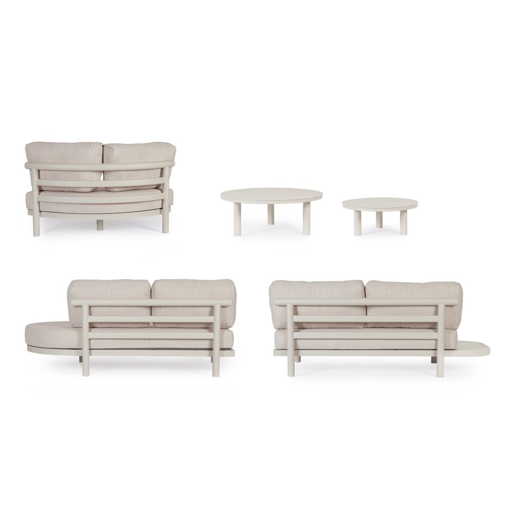 Designový zahradní set HERCULES od italského výrobce stylového nábytku BIZZOTTO. Zahradní sestavu tvoří rohová pětimístná pohovka a dva kulaté konferenční stolky ve dvou různých velikostech. Celá sestava je vyrobena z hliníku s práškovým nátěrem ve světlém provedení. Pohovka má sedací a opěrné béžové polštářky z voděodolné olefinové látky. Potahy polštářků jsou snímatelné. Díky kvalitnímu materiálu je set odolný a lehký na manipulaci.