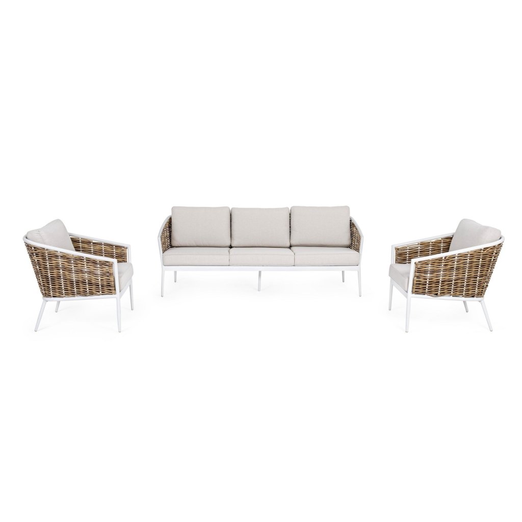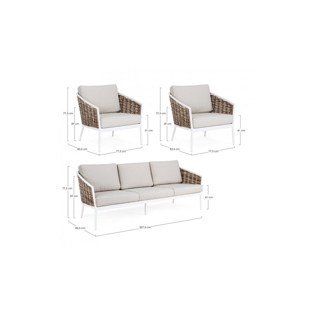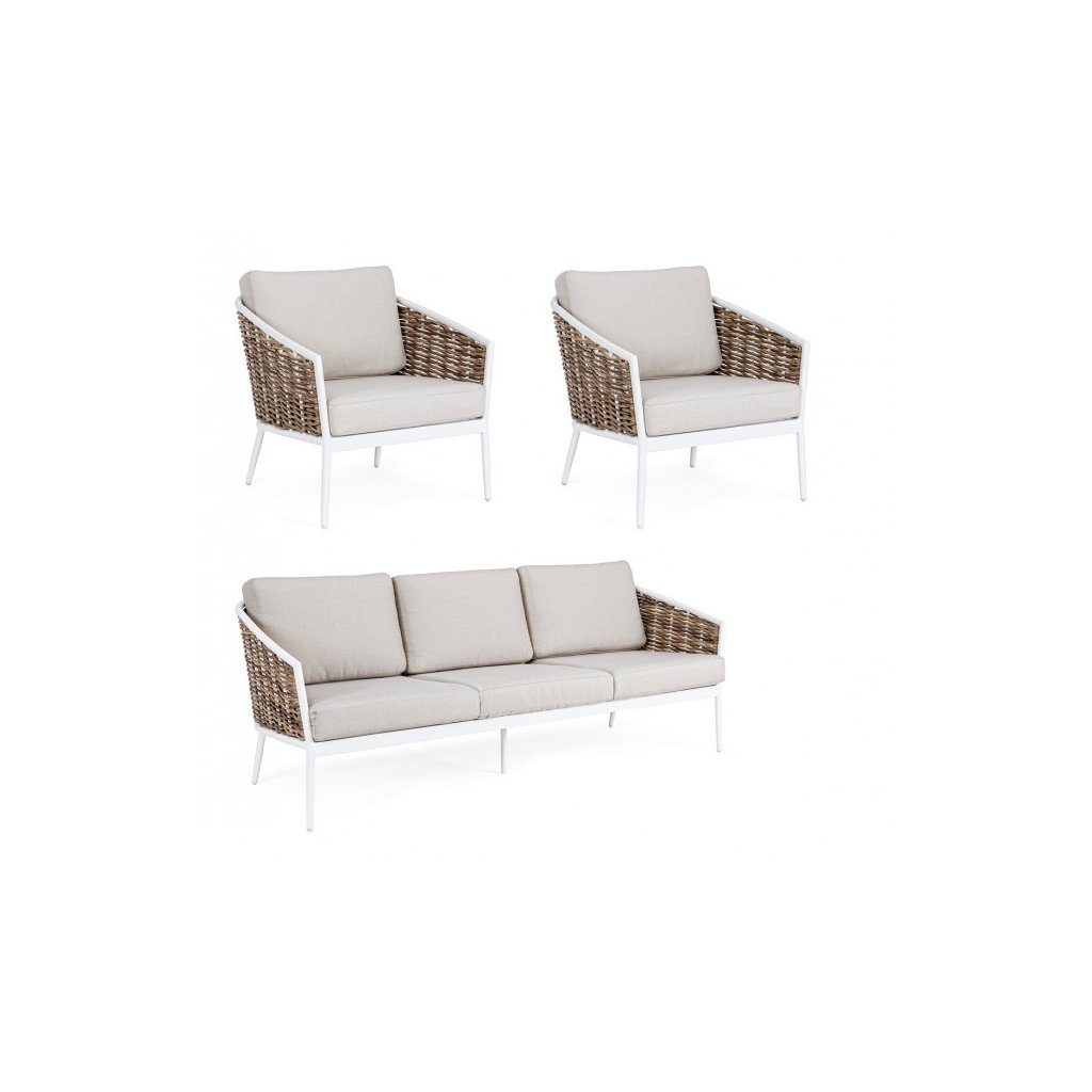 Designový set pohovky a křesel MARIBELA od italského výrobce stylového nábytku BIZZOTTO. Set se skládá z třímístné pohovky, a dvou křesílek. Pohovky a křeslo jsou doplněny polštářky pro větší komfort. Celé vyrobeno z konstrukce z hliníku v bílém odstínu, takže konstrukce je pevná a odolná vůči vnějším vlivům. Po bocích a zádech je krásné vyplétání z umělého ratanu. Set doplňují odnímatelné polštáře v šedé barvě z odolného olefinu, který je voděodolný a taktéž odolný vůči UV záření. Ideální tedy pro vaši zahradu či terasu. Díky své velikosti se na ni krásně vleze celá velká rodina.