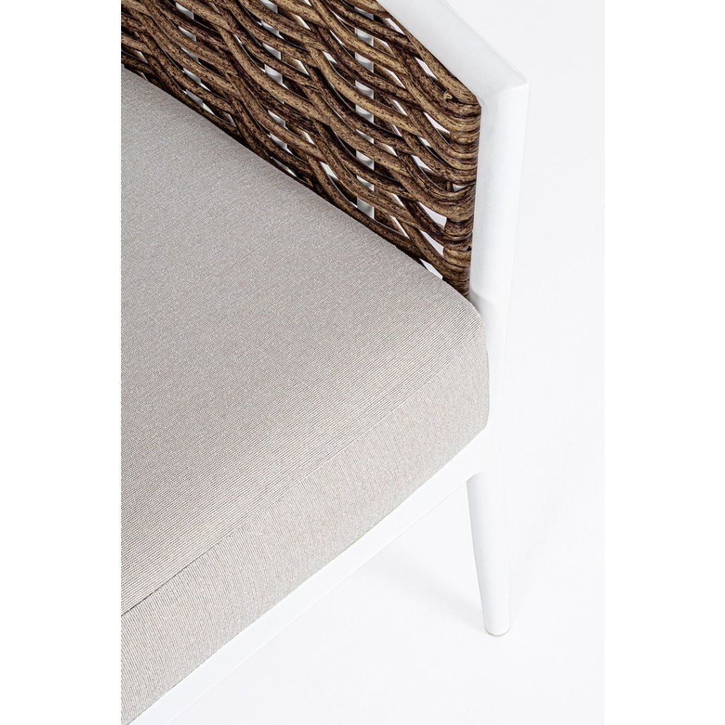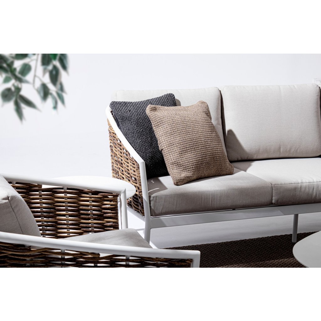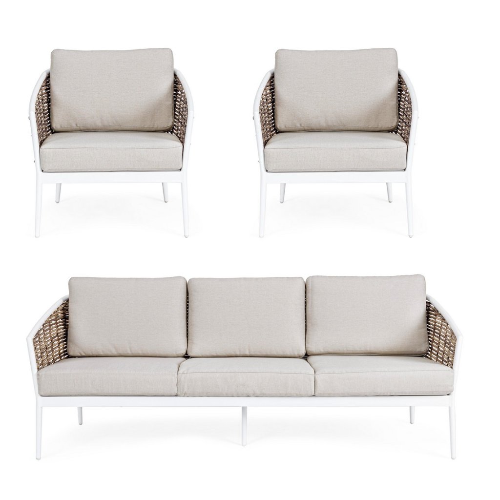 Designový set pohovky a křesel MARIBELA od italského výrobce stylového nábytku BIZZOTTO. Set se skládá z třímístné pohovky, a dvou křesílek. Pohovky a křeslo jsou doplněny polštářky pro větší komfort. Celé vyrobeno z konstrukce z hliníku v bílém odstínu, takže konstrukce je pevná a odolná vůči vnějším vlivům. Po bocích a zádech je krásné vyplétání z umělého ratanu. Set doplňují odnímatelné polštáře v šedé barvě z odolného olefinu, který je voděodolný a taktéž odolný vůči UV záření. Ideální tedy pro vaši zahradu či terasu. Díky své velikosti se na ni krásně vleze celá velká rodina.