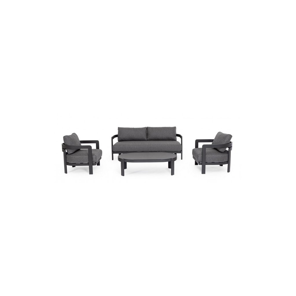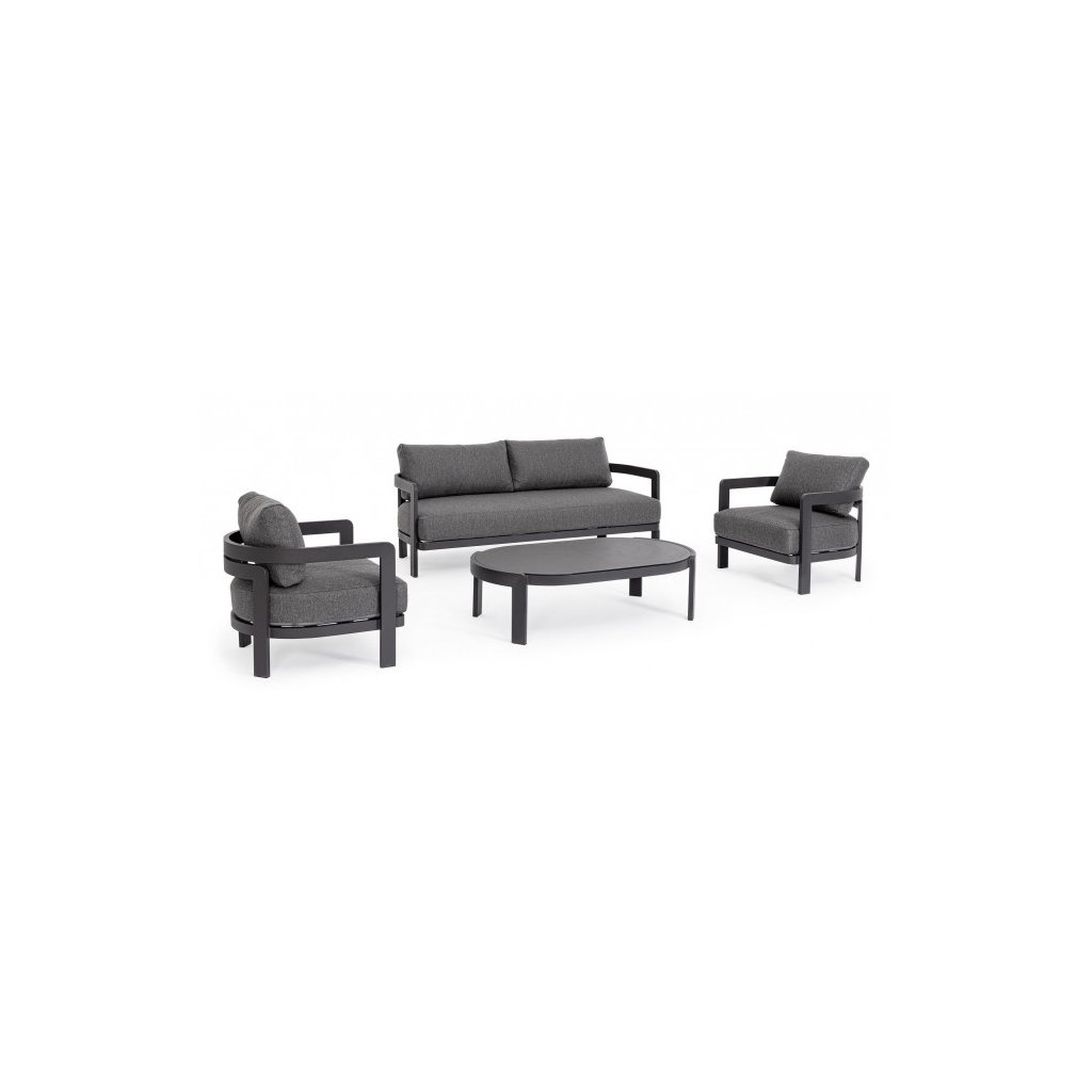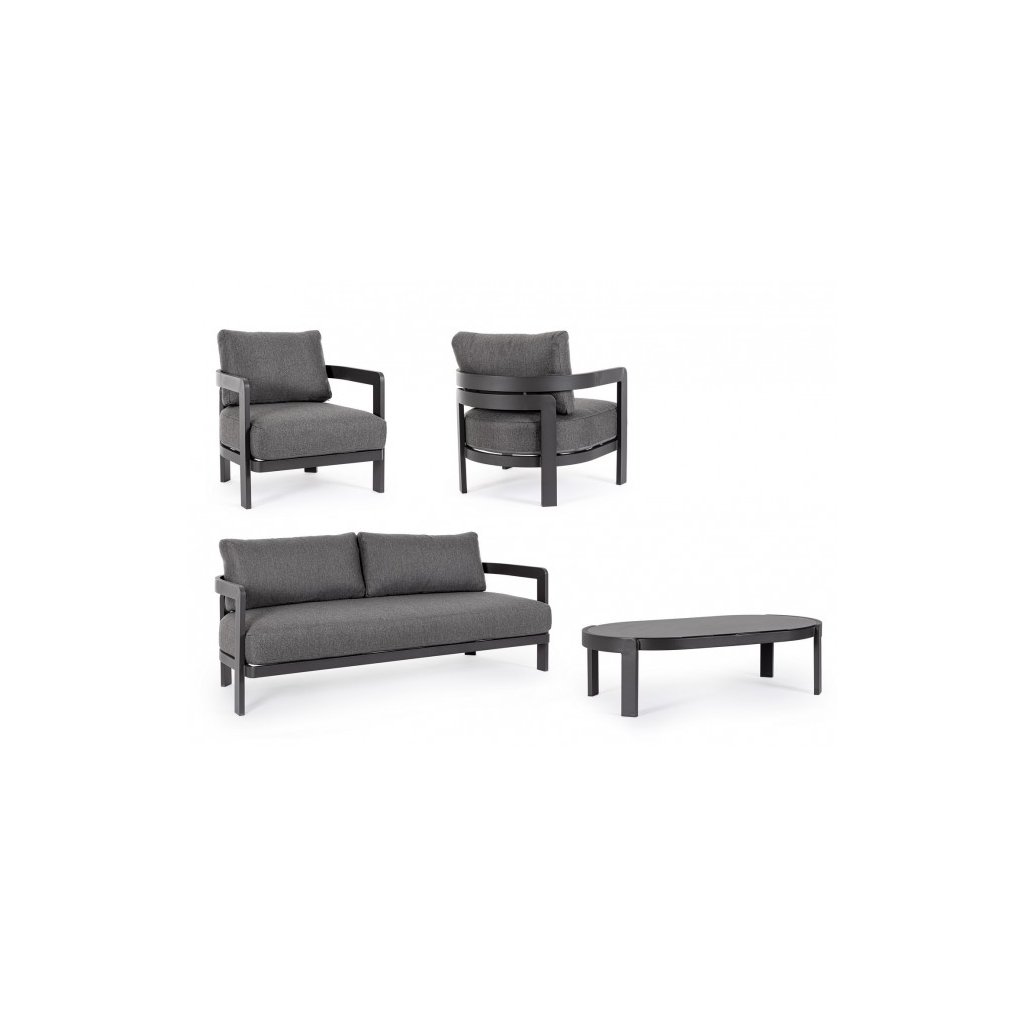 Designový zahradní set PRESLEY od italského výrobce stylového nábytku BIZZOTTO. Zahradní sestavu tvoří dvoumístná pohovka a dvě křesla. Zahradní set má hliníkový rám s černým práškovým nátěrem. Velmi stylové polštáře s odnímatelným potahem jsou z olefinové látky v tmavě šedém provedení. Pohovku a křesla doplňuje konferenční stolek s potištěnou skleněnou deskou. Zahradní set bude skvělou volbou pro vaše terasy, zahrady či balkón.