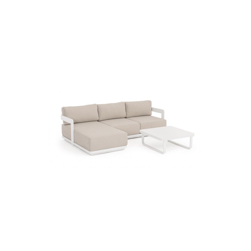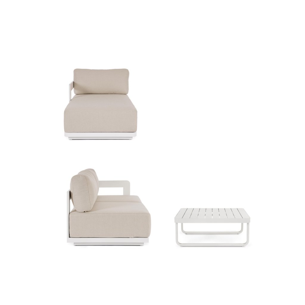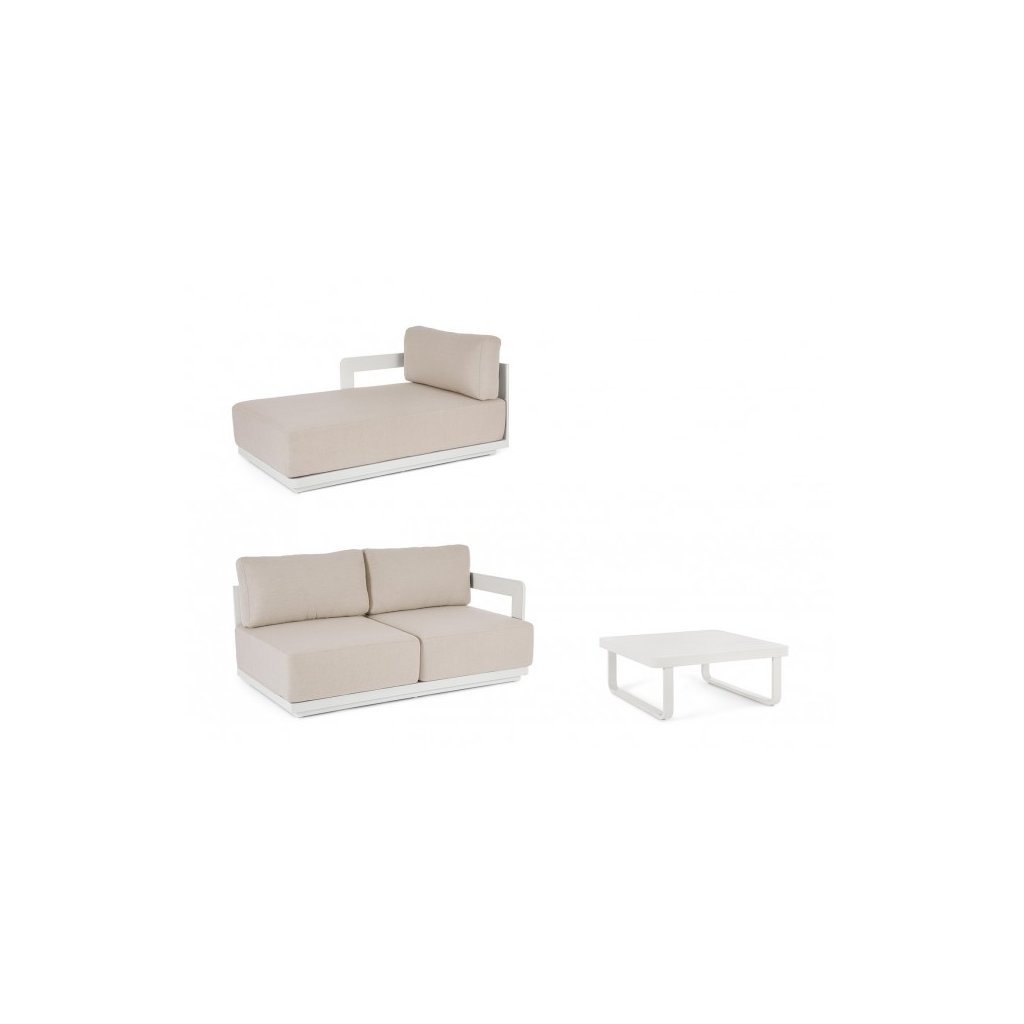 Designový zahradní set MARIEL od italského výrobce stylového nábytku BIZZOTTO. Zahradní sestavu tvoří třímístná rohová pohovka a konferenční stolek. Celá sestava je vyrobena z hliníku s práškovým nátěrem v bílém provedení. Pohovka má vyjímatelné sedací a opěrné polštářky z béžové olefinové voděodolné látky. Díky kvalitnímu materiálu je set odolný a lehký na manipulaci.