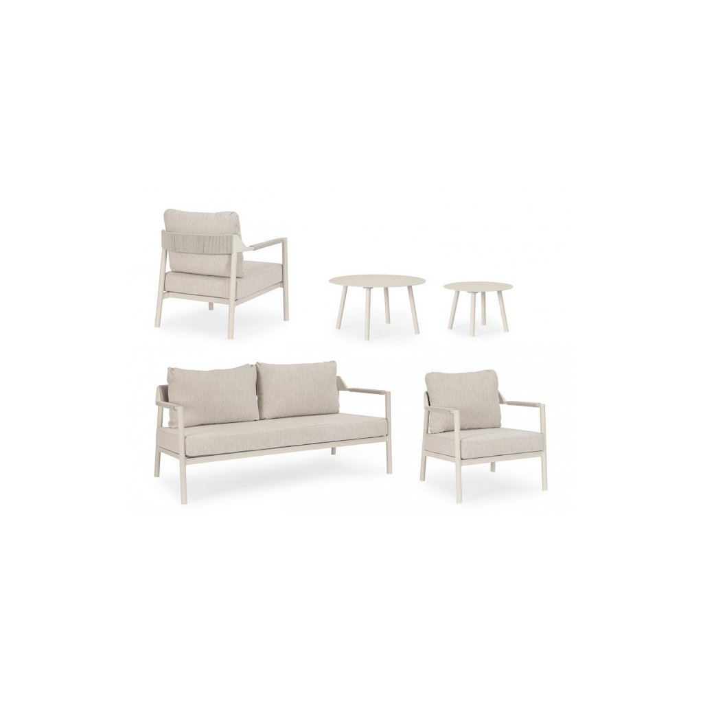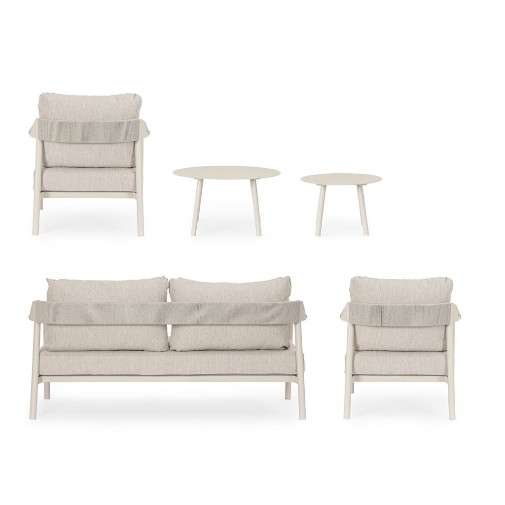 Designový zahradní set ROPERY od italského výrobce stylového nábytku BIZZOTTO. Zahradní sestavu tvoří dvoumístná pohovka, dvě křesla a dva kulaté konferenční stolky ve dvou různých velikostech. Celá sestava je vyrobena z hliníku s práškovým nátěrem ve světlém provedení. Záda a područky jsou tkané polyesterovými lany. Pohovka má vyjímatelné sedací a opěrné béžové polštářky z voděodolné olefinové látky. Díky kvalitnímu materiálu je set odolný a lehký na manipulaci.